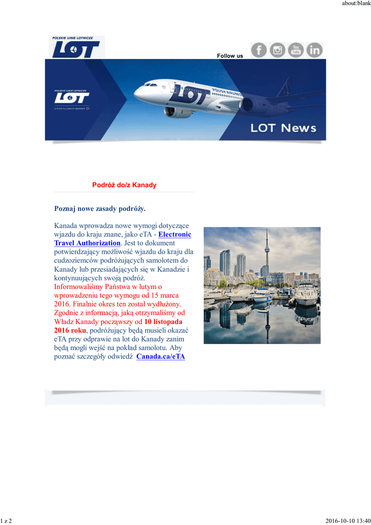 1z2 about:blank Follow us Podróż do/z Kanady Poznaj nowe zasady podróży. Kanada wprowadza nowe wymogi dotyczące wjazdu do kraju znane, jako eTA - Electronic Travel Authorization. Jest to dokument potwierdzający możliwość wjazdu do kraju dla cudzoziemców podróżujących samolotem do Kanady lub przesiadających się w Kanadzie i kontynuujących swoją podróż. Informowaliśmy Państwa w lutym o wprowadzeniu tego wymogu od 15 marca 2016. Finalnie okres ten został wydłużony. Zgodnie z informacją, jaką otrzymaliśmy od Władz Kanady począwszy od 10 listopada 2016 roku, podróżujący będą musieli okazać eTA przy odprawie na lot do Kanady zanim będą mogli wejść na pokład samolotu. Aby poznać szczegóły odwiedź Canada.ca/eTA 2016-10-10 13:40 2z2 about:blank 2016-10-10 13:40