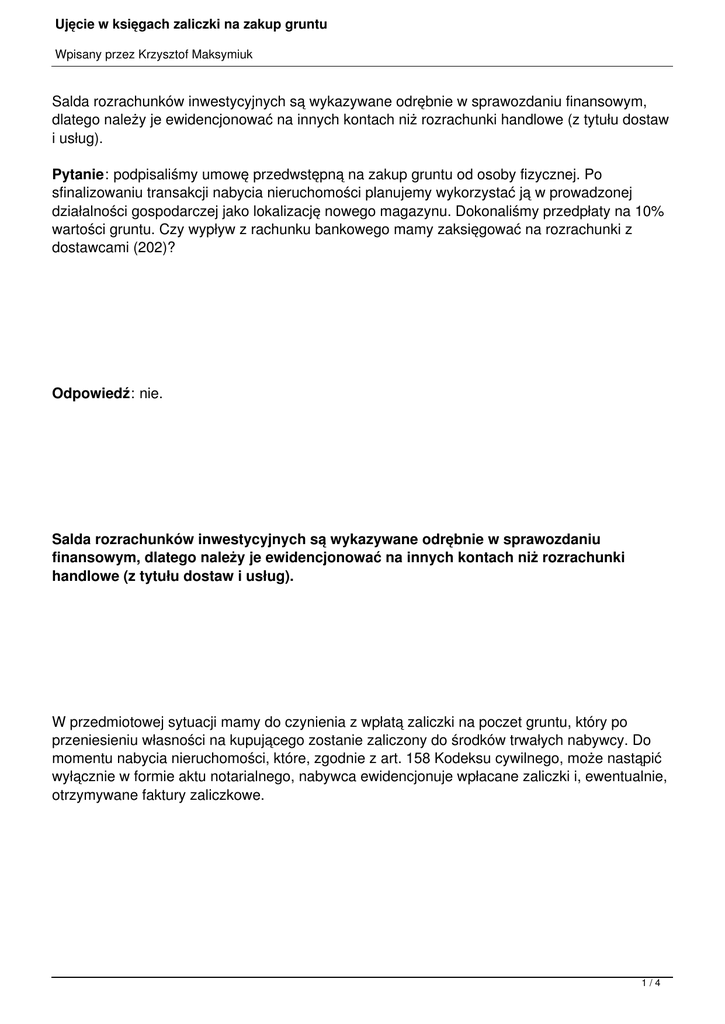 Ujęcie w księgach zaliczki na zakup gruntu Wpisany przez Krzysztof Maksymiuk Salda rozrachunków inwestycyjnych są wykazywane odrębnie w sprawozdaniu finansowym, dlatego należy je ewidencjonować na innych kontach niż rozrachunki handlowe (z tytułu dostaw i usług). Pytanie: podpisaliśmy umowę przedwstępną na zakup gruntu od osoby fizycznej. Po sfinalizowaniu transakcji nabycia nieruchomości planujemy wykorzystać ją w prowadzonej działalności gospodarczej jako lokalizację nowego magazynu. Dokonaliśmy przedpłaty na 10% wartości gruntu. Czy wypływ z rachunku bankowego mamy zaksięgować na rozrachunki z dostawcami (202)? Odpowiedź: nie. Salda rozrachunków inwestycyjnych są wykazywane odrębnie w sprawozdaniu finansowym, dlatego należy je ewidencjonować na innych kontach niż rozrachunki handlowe (z tytułu dostaw i usług). W przedmiotowej sytuacji mamy do czynienia z wpłatą zaliczki na poczet gruntu, który po przeniesieniu własności na kupującego zostanie zaliczony do środków trwałych nabywcy. Do momentu nabycia nieruchomości, które, zgodnie z art. 158 Kodeksu cywilnego, może nastąpić wyłącznie w formie aktu notarialnego, nabywca ewidencjonuje wpłacane zaliczki i, ewentualnie, otrzymywane faktury zaliczkowe. 1/4 Ujęcie w księgach zaliczki na zakup gruntu Wpisany przez Krzysztof Maksymiuk Wpłacona zaliczka powinna zostać ujęta w księgach w następujący sposób: Wn konto 24 „Pozostałe rozrachunki" Ma konto 13 „Rachunek bieżący". Sprzedawcą gruntu jest osoba fizyczna (w domyśle podmiot niebędący podatnikiem podatku od towarów i usług) co oznacza, że nabywca nie otrzyma od drugiej strony faktury VAT dokumentującej wpłatę zaliczki. Gdyby nabycie nastąpiło od podatnika VAT, to ewidencja faktury VAT wyglądałaby następująco: - kwota wpłaconej zaliczki (równa kwocie brutto na fakturze) Wn konto 30 „Rozliczenie zakupu" (analityka: „Zakupy inwestycyjne") Ma konto 24 „Pozostałe rozrachunki" - VAT wykazany na fakturze Wn konto 22 „Rozliczenie VAT naliczonego" Ma konto 30 „Rozliczenie zakupu" (analityka: „Zakupy inwestycyjne") Spółka, która przed nabyciem prawa własności gruntu wpłaciła zaliczkę i otrzymała fakturę dokumentującą to zdarzenie, może odliczyć podatek naliczony ujęty w fakturze zaliczkowej na zasadach ogólnych określonych w ustawie o podatku od towarów i usług. Jeżeli nabywca gruntu nie stosuje konta 30 „Rozliczenie zakupu", po otrzymaniu faktury 2/4 Ujęcie w księgach zaliczki na zakup gruntu Wpisany przez Krzysztof Maksymiuk zaliczkowej ewidencji podlega tylko kwota podatku VAT: Wn konto 22 „Rozliczenie VAT naliczonego" Ma konto 24 „Pozostałe rozrachunki". Saldo Wn konta 24 (lub 30) będzie wykazywało kwotę wpłaconej zaliczki na poczet przyszłej transakcji nabycia nieruchomości, przy czym w przypadku zawarcia transakcji z podatnikiem podatku od towarów i usług będzie to kwota netto zaliczki. W sytuacji, gdy na dzień bilansowy spółka nabywająca wykaże saldo Wn na koncie 24 (lub 30) należy je ująć w aktywach bilansu w pozycji A.II.3 „Zaliczki na środki trwałe w budowie". Wydaje się, że taka prezentacja w sprawozdaniu sporządzonym według ustawy o rachunkowości nie powinna budzić wątpliwości, jednak często błędna ewidencja zaliczek na poczet zakupów inwestycyjnych sprawia, że są one prezentowane w innych pozycjach bilansu, np. wśród zapasów („Zaliczki na dostawy") czy też należności („Należności z tytułu dostaw i usług"). Prawidłowa ewidencja ułatwia odpowiednią prezentację w sprawozdaniu finansowym. Odpowiednie ujmowanie zakupów inwestycyjnych ma także istotne znaczenie przy sporządzaniu rachunku przepływów pieniężnych. Zgodnie z wytycznymi Krajowego Standardu Rachunkowości nr 1 „Rachunek przepływów pieniężnych" są one prezentowane wśród przepływów z działalności inwestycyjnej. Co do zasady, zaliczki na zakup rzeczowych aktywów trwałych są ujmowane wśród wydatków w pozycji „Inne wydatki inwestycyjne", a zatem odrębnie od wydatków na nabycie rzeczowych aktywów trwałych pokazywanych jako „Nabycie wartości niematerialnych i prawnych oraz rzeczowych aktywów trwałych". 3/4 Ujęcie w księgach zaliczki na zakup gruntu Wpisany przez Krzysztof Maksymiuk Jednakże, jeżeli są spełnione trzy warunki: - kwota zaliczki jest znaczna, prawdopodobieństwo faktycznego nabycia - duże, termin realizacji - krótki, to standard zezwala na prezentację wydatkowych zaliczek w ww. pozycji dotyczącej nabycia składników majątkowych. Taka prezentacja zaliczek wymaga dodatkowo, w myśl standardu, ujawnienia w dziale 3 dodatkowych informacji i objaśnień wraz z podaniem kwoty zaliczki i terminu realizacji zakupu. 4/4