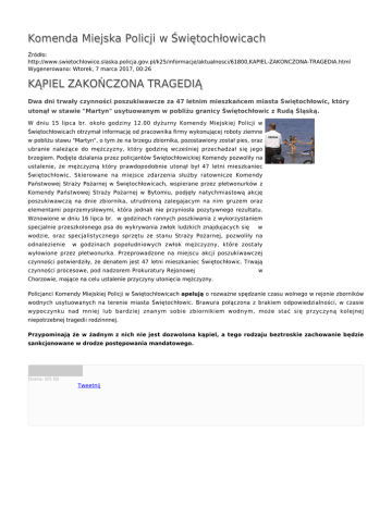 Komenda Miejska Policji w Świętochłowicach Źródło: http://www.swietochlowice.slaska.policja.gov.pl/k25/informacje/aktualnosci/61800,KAPIEL-ZAKONCZONA-TRAGEDIA.html Wygenerowano: Wtorek, 7 marca 2017, 00:26 KĄPIEL ZAKOŃCZONA TRAGEDIĄ Dwa dni trwały czynności poszukiwawcze za 47 letnim mieszkańcem miasta Świętochłowic, który utonął w stawie "Martyn" usytuowanym w pobliżu granicy Świętochłowic z Rudą Śląską. W dniu 15 lipca br. około godziny 12.00 dyżurny Komendy Miejskiej Policji w Świętochłowicach otrzymał informację od pracownika firmy wykonującej roboty ziemne w pobliżu stawu "Martyn", o tym że na brzegu zbiornika, pozostawiony został pies, oraz ubranie należące do mężczyzny, który godzinę wcześniej przechadzał się jego brzegiem. Podjęte dzialania przez policjantów Świętochłowickiej Komendy pozwoliły na ustalenie, że mężczyzną który prawdopodobnie utonął był 47 letni mieszkaniec Świętochłowic. Skierowane na miejsce zdarzenia służby ratownicze Komendy Państwowej Straży Pożarnej w Świętochłowicach, wspierane przez płetwonurków z Komendy Państwowej Straży Pożarnej w Bytomiu, podjęły natychmiastową akcję poszukiwawczą na dnie zbiornika, utrudnioną zalegajacym na nim gruzem oraz elementami poprzemysłowymi, która jednak nie przyniosła pozytywnego rezultatu. Wznowione w dniu 16 lipca br. w godzinach rannych poszkiwania z wykorzystaniem specjalnie przeszkolonego psa do wykrywania zwłok ludzkich znajdujacych się w wodzie, oraz specjalistycznego sprzętu ze stanu Straży Pożarnej, pozwoliły na odnalezienie w godzinach popołudniowych zwłok mężczyzny, które zostały wyłowione przez płetwonurka. Przeprowadzone na miejscu akcji poszukiwawczej czynności potwierdziły, że denatem jest 47 letni mieszkaniec Świętochłowic. Trwają czynności procesowe, pod nadzorem Prokuratury Rejonowej w Chorzowie, mające na celu ustalenie przyczyny utonięcia mężczyzny. Policjanci Komendy Miejskiej Policji w Świętochłowicach apelują o rozważne spędzanie czasu wolnego w rejonie zborników wodnych usytuowanych na terenie miasta Świętochłowic. Brawura połączona z brakiem odpowiedzialności, w czasie wypoczynku nad mniej lub bardziej znanym sobie zbiornikiem wodnym, może stać się przyczyną kolejnej niepotrzebnej tragedii rodzinnnej. Przypominają że w żadnym z nich nie jest dozwolona kąpiel, a tego rodzaju beztroskie zachowanie będzie sankcjonowane w drodze postępowania mandatowego. Ocena: 0/5 (0) Tweetnij