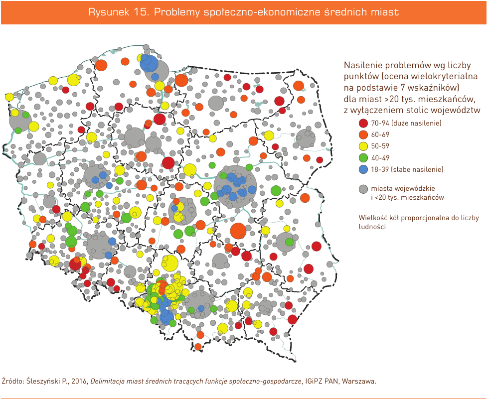 Rysunek 15. Problemy społeczno-ekonomiczne średnich miast Nasilenie problemów wg liczby punktów (ocena wielokryterialna na podstawie 7 wskaźników) dla miast >20 tys. mieszkańców, z wyłączeniem stolic województw 70-94 (duże nasilenie) 60-69 50-59 40-49 18-39 (słabe nasilenie) miasta wojewódzkie i <20 tys. mieszkańców Wielkość kół proporcjonalna do liczby ludności Źródło: Śleszyński P., 2016, Delimitacja miast średnich tracących funkcje społeczno-gospodarcze, IGiPZ PAN, Warszawa.