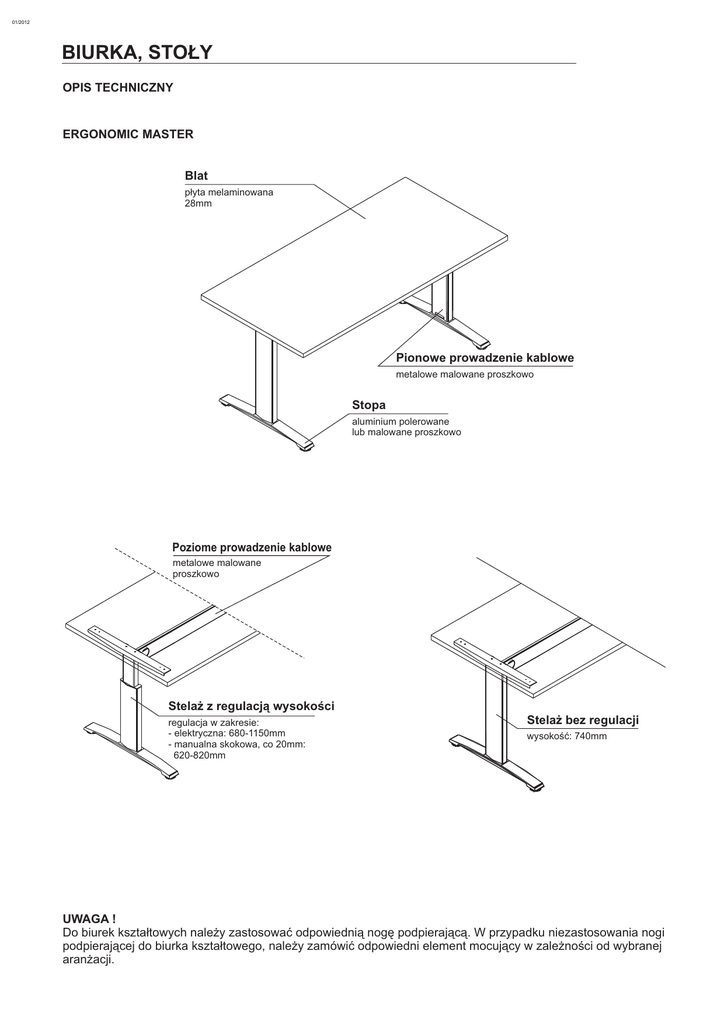 01/2012 BIURKA, STOŁY OPIS TECHNICZNY ERGONOMIC MASTER Blat . płyta melaminowana 28mm Pionowe prowadzenie kablowe . metalowe malowane proszkowo Stopa . aluminium polerowane lub malowane proszkowo Poziome prowadzenie kablowe . metalowe malowane proszkowo Stelaż z regulacją wysokości . regulacja w zakresie: - elektryczna: 680-1150mm - manualna skokowa, co 20mm: 620-820mm Stelaż bez regulacji . wysokość: 740mm UWAGA ! Do biurek kształtowych należy zastosować odpowiednią nogę podpierającą. W przypadku niezastosowania nogi podpierającej do biurka kształtowego, należy zamówić odpowiedni element mocujący w zależności od wybranej aranżacji. BIURKA, STOŁY OPIS TECHNICZNY BIURKO Z SZAFKĄ Blat . płyta melaminowana 28mm Wieniec górny . płyta melaminowana 28mm Szuflada z zamkiem . płyta melaminowana 18mm Front przesuwny płyta melaminowana 18mm Wnętrze Boki płyta melaminowana 18mm . płyta melaminowana 18mm Stopki aluminiowe STÓŁ KONFERENCYJNY Blat . płyta melaminowana 28mm Stopa . aluminium polerowane lub malowane proszkowo 28mm Stopa . aluminium polerowane lub malowane proszkowo