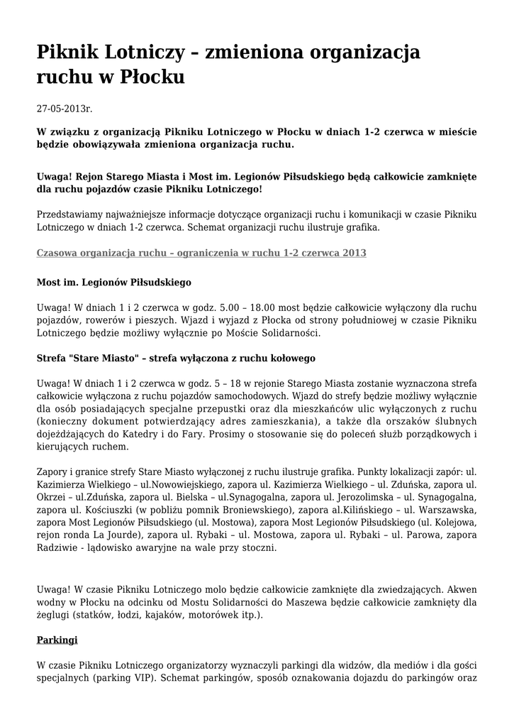 Piknik Lotniczy – zmieniona organizacja ruchu w Płocku 27-05-2013r. W związku z organizacją Pikniku Lotniczego w Płocku w dniach 1-2 czerwca w mieście będzie obowiązywała zmieniona organizacja ruchu. Uwaga! Rejon Starego Miasta i Most im. Legionów Piłsudskiego będą całkowicie zamknięte dla ruchu pojazdów czasie Pikniku Lotniczego! Przedstawiamy najważniejsze informacje dotyczące organizacji ruchu i komunikacji w czasie Pikniku Lotniczego w dniach 1-2 czerwca. Schemat organizacji ruchu ilustruje grafika. Czasowa organizacja ruchu – ograniczenia w ruchu 1-2 czerwca 2013 Most im. Legionów Piłsudskiego Uwaga! W dniach 1 i 2 czerwca w godz. 5.00 – 18.00 most będzie całkowicie wyłączony dla ruchu pojazdów, rowerów i pieszych. Wjazd i wyjazd z Płocka od strony południowej w czasie Pikniku Lotniczego będzie możliwy wyłącznie po Moście Solidarności. Strefa "Stare Miasto" – strefa wyłączona z ruchu kołowego Uwaga! W dniach 1 i 2 czerwca w godz. 5 – 18 w rejonie Starego Miasta zostanie wyznaczona strefa całkowicie wyłączona z ruchu pojazdów samochodowych. Wjazd do strefy będzie możliwy wyłącznie dla osób posiadających specjalne przepustki oraz dla mieszkańców ulic wyłączonych z ruchu (konieczny dokument potwierdzający adres zamieszkania), a także dla orszaków ślubnych dojeżdżających do Katedry i do Fary. Prosimy o stosowanie się do poleceń służb porządkowych i kierujących ruchem. Zapory i granice strefy Stare Miasto wyłączonej z ruchu ilustruje grafika. Punkty lokalizacji zapór: ul. Kazimierza Wielkiego – ul.Nowowiejskiego, zapora ul. Kazimierza Wielkiego – ul. Zduńska, zapora ul. Okrzei – ul.Zduńska, zapora ul. Bielska – ul.Synagogalna, zapora ul. Jerozolimska – ul. Synagogalna, zapora ul. Kościuszki (w pobliżu pomnik Broniewskiego), zapora al.Kilińskiego – ul. Warszawska, zapora Most Legionów Piłsudskiego (ul. Mostowa), zapora Most Legionów Piłsudskiego (ul. Kolejowa, rejon ronda La Jourde), zapora ul. Rybaki – ul. Mostowa, zapora ul. Rybaki – ul. Parowa, zapora Radziwie - lądowisko awaryjne na wale przy stoczni. Uwaga! W czasie Pikniku Lotniczego molo będzie całkowicie zamknięte dla zwiedzających. Akwen wodny w Płocku na odcinku od Mostu Solidarności do Maszewa będzie całkowicie zamknięty dla żeglugi (statków, łodzi, kajaków, motorówek itp.). Parkingi W czasie Pikniku Lotniczego organizatorzy wyznaczyli parkingi dla widzów, dla mediów i dla gości specjalnych (parking VIP). Schemat parkingów, sposób oznakowania dojazdu do parkingów oraz wzory przepustek ilustrują grafiki. Parking Centralny (ogólnodostępny płatny) – Lotnisko Aeroklubu ul. Bielska / Jędrzejewo Dla turystów i widzów, którzy planują dotrzeć na Piknik samochodami organizatorzy wyznaczyli Parking Centralny na terenie Lotniska Aeroklubu w rejonie ul. Bielskiej i Jędrzejewo. Z parkingu centralnego pod ratusz przy Pl. Stary Rynek będzie kursował w godz. 9-18 autobus wahadłowy z częstotliwością 20 minut. Koszt pozostawienia samochodu na parkingu centralnym + przejazd autobusem wahadłowym na trasie Lotnisko – Stary Rynek – Lotnisko (kierowca + pasażerowie) - 15 zł. Dojazd do Parkingu Centralnego będzie oznakowany specjalnymi znakami (grafika). Zalecany dojazd do parkingu CENTRALNEGO z kierunków: - Włocławek / Toruń: Na drodze 559 skręcamy w Srebrnej w lewo w kierunku wsi Biała, dalej przez miejscowości Stare Draganie, Trzepowo i ulicą Sierpecką w Płocku dojeżdżamy do ul. Bielskiej, na światłach skręcamy w prawo, 200m i lewo Parking Centralny. - Warszawa (sugerowana trasa przez Płońsk) dojazd przez miejscowości Góra, Staroźreby, w Ciółkowie skręcamy w prawo z DW 567 na DW 568, we wsi Goślice skrecamy w lewo na drogę DK 60, w Płocku wjazd bezpośrednio z ul. Bielskiej na Parking Centralny; - Warszawa (z kierunku Czerwińsk / Wyszogród) w Płocku na wysokości stacji paliw Orlen i DH. Panorama (ul. Wyszogrodzka) skręcamy w prawo w al. Armii Krajowej, dalej skrecamy w prawo w ul. Żyzną, na światłach prosto do ul. Bielskiej, tam skrecamy w lewo i dojazd bezposrednio do Parkingu Centralnego. - Łódź, Sochaczew, Gostynin: w Płocku DK 62 i DK 60 kierujemy się Trasą Popiełuszki na Most Solidarności, dalej na rondzie Wojska Polskiego skrecamy w prawo (kierunek Warszawa), na drugich światłach przy Galerii Wisła w lewo i dalej w prawo ul. Żyzną, na światłach prosto i dojeżdzamy do ul. Bielskiej, w lewo do Parkingu Centralnego. Parkingi dla gości specjalnych VIP i mediów Parkingi dla gości specjalnych (VIP) i mediów zostały wyznaczone w następujących miejscach: przy Hotelu Tumskim, przy Hotelu Starzyński, ul. Kościuszki, ul. Zduńska, ul. Teatralna, ul. Kazimierza Wielkiego. Wjazd na parking VIP jest możliwy wyłącznie dla osób posiadających przepustki i akredytowanych redakcji posiadających przepustki. Piknik Lotniczy – impreza masowa Piknik Lotniczy jest imprezą masową w rozumieniu Ustawy o bezpieczeństwie imprez masowych. Na terenie Pikniku będą wyznaczone strefy nieprzeznaczone dla publiczności, do których wstęp jest bezwzględnie zabroniony dla osób do tego nieuprawnionych. Prosimy o stosowanie się do poleceń i komunikatów służb porządkowych, Policji, Straży Miejskiej i oglądanie pokazów lotniczych wyłącznie w strefach do tego celu przeznaczonych dla publiczności. Strefę dla publiczności stanowi ciąg nadwiślańskich wzgórz, wznoszących się na wysokość około 50 m ponad poziom szerokiej na blisko kilometr Wisły. Ten naturalny amfiteatr, o długość ponad 2000m, okraszony zabytkami architektonicznymi z przestrzeni dziesięciu wieków Płocka, umożliwia komfortowe oglądanie pokazów lotniczych przez 100 000 widzów jednocześnie. Naturalne warunki ukształtowania terenu, dostępne są dla widzów dzięki systemowi schodów i tarasowych alejek. Wszystko to pozwala podziwiać akrobacje bez zadzierania głowy. op