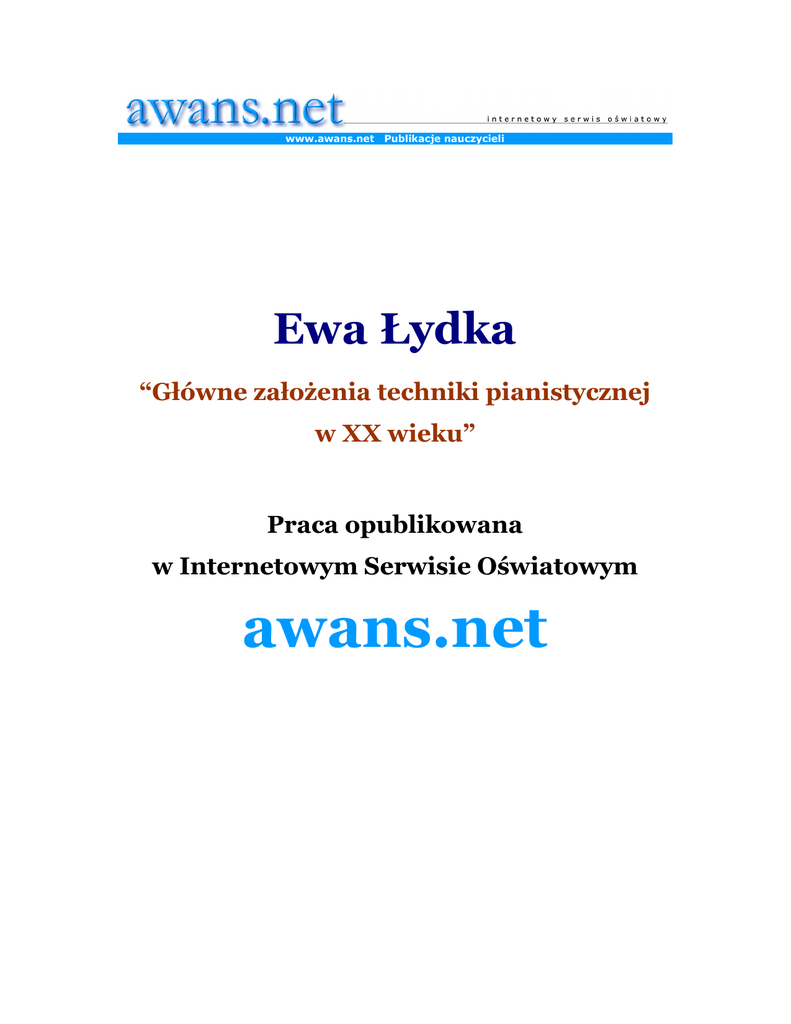 !" #$ % ! Słuchaj c dzisiejszych wykona pianistycznych młodych wirtuozów, zastanawiamy si jak daleko mo e si jeszcze rozwin Młodzi wykonawcy prezentuj technika wykonania i czy jest to mo liwe. utwory w perfekcyjnym wykonaniu tak pod wzgl dem wyrazowym, emocjonalnym jak i ci le technicznym. Przychodzi refleksja: jak wiczy by osi gn takie efekty? Oczywi cie wspaniałych i wybitnych wykonawców mo na było słysze odk d istniała muzyka. Jednak dzisiaj widzimy wielu bardzo młodych wykonawców, uczniów szkół II czy nawet I stopnia, którzy s ju dojrzałymi muzykami. Jak to si stało? Spróbujmy prze ledzi rozwój techniki pianistycznej w ostatnim stuleciu na podstawie rozpraw i przemy le trzech wybitnych pedagogów: Karola Leimera, Bronisława Po niaka i Marka Dy ewskiego. Karol Leimer (1858 - 1944) był wybitnym niemieckim pedagogiem gry na fortepianie. Jego najwybitniejszym uczniem był Walter Gieseking. Leimer napisał ksi k : Współczesna pianistyka. W swej ksi ce Leimer obja nia swój punkt wyj cia w sprawach techniki fortepianowej, a oto jego najwa niejsze cechy: 1. Zalecanie całkowitego rozlu nienia mi ni r k, jako tła dla wszystkich ruchów, składaj cych si na czynno gry na fortepianie. 2. Rozlu nienie mi ni winno by osi gane od wewn trz, bez stosowania jakich specjalnych ruchów rozlu niaj cych. Nale y o nim stale pami ta i rozlu nia w czasie gry mi nie r k tak cz sto, jak to tylko mo liwe. 3. Zaleca spokój ruchów, tzn. unikanie wszelkich ruchów, które w danym momencie nie s koniecznie potrzebne do wykonywania czynno ci gry. 4. da naturalnej pozycji palców na klawiszach tj. tylko lekkiego ich zgi cia, takiego jakie wyst puje przy swobodnym zwisaniu dłoni. Wa no tego podkre la zwłaszcza przy grze legato i kantyleny, gdzie zbyt silne zgi cie palców przeszkadzałoby działaniu subtelnych nerwów czuciowych, których najwi ksza ilo skupiona jest w płaskiej cz ci poduszeczek palców. XIX i pocz tek XX w. – to zwrócenie uwagi na mechaniczn i fizjologiczn stron uderzenia – wprowadzenie słuchu do techniki stanowiło nowo . Podstaw leimerowskiej metody nauczania jest wiczenie słuchu. Je eli chce si gra naprawd doskonale, stosownie do dzisiejszych wymaga , jak najwi cej uwagi i troski nale y po wi ci długo ci trwania d wi ku, jego sile i jako ci. Skrupulatne przestrzeganie tych zasad dotycz cych zło ono ci d wi ku sprawia to, i cało wykonania nabiera odpowiedniego charakteru. Jak wa n rzecz jest przestrzeganie tych zasad, niech wiadczy wypowied Giesekinga, któr umie cił w przedmowie do tej ksi ki, a która mówi, i „słuchanie samego siebie jest jednym z najwa niejszych czynników w nauce muzyki” i wykształcenie słuchu w tym kierunku jest podstawowym warunkiem czynienia szybkich post pów. Podstaw kształcenia słuchu jest jak najdokładniejsza znajomo utworu, a tak mo liwo pami do takiego rodzaju tekstu nutowego opracowywanego w pracy nad danym utworem daje bezbł dne opanowanie na tego tekstu ju w pierwotnym stadium pracy. Aby móc osi gn to w stosunkowo krótkim czasie, Leimer zaleca specjalny rodzaj wiczenia pami ci, który nazywa „refleksj ” czyli logicznym i systematycznym przemy leniem utworu. Ten rodzaj kształcenia pami ci zaleca stosowa i wymaga od pocz tkuj cych a nawet od dzieci, tzn. aby na ka d lekcj opanowywali w ten sposób dokładnie pami ciowo cho by tylko jeden czy dwa takty. Przez technik gry na instrumencie rozumiemy sprawne władanie palcami. Poj cie to jednak rozumiane jest na ogół w sposób bardzo ograniczony, gdy zazwyczaj pod miano techniki podci ga si poj cie szybko ci palców, biegło ci w wykonywaniu trudnych pasa ów oraz pewno ci w trafianie w dane klawisze. Leimer w swoim dziele podkre la, i pierwszym czynnikiem prowadz cym do uzyskania techniki jest pami ciowe opanowanie tekstu nutowego danego utworu, czego dokonujemy na drodze pracy umysłowej, a nast pnie rozpoczynamy wiczenie, które ma na celu doskonalenie pod wzgl dem dynamiki, rytmu, palcowania, sposobu uderzenia. wiczenie takie przebiega w najdoskonalszy sposób i najszybciej prowadzi do celu przy intensywnej koncentracji wszystkich sił umysłowych, stanowi zatem wyt on prac umysłow . W pracy nad technik wielkie znaczenie ma wyrobienie poszczególnych palców (co nie pozostaje bez wpływu na sił d wi ku). Analizuj c kolejno uderzenia ka dego palca stwierdzamy, i kciuk uderza zbyt słabo na skutek swej pozycji w stosunku do dłoni, palce drugi i trzeci wydaj si zbyt mocne, czwarty – najsłabszy, a pi ty jako najkrótszy wymaga wi kszej energii przy uderzeniu. Osi gni cie równego uderzenia wszystkimi pi cioma palcami jest zadaniem trudnym i polega w znacznej mierze na prawidłowym wy wiczeniu słuchu w tym kierunku. Główn rzecz w pracy nad kształceniem techniki palcowej jest cierpliwo i ci gła koncentracja uwagi na pracy poszczególnych palców. Poczucie odpr enia wszystkich nie zatrudnionych przy grze mi ni r k, konsekwentna gra piano, wolne tempo – to pierwsze zadanie wicz cego. Spełniaj c powy sze zalecenia mo na pozna z jak sił ka dy poszczególny palec musi naciska klawisz i tym sposobem osi gnie si umiej tno palcami, co stanowi podstaw techniki. Reasumuj c wypowied prawidłowego władania Leimera: „Nieustanne wsłuchiwanie si w wydobywane d wi ki, kontrola nad cisło ci wykonania – oto droga, która musi zaprowadzi szybko i pewnie do naprawd precyzyjnej techniki. Palce słu głowie: wykonuj one to, co im głowa rozka e. Je eli wi c głowa, dzi ki dobrze wyszkolonemu słuchowi, wie dobrze, jaki rodzaj d wi ku ma wydoby , palec b dzie jej posłuszny. W ten sposób palce mog szybko rozwi zywa najtrudniejsze nawet techniczne problemy, je eli zwa a si przy tym na konieczne rozlu nienie mi ni. Rozlu nienie to jest dlatego tak wa ne, e tylko swobodna, odpr ona r ka zamienia bez przeszkód wychodz ce z głowy impulsy w ruchy palców”. A wi c nie mudne, wielogodzinne wiczenia wprawek, ale wyobra enie d wi ku i słuch wewn trzny s wg Leimera naj