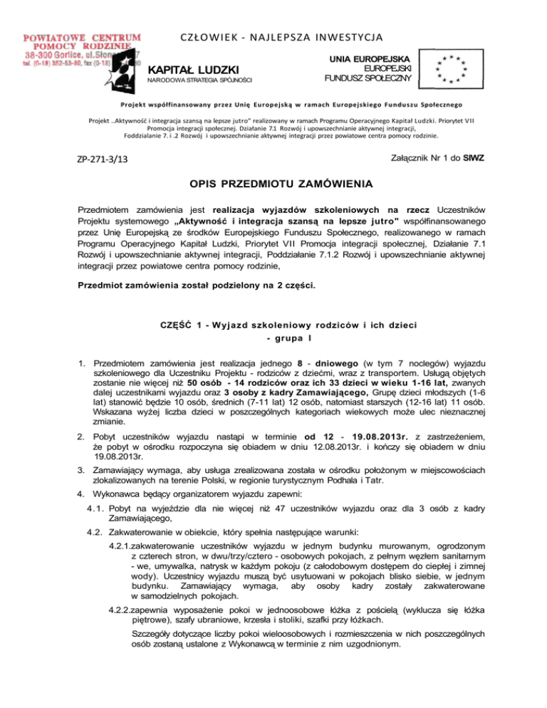 CZŁOWIEK - NAJLEPSZA INWESTYCJA UNIA EUROPEJSKA EUROPEJSKI FUNDUSZ SPOŁECZNY KAPITAŁ LUDZKI NARODOWA STRATEGIA SPÓJNOŚCI Projekt współfinansowany przez Unię Europejską w ramach Europejskiego Funduszu Społecznego Projekt ..Aktywność i integracja szansą na lepsze jutro" realizowany w ramach Programu Operacyjnego Kapitał Ludzki. Priorytet VII Promocja integracji społecznej. Działanie 7.1 Rozwój i upowszechnianie aktywnej integracji, Foddzialanie 7. i .2 Rozwój i upowszechnianie aktywnej integracji przez powiatowe centra pomocy rodzinie. ZP-271-3/13 Załącznik Nr 1 do SIWZ OPIS PRZEDMIOTU ZAMÓWIENIA Przedmiotem zamówienia jest realizacja wyjazdów szkoleniowych na rzecz Uczestników Projektu systemowego „Aktywność i integracja szansą na lepsze jutro" współfinansowanego przez Unię Europejską ze środków Europejskiego Funduszu Społecznego, realizowanego w ramach Programu Operacyjnego Kapitał Ludzki, Priorytet VII Promocja integracji społecznej, Działanie 7.1 Rozwój i upowszechnianie aktywnej integracji, Poddziałanie 7.1.2 Rozwój i upowszechnianie aktywnej integracji przez powiatowe centra pomocy rodzinie, Przedmiot zamówienia został podzielony na 2 części. CZĘŚĆ 1 - Wyjazd szkoleniowy rodziców i ich dzieci - grupa I 1. Przedmiotem zamówienia jest realizacja jednego 8 - dniowego (w tym 7 noclegów) wyjazdu szkoleniowego dla Uczestniku Projektu - rodziców z dziećmi, wraz z transportem. Usługą objętych zostanie nie więcej niż 50 osób - 14 rodziców oraz ich 33 dzieci w wieku 1-16 lat, zwanych dalej uczestnikami wyjazdu oraz 3 osoby z kadry Zamawiającego, Grupę dzieci młodszych (1-6 lat) stanowić będzie 10 osób, średnich (7-11 lat) 12 osób, natomiast starszych (12-16 lat) 11 osób. Wskazana wyżej liczba dzieci w poszczególnych kategoriach wiekowych może ulec nieznacznej zmianie. 2. Pobyt uczestników wyjazdu nastąpi w terminie od 12 - 19.08.2013r. z zastrzeżeniem, że pobyt w ośrodku rozpoczyna się obiadem w dniu 12.08.2013r. i kończy się obiadem w dniu 19.08.2013r. 3. Zamawiający wymaga, aby usługa zrealizowana została w ośrodku położonym w miejscowościach zlokalizowanych na terenie Polski, w regionie turystycznym Podhala i Tatr. 4. Wykonawca będący organizatorem wyjazdu zapewni: 4.1. Pobyt na wyjeździe dla nie więcej niż 47 uczestników wyjazdu oraz dla 3 osób z kadry Zamawiającego, 4.2. Zakwaterowanie w obiekcie, który spełnia następujące warunki: 4.2.1.zakwaterowanie uczestników wyjazdu w jednym budynku murowanym, ogrodzonym z czterech stron, w dwu/trzy/cztero - osobowych pokojach, z pełnym węzłem sanitarnym - we, umywalka, natrysk w każdym pokoju (z całodobowym dostępem do ciepłej i zimnej wody). Uczestnicy wyjazdu muszą być usytuowani w pokojach blisko siebie, w jednym budynku. Zamawiający wymaga, aby osoby kadry zostały zakwaterowane w samodzielnych pokojach. 4.2.2.zapewnia wyposażenie pokoi w jednoosobowe łóżka z pościelą (wyklucza się łóżka piętrowe), szafy ubraniowe, krzesła i stoliki, szafki przy łóżkach. Szczegóły dotyczące liczby pokoi wieloosobowych i rozmieszczenia w nich poszczególnych osób zostaną ustalone z Wykonawcą w terminie z nim uzgodnionym. 4.2.3 dysponuje: 4.2.3.1 dwiema wydzielonymi salami szkoleniowymi (na terenie ośrodka) przystosowanymi do przeprowadzenia warsztatów/zajęć dla dorosłych i dzieci uczestników wyjazdu (dwie grupy po ok. 15 osób każda), wyposażonymi w odpowiednią liczbę stolików i miejsc siedzących oraz w co najmniej flipchart, 4.2.3.2 jedną salą/pomieszczeniem wyposażonymi w odpowiednią liczbę stolików i miejsc siedzących, w której można prowadzić zajęcia dla dzieci, 4.2.3.3 placem zabaw / boiskiem lub innym miejscem (na terenie ośrodka lub w jego nieodległym położeniu), gdzie możliwe będzie prowadzenie zabaw / zajęć ruchowych dla dzieci młodszych. Zamawiający nie dopuszcza możliwości realizacji zajęć, o których mowa w ppkt 4.2.3.1 na stołówce /korytarzu/ pokoju hotelowym czy innym pomieszczeniu nie spełniającym w / w warunków. 4.3 całodzienne wyżywienie dla 47 uczestników wyjazdu oraz 3 osób kadry Zamawiającego, składające się z trzech posiłków: śniadanie, dwudaniowy obiad + deser (np. jogurt, owoc) i kolacja, z zastrzeżeniem, iż pobyt rozpoczyna i kończy się obiadem. Zamawiający wymaga, aby jedna z kolacji zorganizowana została w formie grilla/ogniska, na który/e Wykonawca zapewni wszystkim uczestnikom: kiełbaski, mięso typu drób, pieczywo, dodatki, w tym: ketchup, musztarda, warzywa, herbata - w tym owocowa, cytryna, cukier. Dodatkowo Wykonawca w trakcie przerw między zajęciami / spotkaniami / warsztatami realizowanymi w ramach wyjazdu zapewni Uczestnikom poczęstunek obejmujący - zamiennie co drugi poczęstunek - dla każdego uczestnika: 4.3.1 2 - 3 kromki chleba z: żółtym serem/wędliną, pastą rybną/jajkiem i ogórkiem/pomidorem, kawę rozpuszcza I ną, kawę parzoną, herbatę - przy czym dla dzieci owocową, cukier, śmietankę do kawy (w postaci płynnej), cytryny, lub 4.3.2 porcję świeżo pieczonego ciasta (np. szarlotka) / drożdżówka, kawę rozpuszczalną, kawę parzoną, herbatę - dla dzieci owocową, cukier, śmietankę do kawy (w postaci płynnej), cytryny, oraz 4.3.3 dostęp do napoi, w szczególności do wody mineralnej gazowanej i niegazowanej (do wyboru). Ponadto w trakcie wycieczki i podróży powrotnej, Wykonawca zapewni każdej osobie (osobie dorosłej i dziecku) suchy prowiant - 1 bułkę / kanapkę (z serem / wędliną oraz pomidorem / ogórkiem) oraz 0,5 I wody mineralnej gazowanej lub niegazowanej (do wyboru) słodki baton (z uwzględnieniem, iż dla małych dzieci ma być to baton łatwy do spożycia). W przypadku wyjścia na basen Wykonawca zapewni każdej dorosłej osobie słodki baton i 0,5 I wody mineralnej gazowanej lub niegazowanej (do wyboru), a każdemu dziecku 0,33 1100% soku naturalnego. W trakcie pobytu grupy w ośrodku 