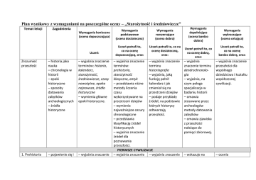 Plan wynikowy z wymaganiami na poszczególne oceny – „Starożytność i średniowiecze” Temat lekcji Zagadnienia Wymagania konieczne (ocena dopuszczająca) Uczeń: Zrozumieć przeszłość – historia jako nauka – chronologia w historii – epoki historyczne – sposoby datowania zabytków archeologicznych – źródła historyczne – wyjaśnia znaczenie terminów: historia, kalendarz, starożytność, średniowiecze, czasy nowożytne, epoka najnowsza, źródło historyczne – wymienia główne epoki historyczne. 1. Prehistoria – pojawienie się i – wyjaśnia znaczenie Wymagania podstawowe (ocena dostateczna) Wymagania rozszerzające (ocena dobra) Uczeń potrafi to, co na ocenę dopuszczającą, oraz: Uczeń potrafi to, co na ocenę dostateczną, oraz: – wyjaśnia znaczenie – wyjaśnia znaczenie terminów: terminu prehistoria, historiografia starożytność – wyjaśnia, jaką klasyczna, antyk funkcję pełnił – przedstawia różne kalendarz i jak metody liczenia zmieniał się na czasu przestrzeni dziejów wykorzystywane na – podaje przykłady przestrzeni dziejów źródeł, na podstawie – wymienia których historycy najważniejsze cezury odtwarzają chronologiczne przeszłość. – przedstawia klasyfikację źródeł historycznych – wyjaśnia znaczenie źródeł dla poznawania przeszłości. PIERWSZE CYWILIZACJE – wyjaśnia znaczenie – wyjaśnia znaczenie Wymagania dopełniające (ocena bardzo dobra) Uczeń potrafi to, co na ocenę dobrą, oraz: Wymagania wykraczające (ocena celująca) Uczeń potrafi to, co na ocenę bardzo dobrą, oraz: – wyjaśnia znaczenie terminu dendrochronologia – wyjaśnia, na czym polega specjalizacja w badaniu historii – omawia stosowane przez archeologów metody datowania zabytków – omawia zjawiska z przeszłości należące do pamięci zbiorowej. – wyjaśnia znaczenie przeszłości dla wspólnego dziedzictwa i kształtu współczesnej cywilizacji. – wskazuje na – ocenia 2. Mezopotamia i jej dzieje ewolucja człowieka – Karol Darwin i teoria ewolucji – Homo sapiens – chronologia pradziejów – człowiek w paleolicie – rewolucja neolityczna – sztuka prehistoryczna – najstarsze miasta – cywilizacje w dolinach wielkich rzek – powstanie cywilizacji terminu rewolucja neolityczna – wskazuje na mapie obszary cywilizacji powstałych w dolinach wielkich rzek – omawia cechy charakterystyczne i skutki rewolucji neolitycznej – omawia cechy charakterystyczne cywilizacji powstałych w dolinach wielkich rzek. – warunki naturalne Mezopotamii – wyjaśnia znaczenie terminów: Międzyrzecze, terminów: paleolit, neolit, Żyzny Półksiężyc, system irygacyjny – wskazuje na mapie zasięg Żyznego Półksiężyca – wymienia cechy charakterystyczne człowieka rozumnego – przedstawia chronologię pradziejów – omawia przyczyny rewolucji neolitycznej – wyjaśnia rolę pierwszych miast – omawia przyczyny powstania cywilizacji w dolinach wielkich rzek – wymienia i omawia etapy powstania cywilizacji w dolinach wielkich rzek. – wyjaśnia znaczenie terminów: zikkurat, imperium, Babilon, terminów: teoria kreacjonizmu, ewolucja, antropologia, epoka lodowcowa, hominidy, megality, ideogram – identyfikuje postać Karola Darwina – wskazuje na mapie kierunki rozprzestrzeniania się człowieka współczesnego – omawia teorię Karola Darwina – wyjaśnia, na czym polegała ewolucja człowieka – opisuje tryb życia społeczeństw w paleolicie. mapie najstarsze miasta świata (Jerycho, Çatal Höyük) – wymienia etapy ewolucji człowieka i charakteryzuje poszczególne formy hominidów – opisuje cechy charakterystyczne sztuki prehistorycznej – opisuje cechy charakterystyczne najstarszych osad miejskich. kontrowersje związane z teorią Karola Darwina. – wyjaśnia znaczenie terminów: Akadowie, prawo – wyjaśnia znaczenie terminu Epos o Gilgameszu – wyjaśnia pochodzenie Sumerów – skąd pochodzili Sumerowie? – cywilizacja Sumerów – imperium Akadów – Babilonia i jej dzieje – Kodeks Hammurabiego – Asyria i jej dzieje – społeczeństwa i państwa Mezopotamii – wierzenia religijne i osiągnięcia cywilizacyjne ludów Mezopotamii – pismo klinowe – architektura i sztuka Mezopotamii Sumerowie, kodeks, Kodeks Hammurabiego, politeizm, pismo klinowe – identyfikuje postać Hammurabiego – wskazuje na mapie obszar Międzyrzecza – wymienia cechy charakterystyczne cywilizacji Sumerów – wyjaśnia znaczenie pisma dla rozwoju cywilizacji Mezopotamii. Asyria – zna daty: rozwoju cywilizacji Sumerów (IV–III tysiąclecie p.n.e.), spisania Kodeksu Hammurabiego (XVIII w. p.n.e.) – identyfikuje postać Sargona Wielkiego – wskazuje na mapie siedziby Sumerów, Babilon – opisuje warunki naturalne Mezopotamii – przedstawia panowanie Hammurabiego – omawia Kodeks Hammurabiego – wymienia cechy charakterystyczne państw i społeczeństw Mezopotamii – wymienia osiągnięcia cywilizacyjne ludów Międzyrzecza. talionu, muszkeni – identyfikuje postać Nabuchodonozora II – wskazuje na mapie Akad, Asyrię, największy zasięg państw: babilońskiego i asyryjskiego – omawia okoliczności powstania i cechy charakterystyczne imperium akadyjskiego – omawia kierunki ekspansji Babilonii i Asyrii – przedstawia okoliczności powstania oraz upadku imperiów: babilońskiego i asyryjskiego – opisuje wierzenia religijne ludów Mezopotamii – omawia architekturę i sztukę Mezopotamii. – zna czas rozwoju poszczególnych cywilizacji na terenie Mezopotamii oraz daty: zdobycia Babilonu przez Persów (539 r. p.n.e.), upadku Asyrii (614 r. p.n.e.) – identyfikuje postać Asurbanipala – wymienia etapy przemian politycznych na terenie Mezopotamii od IV do II tysiąclecia p.n.e. – omawia i ocenia politykę władców asyryjskich wobec podbitych ludów. – ocenia znaczenie Kodeksu Hammurabiego dla organizacji państwa i funkcjonowania społeczeństwa. 3. Cywilizacja egipska 