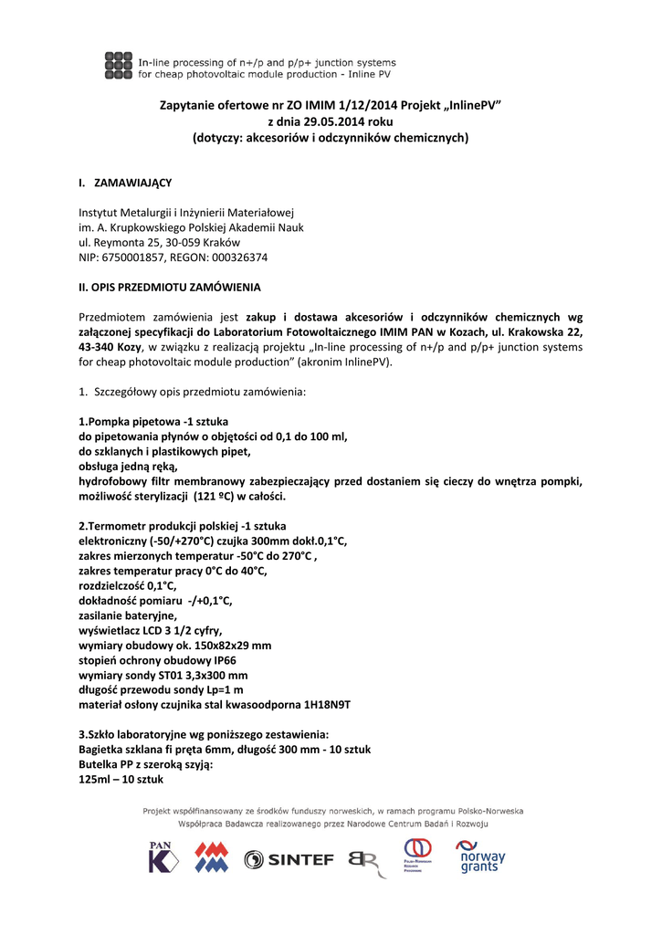 Zapytanie ofertowe nr ZO IMIM 1/12/2014 Projekt „InlinePV” z dnia