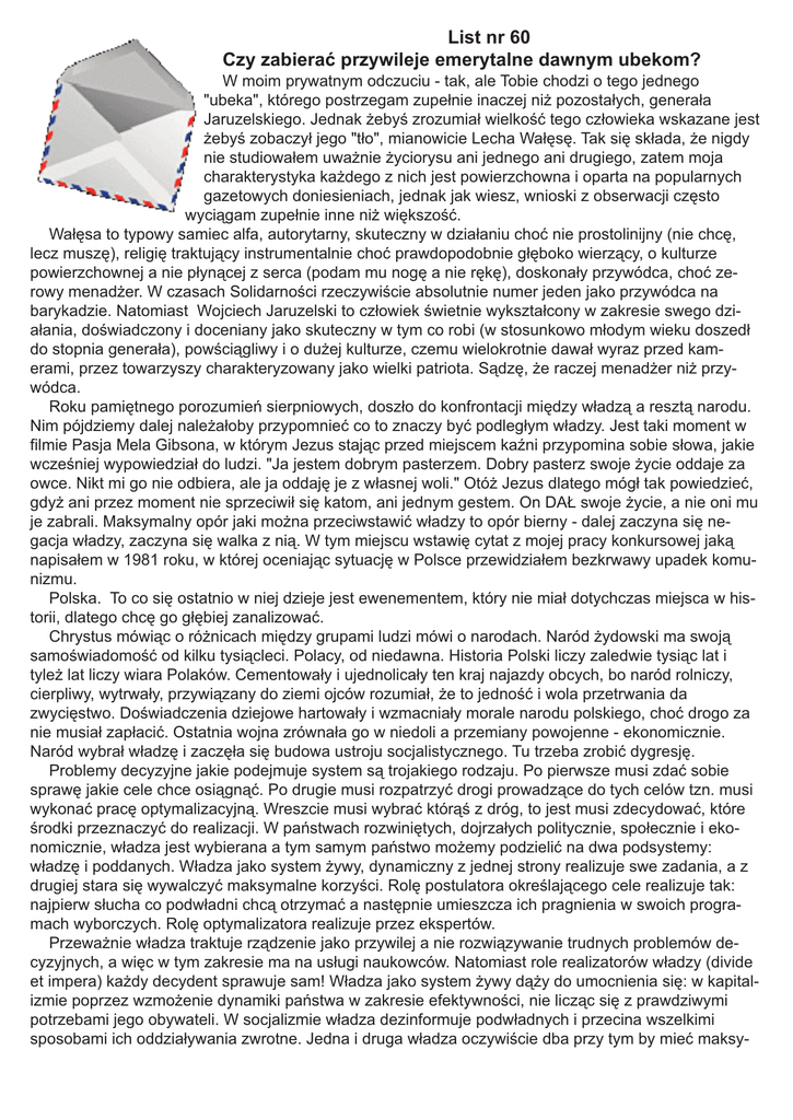 List nr 60 Czy zabierać przywileje emerytalne dawnym ubekom? W moim prywatnym odczuciu - tak, ale Tobie chodzi o tego jednego "ubeka", którego postrzegam zupełnie inaczej niż pozostałych, generała Jaruzelskiego. Jednak żebyś zrozumiał wielkość tego człowieka wskazane jest żebyś zobaczył jego "tło", mianowicie Lecha Wałęsę. Tak się składa, że nigdy nie studiowałem uważnie życiorysu ani jednego ani drugiego, zatem moja charakterystyka każdego z nich jest powierzchowna i oparta na popularnych gazetowych doniesieniach, jednak jak wiesz, wnioski z obserwacji często wyciągam zupełnie inne niż większość. Wałęsa to typowy samiec alfa, autorytarny, skuteczny w działaniu choć nie prostolinijny (nie chcę, lecz muszę), religię traktujący instrumentalnie choć prawdopodobnie głęboko wierzący, o kulturze powierzchownej a nie płynącej z serca (podam mu nogę a nie rękę), doskonały przywódca, choć zerowy menadżer. W czasach Solidarności rzeczywiście absolutnie numer jeden jako przywódca na barykadzie. Natomiast Wojciech Jaruzelski to człowiek świetnie wykształcony w zakresie swego działania, doświadczony i doceniany jako skuteczny w tym co robi (w stosunkowo młodym wieku doszedł do stopnia generała), powściągliwy i o dużej kulturze, czemu wielokrotnie dawał wyraz przed kamerami, przez towarzyszy charakteryzowany jako wielki patriota. Sądzę, że raczej menadżer niż przywódca. Roku pamiętnego porozumień sierpniowych, doszło do konfrontacji między władzą a resztą narodu. Nim pójdziemy dalej należałoby przypomnieć co to znaczy być podległym władzy. Jest taki moment w filmie Pasja Mela Gibsona, w którym Jezus stając przed miejscem kaźni przypomina sobie słowa, jakie wcześniej wypowiedział do ludzi. "Ja jestem dobrym pasterzem. Dobry pasterz swoje życie oddaje za owce. Nikt mi go nie odbiera, ale ja oddaję je z własnej woli." Otóż Jezus dlatego mógł tak powiedzieć, gdyż ani przez moment nie sprzeciwił się katom, ani jednym gestem. On DAŁ swoje życie, a nie oni mu je zabrali. Maksymalny opór jaki można przeciwstawić władzy to opór bierny - dalej zaczyna się negacja władzy, zaczyna się walka z nią. W tym miejscu wstawię cytat z mojej pracy konkursowej jaką napisałem w 1981 roku, w której oceniając sytuację w Polsce przewidziałem bezkrwawy upadek komunizmu. Polska. To co się ostatnio w niej dzieje jest ewenementem, który nie miał dotychczas miejsca w historii, dlatego chcę go głębiej zanalizować. Chrystus mówiąc o różnicach między grupami ludzi mówi o narodach. Naród żydowski ma swoją samoświadomość od kilku tysiącleci. Polacy, od niedawna. Historia Polski liczy zaledwie tysiąc lat i tyleż lat liczy wiara Polaków. Cementowały i ujednolicały ten kraj najazdy obcych, bo naród rolniczy, cierpliwy, wytrwały, przywiązany do ziemi ojców rozumiał, że to jedność i wola przetrwania da zwycięstwo. Doświadczenia dziejowe hartowały i wzmacniały morale narodu polskiego, choć drogo za nie musiał zapłacić. Ostatnia wojna zrównała go w niedoli a przemiany powojenne - ekonomicznie. Naród wybrał władzę i zaczęła się budowa ustroju socjalistycznego. Tu trzeba zrobić dygresję. Problemy decyzyjne jakie podejmuje system są trojakiego rodzaju. Po pierwsze musi zdać sobie sprawę jakie cele chce osiągnąć. Po drugie musi rozpatrzyć drogi prowadzące do tych celów tzn. musi wykonać pracę optymalizacyjną. Wreszcie musi wybrać którąś z dróg, to jest musi zdecydować, które środki przeznaczyć do realizacji. W państwach rozwiniętych, dojrzałych politycznie, społecznie i ekonomicznie, władza jest wybierana a tym samym państwo możemy podzielić na dwa podsystemy: władzę i poddanych. Władza jako system żywy, dynamiczny z jednej strony realizuje swe zadania, a z drugiej stara się wywalczyć maksymalne korzyści. Rolę postulatora określającego cele realizuje tak: najpierw słucha co podwładni chcą otrzymać a następnie umieszcza ich pragnienia w swoich programach wyborczych. Rolę optymalizatora realizuje przez ekspertów. Przeważnie władza traktuje rządzenie jako przywilej a nie rozwiązywanie trudnych problemów decyzyjnych, a więc w tym zakresie ma na usługi naukowców. Natomiast role realizatorów władzy (divide et impera) każdy decydent sprawuje sam! Władza jako system żywy dąży do umocnienia się: w kapitalizmie poprzez wzmożenie dynamiki państwa w zakresie efektywności, nie licząc się z prawdziwymi potrzebami jego obywateli. W socjalizmie władza dezinformuje podwładnych i przecina wszelkimi sposobami ich oddziaływania zwrotne. Jedna i druga władza oczywiście dba przy tym by mieć maksy- malne pożytki. Naród polski wielokrotnie wybierał władzę socjalistyczną i ... wielokrotnie przekonywał się, że coś nie jest w porządku. Najkrócej można to określić, iż władza nie spełnia pokładanych w niej nadziei, czyli programy nie są realizowane. Przyczyny tego zjawiska teoria systemów tłumaczy natychmiast: władza samoorganizuje się w system żywy i broni swych interesów walcząc z resztą narodu jak z wrogim środowiskiem. Ale dopóki podwładni przestrzegają reguł rytualizacji, walka jest ograniczona. Gdy podwładni, robotnicy, wychodzą na ulicę rytualizacja zostaje złamana, walka, sprzężenie dodatnie rozbieżne narasta i dochodzi do rozlewu krwi. Wówczas następuje we władzach zmiana ludzi najbardziej skompromitowanych tzn. "zabicie" głównych wrogów, a więc osiągnięte zostaje "zwycięstwo". Zaczyna się od nowa faza spokojnej walki zastępczej, zmagań zrytualizowanych, które trwają przez następne lata. I tak w Polsce odbyło się trzy razy. Ale świadomość ogółu społeczeństwa rośnie, rośnie świadomość walki społeczeństwa z władzą, tyle tylko, że za każdym razem jest to "zupełnie inna władza", bo bez tego odsunięcia winnych nie możnaby zastosować normującej ży