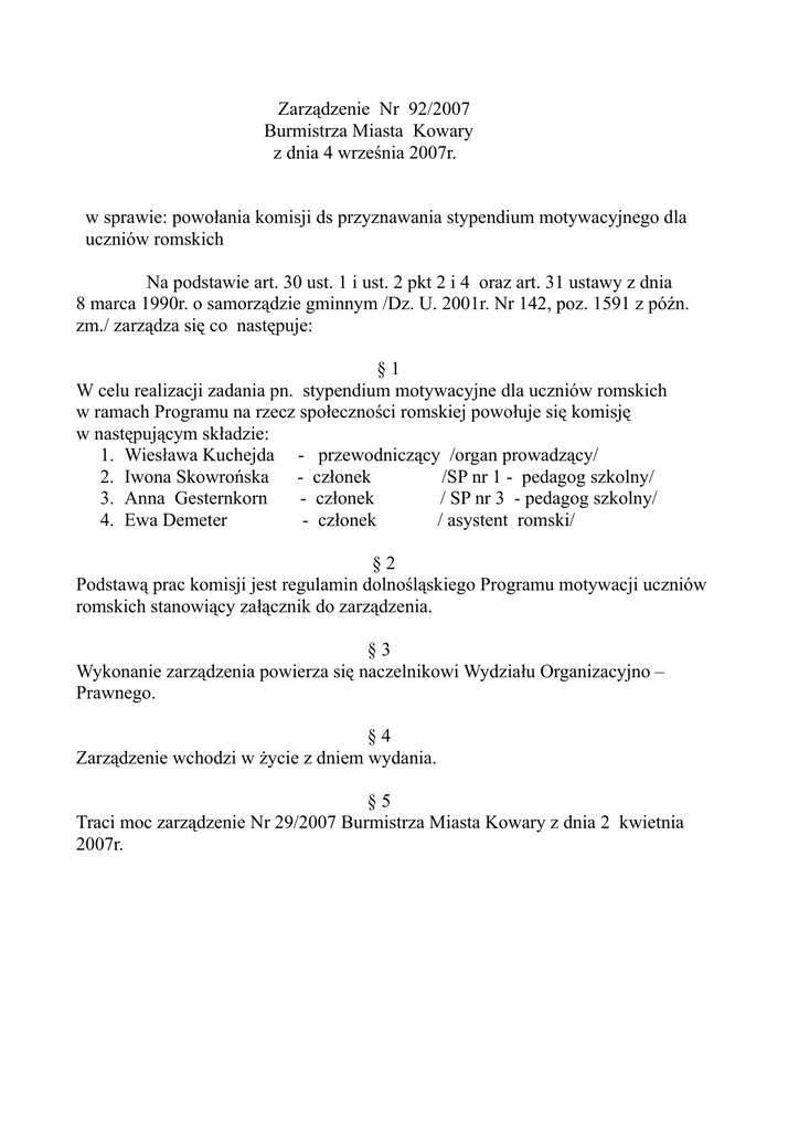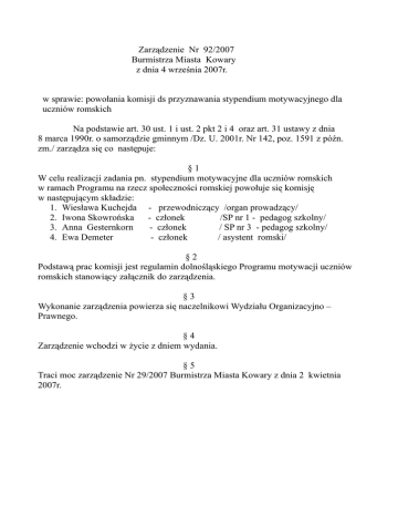 Zarządzenie Nr 92/2007 Burmistrza Miasta Kowary z dnia 4 września 2007r. w sprawie: powołania komisji ds przyznawania stypendium motywacyjnego dla uczniów romskich Na podstawie art. 30 ust. 1 i ust. 2 pkt 2 i 4 oraz art. 31 ustawy z dnia 8 marca 1990r. o samorządzie gminnym /Dz. U. 2001r. Nr 142, poz. 1591 z późn. zm./ zarządza się co następuje: §1 W celu realizacji zadania pn. stypendium motywacyjne dla uczniów romskich w ramach Programu na rzecz społeczności romskiej powołuje się komisję w następującym składzie: 1. Wiesława Kuchejda - przewodniczący /organ prowadzący/ 2. Iwona Skowrońska - członek /SP nr 1 - pedagog szkolny/ 3. Anna Gesternkorn - członek / SP nr 3 - pedagog szkolny/ 4. Ewa Demeter - członek / asystent romski/ §2 Podstawą prac komisji jest regulamin dolnośląskiego Programu motywacji uczniów romskich stanowiący załącznik do zarządzenia. §3 Wykonanie zarządzenia powierza się naczelnikowi Wydziału Organizacyjno – Prawnego. §4 Zarządzenie wchodzi w życie z dniem wydania. §5 Traci moc zarządzenie Nr 29/2007 Burmistrza Miasta Kowary z dnia 2 kwietnia 2007r. REGULAMIN Z DNIA 26 MARCA 2007 R. DOLNOŚLĄSKIEGO PROGRAMU MOTYWACJI UCZNIÓW ROMSKICH Projekt realizowany jest ze środków Programu na rzecz społeczności romskiej w Polsce oraz środków własnych JST. Jego celem jest mobilizacja rodzin romskich do zwrócenia większej uwagi na oceny uzyskiwane przez dzieci w szkole oraz aktywizacja uczniów romskich. 1. Projekt skierowany jest dla uczniów romskich: - szkół podstawowych (70 PLN/m-c) - gimnazjów (90 PLN/m-c) - szkół ponadgimnazjalnych (120 PLN/m-c) 2. Dodatek ten będzie wypłacany w okresie: - luty - czerwiec 2007 r. - wrzesień 2007 - styczeń 2008 r. 3. Środki będą. wypłacane w miesięcznych transzach, z tym, że pierwsza transza zostanie przekazana z chwilą otrzymania środków z budżetu państwa, z wyrównaniem licząc od lutego 2007 r. 4. Powyższy dodatek motywacyjny otrzymają uczniowie, którzy uzyskali najwyższą średnią ocen w I semestrze roku szkolnego 2006/2007. 5. Kolejne środki będą wypłacane od września 2007 r. uczniom, którzy uzyskali najwyższą średnią ocen w II semestrze roku szkolnego 2006/2007. 6. Warunkiem wypłacania w okresie wrzesień 2007 - styczeń 2008 r. dodatku motywacyjnego uczniom, którym był on wypłacany w okresie: luty - czerwiec 2007 r., niezbędne jest podwyższenie uzyskanej poprzednio średniej. 7. W przypadku identycznej średniej ocen uzyskanej przez dwu lub więcej uczniów, kolejnym kryterium wyboru będą: frekwencja, ocena z zachowania, opinia asystenta edukacji romskiej, pedagoga oraz sytuacja materialna rodziny, uwzględniająca m.in. liczbę dzieci w rodzinie. 8. Wyboru uczniów dokona komisja złożona z przedstawiciela wydziału oświaty, asystentów edukacji romskiej oraz pedagogów szkół, z których zostały zgłoszone dzieci z najwyższą średnią ocen, powołana zarządzeniem Prezydenta lub Burmistrza miasta. 9. Podczas posiedzenia komisji przedstawione kandydatury powinny być opatrzone hasłem, uniemożliwiającym identyfikację ucznia (imię i nazwisko oraz numer szkoły, do której uczęszcza). Identyfikacja ucznia następuje w przypadku kilku kandydatów o identycznej średniej ocen. 10. W przypadku wątpliwości dotyczących przyznania dodatku konieczna jest konsultacja zDUW.