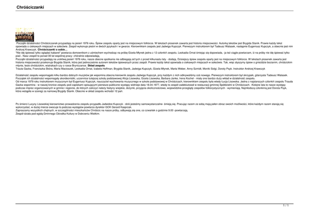 Chróściczanki Początki działalności Chróściczanek przypadają na jesień 1976 roku. Śpiew zespołu oparty jest na miejscowym folklorze. W tekstach piosenek zawarta jest historia miejscowości. Autorką tekstów jest Brygida Stanik. Prawie każdy tekst opowiada o ciekawych miejscach w sołectwie. Zespól wykonuje pieśni w dwóch językach i w gwarze. Kierownikiem zespołu jest Jadwiga Kupczyk. Pierwszym instruktorem był Tadeusz Walasek, następnie Eugeniusz Kupczyk, a obecnie jest nim Andrzej Krawczyk. Chróściczanki o sobie… "Nie idę śpiewać tylko oglądać kabaret" powtarza domownikom z uśmiechem wychodząc na próbę Gizela Młynek jedna z 12 członkiń zespołu. Leokadia Ornat śmiejąc się dopowiada, -ja też ciągle powtarzam, iż na próby nie idę śpiewać tylko piać-. Nasz zespół to ponad 30 lat wspólnej pracy- chóralnie odpowiadają. Początki działalności przypadają na urokliwą jesień 1976 roku, nasze obecne spotkania nie odbiegają od tych z przed kilkunastu laty - dodają. Dzisiejszy śpiew zespołu oparty jest na miejscowym folklorze. W tekstach piosenek zawarta jest historia miejscowości przekonuje Brygida Stanik, która jest jednocześnie autorem tekstów śpiewanych przez zespół. Prawie każdy tekst opowiada o ciekawych miejscach w sołectwie. Tak, więc słyszymy śpiew o gnieździe bocianim, chróścickim młynie, lesie chróścickim, wiatrakach czy o rzece Bryniczance. Skład zespołu Trauta Gacka, Franciszka Skóra, Maria Macioszek, Leokadia Ornat, Izabela Hoffman, Brygida Stanik, Jadwiga Kupczyk, Gizela Młynek, Marta Weber, Anny Szmidt, Moniki Solgi, Doroty Psyk. Instruktor Andrzej Krawczyk Działalność zespołu wspomagało kilku bardzo dobrych muzyków jak wspomina obecna kierownik zespołu Jadwiga Kupczyk, przy każdym z nich odkrywaliśmy coś nowego. Pierwszym instruktorem był skrzypek, gitarzysta Tadeusz Walasek. Początek ich działalności wspomagały akordeonistki, uczennice tutejszej szkoły podstawowej Alicja Lisowska, Gizela Lisowska, Barbara Janke, Irena Kochel - miały one bardzo duży wkład w działalność zespołu. Od marca 1979 roku instruktorem muzycznym był Eugeniusz Kupczyk, nauczyciel wychowania muzycznego w szkole podstawowej w Chróścicach, kierownikiem zespołu była wtedy Łucja Lisowska. Jedna z najstarszych członkiń zespołu Trauda Gacka wspomina - w naszej kronice zespołu pod zapiskami opisującymi pierwsze publiczne występy widnieje data 18.04.1977, wtedy to zespół zadebiutował w restauracji gminnej Spółdzielni w Chróścicach. -Kolejne lata to nasze występy podczas imprez organizowanych w gminie i regionie, do których zaliczyć należy festyny wiejskie, dożynki, przyjęcia okolicznościowe, wojewódzkie przeglądy zespołów folklorystycznych - wymieniają. Najmłodszą członkinią jest Dorota Psyk, która wstąpiła w szeregi za namową Brygidy Stanik. Obecnie w skład zespołu wchodzi 12 pań. Po śmierci Lucyny Lisowskiej kierownictwo prowadzenia zespołu przypadło Jadwidze Kupczyk - dziś jesteśmy samowystarczalne- śmieją się. Pracując razem ze sobą mają pełen obraz swoich możliwości, które każdym razem starają się wykorzystać, w dużej mierze owocuje to podczas występów powtarza dyrektor GOK Gerard Kasprzak. Zapraszamy wszystkich chętnych, w szczególności mieszkańców Chróścic na nasze próby, odbywają się one, co czwartek o godzinie 9.00 -powtarzają. Zespół działa pod egidą Gminnego Ośrodka Kultury w Dobrzeniu Wielkim. 1/1