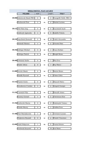SINGLE MATCH - PLAY 4.07.2015 POLAND HCP HCP ITALY 10:00 Sokolowski Marek PRO 0 vs 0 Passagrilli Rolfe PRO Piechowski Piotr 2 vs 0 Martini Luciano 0 vs 8 Kaczmarek Jacek Arabczyk Agnieszka 2 vs 0 Iradella Vittoria 10:24 Szperlinski Romuald 0 vs 10 Fedeli Alessandro Stolarski Mariusz 2 vs 0 Zorzetto Dino 10:36 Kobriger Michael 0 vs 2 Fusco Stefano Kobriger Patrick 0 vs 7 Borghi Bruno 10:48 Kołtuński Stefan 0 vs 7 Blus Ewa Dudek Adrian 0 vs 7 Roy Marco 11:00 Siwicki Marek 0 vs 2 Battisti Bruno 0 vs 5 Chines Fabio 0 vs 0 Mascioli Mario 4 vs 0 Gregorii Georgio 0 vs 7 Roncalli Arturo 2 vs 0 Christensen Kim 0 vs 17 Radomyski Tomasz 0 vs 3 Giabbai Enzo 11:48 Piotr Marcinkowski 2 vs 0 Terrinoni Luciano Wojtowicz Ryszard 0 vs 6 Proietti Vinceznzo Dudek Małgorzata 2 VS 0 Piantini Roberto Pawłowski Krzysztof 0 14 Este Mauro 10:12 Otto Hans Jorg Handke Ryszard 11:12 Piantini Giulio Szwabowicz Czesław 11:24 Czernicki Filip Kearney Gerrard 11:36 Kozłowski Maciej Pieński Maciej 12:00