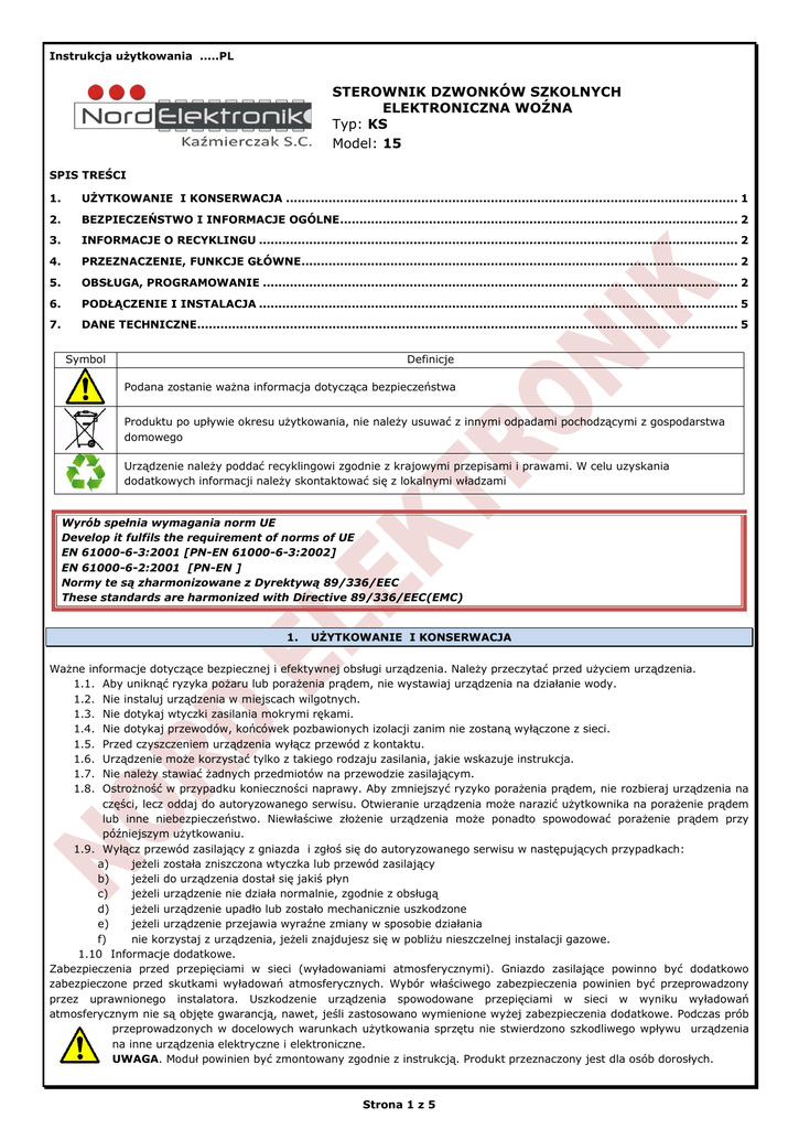 Instrukcja użytkowania .....PL STEROWNIK DZWONKÓW SZKOLNYCH ELEKTRONICZNA WOŹNA Typ: KS Model: 15 SPIS TREŚCI 1. UŻYTKOWANIE I KONSERWACJA ..................................................................................................................... 1 2. BEZPIECZEŃSTWO I INFORMACJE OGÓLNE ....................................................................................................... 2 3. INFORMACJE O RECYKLINGU ............................................................................................................................ 2 4. PRZEZNACZENIE, FUNKCJE GŁÓWNE ................................................................................................................. 2 5. OBSŁUGA, PROGRAMOWANIE ........................................................................................................................... 2 6. PODŁĄCZENIE I INSTALACJA ............................................................................................................................ 5 7. DANE TECHNICZNE............................................................................................................................................ 5 Symbol Definicje Podana zostanie ważna informacja dotycząca bezpieczeństwa Produktu po upływie okresu użytkowania, nie należy usuwać z innymi odpadami pochodzącymi z gospodarstwa domowego Urządzenie należy poddać recyklingowi zgodnie z krajowymi przepisami i prawami. W celu uzyskania dodatkowych informacji należy skontaktować się z lokalnymi władzami Wyrób spełnia wymagania norm UE Develop it fulfils the requirement of norms of UE EN 61000-6-3:2001 [PN-EN 61000-6-3:2002] EN 61000-6-2:2001 [PN-EN ] Normy te są zharmonizowane z Dyrektywą 89/336/EEC These standards are harmonized with Directive 89/336/EEC(EMC) 1. UŻYTKOWANIE I KONSERWACJA Ważne informacje dotyczące bezpiecznej i efektywnej obsługi urządzenia. Należy przeczytać przed użyciem urządzenia. 1.1. Aby uniknąć ryzyka pożaru lub porażenia prądem, nie wystawiaj urządzenia na działanie wody. 1.2. Nie instaluj urządzenia w miejscach wilgotnych. 1.3. Nie dotykaj wtyczki zasilania mokrymi rękami. 1.4. Nie dotykaj przewodów, końcówek pozbawionych izolacji zanim nie zostaną wyłączone z sieci. 1.5. Przed czyszczeniem urządzenia wyłącz przewód z kontaktu. 1.6. Urządzenie może korzystać tylko z takiego rodzaju zasilania, jakie wskazuje instrukcja. 1.7. Nie należy stawiać żadnych przedmiotów na przewodzie zasilającym. 1.8. Ostrożność w przypadku konieczności naprawy. Aby zmniejszyć ryzyko porażenia prądem, nie rozbieraj urządzenia na części, lecz oddaj do autoryzowanego serwisu. Otwieranie urządzenia może narazić użytkownika na porażenie prądem lub inne niebezpieczeństwo. Niewłaściwe złożenie urządzenia może ponadto spowodować porażenie prądem przy późniejszym użytkowaniu. 1.9. Wyłącz przewód zasilający z gniazda i zgłoś się do autoryzowanego serwisu w następujących przypadkach: a) jeżeli została zniszczona wtyczka lub przewód zasilający b) jeżeli do urządzenia dostał się jakiś płyn c) jeżeli urządzenie nie działa normalnie, zgodnie z obsługą d) jeżeli urządzenie upadło lub zostało mechanicznie uszkodzone e) jeżeli urządzenie przejawia wyraźne zmiany w sposobie działania f) nie korzystaj z urządzenia, jeżeli znajdujesz się w pobliżu nieszczelnej instalacji gazowe. 1.10 Informacje dodatkowe. Zabezpieczenia przed przepięciami w sieci (wyładowaniami atmosferycznymi). Gniazdo zasilające powinno być dodatkowo zabezpieczone przed skutkami wyładowań atmosferycznych. Wybór właściwego zabezpieczenia powinien być przeprowadzony przez uprawnionego instalatora. Uszkodzenie urządzenia spowodowane przepięciami w sieci w wyniku wyładowań atmosferycznym nie są objęte gwarancją, nawet, jeśli zastosowano wymienione wyżej zabezpieczenia dodatkowe. Podczas prób przeprowadzonych w docelowych warunkach użytkowania sprzętu nie stwierdzono szkodliwego wpływu urządzenia na inne urządzenia elektryczne i elektroniczne. UWAGA. Moduł powinien być zmontowany zgodnie z instrukcją. Produkt przeznaczony jest dla osób dorosłych. Strona 1 z 5 2. BEZPIECZEŃSTWO I INFORMACJE OGÓLNE 2.1. Nie montować urządzenia w pomieszczeniach o wysokiej temperaturze. Wysokie temperatury mogą być przyczyną uszkodzeń podzespołów elektronicznych, odkształceń lub stopienia elementów plastikowych. 2.2. Nie używać urządzenia w miejscach wilgotnych np.: łazienka, sauny parowe, może to spowodować pożar lub być przyczyną porażenia elektrycznego. 2.3. Urządzenie powinno być zawsze suche . Nie powinno być narażone na padające krople i bryzgi wodne. W przypadku zawilgocenia urządzenia może to spowodować uszkodzenie podzespołów elektronicznych. 2.4. Nie wkładać żadnych przedmiotów w otwory wentylacyjne, grozi to uszkodzeniem urządzenia. 2.5. Nie upuszczaj, nie uderzaj i nie potrząsaj urządzeniem. Nieostrożne obchodzenie się z nim może spowodować uszkodzenie podzespołów elektronicznych i delikatnych mechanizmów. 2.6. Do czyszczenia nie używać wody, chemikaliów, rozpuszczalników. Czyścić wilgotną ściereczką z dodatkiem detergentów. 2.7. Do czyszczenia reflektorów używaj miękkiej, czystej i suchej ściereczki. 2.8. W przypadku wydobywania się podejrzanego zapachu/dym/, odłączyć niezwłocznie od zasilania i skontaktować się ze sprzedawcą lub producentem. 2.9. Nie próbować samemu naprawiać urządzenia. Skontaktować się ze sprzedawcą lub producentem. 2.10. Serwis prowadzi producent: NORD ELEKTRONIK Kaźmierczak S.C., 76-200 Słupsk , ul. Mikołaja Reja 53, Tel./Fax. +48 59. 7272445, 697 697 381 serwis@ nordelektronik.pl Okres gwarancji wynosi 2 lata od daty zakupu w siedzibie Firmy NORD ELEKTRONIK Kaźmierczak S.C. W przypadku reklamacji, odpowiedzialność dotyczy wyłącznie produkowanych przez nas zestawów i podzespołów, a ni