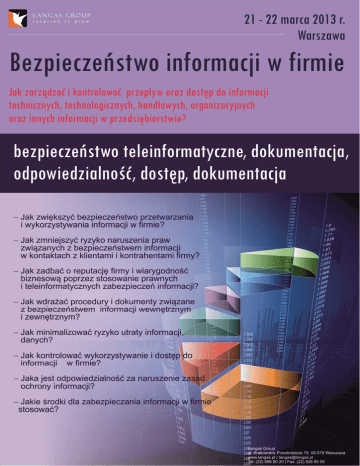Bezpieczeństwo informacji w firmie - Jak zarządzać i kontrolować przepływ oraz dostęp do informacji technicznych, technologicznych, handlowych, organizacyjnych oraz innych informacji w przedsiębiorstwie? bezpieczeństwo teleinformatyczne, dokumentacja, odpowiedzialność, dostęp, dokumentacja Szanowni Państwo, ujawnianie i udostępnianie informacji firmowych o różnym charakterze naraża niejednokrotnie przedsiębiorców na milionowe straty, upadek wizerunku, lub słabnące zaufanie ze strony kontrahentów. Niebezpieczeństwa naruszenia dóbr, wycieku informacji, czy nadużyć, zarówno wewnątrz, jak i na zewnątrz przedsiębiorstwa skłaniają do przyjrzenia się kwestii zabezpieczania informacji poprzez odpowiednie regulacje wewnętrzne, umowne z kontrahentami, oraz rozwiązania techniczno-informatyczne. Przygotowany program stanowi praktyczne ujęcie tematów wykorzystywania, przetwarzania, zabezpieczania i kontrolowania informacji w działalności firmy. Podczas szkolenia dowiesz się: OPINIE UCZESTNIKÓW SZKOLEŃ PROWADZONYCH PRZEZ DEDYKOWANYCH EKSPERTÓW: „Konkretnie, rzeczowo, ciekawie" - Magdalena Ciupak-Zarzycka, Specjalista ds. Komunikacji, JOHNSON And JOHNSON Poland Sp. z o.o. "Szkolenie bardzo interesujące, bardzo dobrze poprowadzone i zorganizowane" J- oann Król, Zastępca Kierownika ds. Marketingu i PR, INTER CARS SA "Szkolenie bardzo interesujące, dużo praktycznych porad prawnych" - Anna Lekarczyk, Aplikant Radcowski, Zakłady Azotowe w Tarnowie-Mościcach SA "Szkolenie odbyło się w bardzo miłej atmosferze. Bardzo merytorycznie i profesjonalnie przedstawiona wiedza. Zdecydowanie polecam wszystkim" Sebastian Dukla, Specjalista ds. Informatyki i Zasobu, Szczecińskie Centrum Renowacyjne Sp. z o.o. − Jakie rozwiązania i wymagania bezpieczeństwo informacji w firmie? − Jakie informacje przetwarzane w firmie podlegają ochronie i w jakim stopniu? − W jaki sposób przepisy prawne regulują bezpieczeństwo różnego rodzaju informacji w firmie? Eksperci: − Jak chronić informacje gospodarczych? MARCIN SERAFIN − W jaki sposób zabezpieczać wykorzystywanie osobowych oraz chronić prywatność? − W jaki sposób organizować i nadzorować bezpieczeństwo informacji niejawnych? − Jak zabezpieczać interesy firmy poprzez odpowiednie zapisy w umowach o poufności, w dokumentach przedkontraktowych, umowach międzynarodowych? − Jak bezpiecznie przetwarzać informacje związane z danymi osobowymi i tworzyć dokumentację? − Jak zabezpieczać ciągłość procesów i minimalizować ryzyko utraty informacji, danych? − Jak kontrolować wykorzystywanie i dostęp do informacji w firmie? − Jaka jest odpowiedzialność za naruszenie zasad ochrony informacji? − Jakie środki dla zabezpieczania informacji w firmie stosować? techniczne wewnętrzne i w wspierają kontraktach danych Szkolenie skierowane do: Dyrektorów i kierowników działów prawnych, Dyrektorów i menedżerów działów IT, Administratorów Bezpieczeństwa Informacji, Dyrektorów i Kierowników Administracyjnych, Specjalistów i pracowników działów prawnych, IT, biura zarządu, administracyjnych, sprzedaży Metodologia: Szkolenie ma charakter wykładowy połączony z dyskusjami grupowymi, ćwiczeniami, analizą dokumentów i zapisów kluczowych w zabezpieczaniu informacji w firmie. Prawnik; doświadczenie zawodowe wyniesione ze współpracy z kancelariami przekłada na praktyczne, wysoko oceniane zajęcia; Absolwent wydziału prawa Uniwersytetu Jagiellońskiego, specjalizuje się w prawie gospodarczym, prawie umów handlowych, prawie IT, prawie telekomunikacyjnym, prawie prasowym, prawie konsumenckim, prawie własności intelektualnej, prawie antymonopolowym i regulacyjnym. Zrealizował m.in. kilkadziesiąt projektów opracowania i negocjacji umów wdrożeniowych, obsługę prawną przetargów na świadczenie usług utrzymaniowych i outsourcingowych, kompleksową obsługę prawną programu transformacji IT. Specjalizuje się również w negocjowaniu umów licencyjnych i sprzedaży praw autorskich do oprogramowania. Uczestnik wielu sporów związanych z niewykonaniem umów IT, w tym procesów sądowych oraz międzynarodowych procesów arbitrażowych. Doradca klientów z branż: telekomunikacyjnej, energetycznej i paliwowej, bankowej, ubezpieczeniowej, farmaceutycznej, ochrony zdrowia, FMCG, usługowej, administracji publicznej. ROBERT PAJĄK CISSP, NGSEC CERT, AMBCI. Od 2000 roku pracuje jako dyrektor działu bezpieczeństwa INTERIA.PL S.A.; Współpracuje jako ekspert z licznymi firmami i organizacjami w kraju i zagranicą zajmującymi się szeroko pojętym bezpieczeństwem informacji; Komentuje dla stacji radiowych zjawiska związane ze współczesnymi zagrożeniami informatycznymi; Bezpieczeństwem komputerowym zajmuje się od czasów początku Internetu w Polsce. W latach 1998-2000 administrator bezpieczeństwa w KKI; Współzałożyciel polskiego oddziału ISSA, oraz polskiego oddziału OWASP, aktywnie działał w zarządzie oraz komisji rewizyjnej ISACA - Warsaw Chapter; Autor artykułów do rozlicznych gazet i poradników m.in. Bezpieczeństwo od A do Z. W przypadku jakichkolwiek pytań proszę o kontakt telefoniczny z zespołem Langas Group pod numerem telefonu (22) 696 80 20, lub za pomocą poczty elektronicznej: [email protected] Barbara Zielińska Kierownik Projektu Langas Group ul. Krakowskie Przedmieście 79, 00-079 Warszawa www.langas.pl | [email protected] Tel: (22) 696 80 20 | Fax: (22) 826 85 05 Bezpieczeństwo informacji w firmie - Jak zarządzać i kontrolować przepływ oraz dostęp do informacji technicznych, technologicznych, handlowych, organizacyjnych oraz innych informacji w przedsiębiorstwie? Bezpieczeństwo teleinformatyczne, dokumentacja, odpowiedzialność, dostęp, dokumentacja DZIEŃ I PRAWNE ASPEKTY OCHRONY INFORMACJI W FIRMIE KONTROLA NAD INFORMACJĄ W FIRMIE SYSTEM OCHRONY INFORMACJI W FIRMIE W jaki sposób nadzorować przepływ, dostęp i wykorzyst