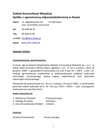 Zakład Komunikacji Miejskiej Spółka z ograniczoną odpowiedzialnością w Iławie adres: ul. Jagiellończyka 16, 14-200 Iława woj. warmińsko-mazurskie tel: 89 648 48 25 fax: 89 648 31 85 e-mail: [email protected] www: www.zkm.ilawa.pl ORGANY SPÓŁKI ZGROMADZENIE WSPÓLNIKÓW Funkcję Zgromadzenia Wspólników Zakładu Komunikacji Miejskiej Sp. z o.o. w Iławie pełni Burmistrz Miasta Iława. Zgodnie z art. 12 ust 4 ustawy z dnia 20 grudnia 1996r. o gospodarce komunalnej Dz.U.Nr 9 poz 43 z 1997r. z póź. zm. funkcję zgromadzenia wspólników w jednoosobowych spółkach jednostek samorządu terytorialnego pełnią organy wykonawcze tych jednostek samorządu terytorialnego. Stosownie do postanowień art. 26 ust 3 ustawy z 8 marca 1990r. o samorządzie gminnym (tekst jednolity Dz.U. Nr 142 poz 1591 z 2001r. z póź. zm)organem wykonawczym jest Burmistrz. RADA NADZORCZA 1. Waldemar Kowalski - Przewodniczący 2. Jadwiga Drzystek - Sekretarz 3. Anna Groszkowska-Wróbel - Członek ZARZĄD Andrzej Orzechowski - Prezes Zarządu 1 ORGANIZACJA ZAKŁADU SPÓŁKI Organizację Zakładu Komunikacji Miejskiej Sp. z o.o. określa regulamin organizacyjny w/g schematu: REGULAMIN ORGANIZACYJNY ZAKŁADU KOMUNIKACJI MIEJSKIEJ Spółka z o.o. w Iławie Regulamin organizacyjny Zakładu Komunikacji Miejskiej Spółka z o.o. w Iławie składa się z trzech części : Część I o b e j m u j e : 1. Charakterystykę Spółki. 2. Akt założycielski ZKM Sp. z o.o. w Iławie. Część II o b e j m u j e : 1. Wykaz organów Spółki, stanowisk kierowniczych, stanowisk nadzorujących, i podstawowych stanowisk pracowniczych. 2. Schemat organizacyjny Spółki. 3. Wykaz stanowisk pracy. 4. Zakresy czynności pracowników. Część III o b e j m u j e : Regulaminy wewnętrzne obowiązujące w Spółce. 2 Część I Charakterystyka Spółki 1. Nazwa Spółki : Zakład Komunikacji Miejskiej Spółka z o.o. w Iławie Skrót : ZKM Iława Sp. z o.o. 2. Adres Spółki : 14-200 Iława ul. Jagiellończyka 16 3. Numer w KRS: 0000082698 4. Telefon - centrala 89-648-48-25 Fax 89-648-31-85 5. ZKM Sp. z o.o. w Iławie rozpoczęła działalność od 01.01.2000r. powstała w wyniku likwidacji zakładu budżetowego - Zakładu Komunikacji Miejskiej. 6. Przedmiotem działalności Spółki jest: -transport lądowy pasażerski, miejski i podmiejski (PKD 49.31.Z) 7. Spółka prowadzi działalność na podstawie licencji nr 0000268 na wykonywanie krajowego transportu drogowego osób wydany na podstawie art. 7 ust. 2 pkt. 1 ustawy z dnia 6 września 2001 r o transporcie drogowym / Dz. U. Nr 125 poz. 1371/. 8. Porządek wewnętrzny w Spółce oraz związane z procesem pracy prawa i obowiązki pracowników oraz prawa i obowiązki pracodawcy określone są regulaminie pracy. 9. Zasady i warunki wynagradzania za pracę oraz pozostałe świadczenia związane z pracą i warunki ich przyznawania określa regulamin wynagradzania pracowników. 10. Pracownicy objęci są działalnością socjalną – zasady i wysokość dopłat określa regulamin ZFŚS. 11. Kapitał zakładowy Spółki wynosi 1.981.000 /jeden milion dziewięćset osiemdziesiąt jeden tysięcy/ i dzieli się na 1.981 /jeden tysiąc dziewięćset osiemdziesiąt jeden/ równych i niepodzielnych udziałów po 1000,00 /jeden tysiąc zł/ każdy. Wszystkie udziały objęła Gmina Miejska Iława pokrywając je aportem. 3 Część II Struktura organizacyjna spółki Wykaz organów Spółki, stanowisk kierowniczych, stanowisk nadzorujących i podstawowych stanowisk pracowniczych Władzami Spółki są : 1. Zgromadzenie Wspólników 2. Rada Nadzorcza 3. Zarząd. Kompetencje, sposób zwoływania oraz podejmowania uchwał organów Spółki reguluje akt założycielski oraz regulaminy. Zarząd - kieruje działalnością ZKM Sp. z o.o. w Iławie. jego skład powoływany i odwoływany jest przez Radę Nadzorczą kadencja Zarządu trwa trzy lata. na pierwsze dwie kadencje powoływano Zarząd jednoosobowyPrezes Zarządu. 1. Prezes Zarządu Spółki kieruje działalnością Spółki przez: 1. Głównego Księgowego 2. Starszego mistrza ds. eksploatacji 3. Starszego mistrza ds. technicznych Główny Księgowy realizuje zadania w zakresie : − prowadzenia ksiąg rachunkowych Spółki zgodnie z obowiązującymi przepisami, na podstawie dowodów księgowych, zdarzeń w porządku chronologicznym i systemowym zgodnie z przyjętymi zasadami (polityką) rachunkowości, − organizowania i doskonalenia systemu wewnętrznej informacji 4 − − − − − − − − − ekonomicznej Spółki, prawidłowego dysponowania środkami pieniężnymi zgromadzonymi na rachunku bankowym, okresowe ustalanie lub sprawdzanie drogą inwentaryzacji rzeczywistego stanu aktywów lub pasywów, wycena aktywów lub pasywów i ustalanie wyniku finansowego, sporządzanie sprawozdań finansowych, statystycznych, oraz na potrzeby organów Spółki, gromadzenie i przechowywanie dowodów księgowych oraz pozostałej dokumentacji przewidzianej ustawą, poddanie badaniu i ogłoszeniu sprawozdań finansowych zgodnie z ustawą o rachunkowości, sporządzanie deklaracji podatkowych / CIT, PIT, VAT / zgodnie z obowiązującymi terminami, kontrola i nadzór w prowadzeniu dokumentacji rozliczeniowej z ZUS i prawidłowe odprowadzanie składek, organizowanie pracy podległych pracowników. Głównemu Księgowemu podlegają następujące stanowiska pracy : 1/ bezpośrednio - Specjalista ds. ekonomicznych - kasjer 2/ pośrednio - Starszy mistrz ds. eksploatacji - Starszy mistrz ds. technicznych Specjalista ds. ekonomicznych - kasjer realizuje zadania dotyczące : − prowadzenie gospodarki biletowej /zamawianie, sprzedaż, bezpieczne przechowywanie/, − wystawianie faktur , paragonów, − inkasowanie należności za sprzedaż biletów, usług wynikających z umów itp., − odprowadzanie wpływów kasowych /przez upoważnionych konwojentów/ do banku, − kompletowanie dokumentów i obliczanie wynagrodzeń pracowniczych zatrudnionych wg um