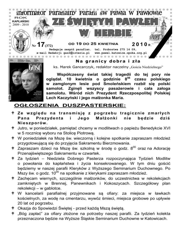 ROK KAPŁAŃSKI 2009 - 2010 Nr 17(372) OD 19 DO 25 KWIETNIA Redaguje zespół parafian. e-mail Redakcji [email protected] 2 0 1 0 R. tel. Probostwa 275 14 09, www.pawel.katowice.opoka.org.pl Na granicy dobra i zła ks. Marek Gancarczyk, redaktor naczelny „Gościa Niedzielnego” Współczesny świat takiej tragedii do tej pory nie oglądał. 10 kwietnia o godzinie 856 czasu polskiego w zamglonym lesie pod Smoleńskiem rozbił się polski samolot. Zginęli wszyscy pasażerowie i cała załoga samolotu. Wśród nich Prezydent Rzeczpospolitej Polskiej Lech Kaczyński i jego małżonka Maria. OGŁOSZENIA DUSZPASTERSKIE: Z e w z g l ę d u n a t r a n s m i s j ę z p o g r z e b u t r a g i c z n i e z m a r ł yc h Pana P r e z yd e n t a i Jego Małżonki nie będzie dziś N i e s z p o r ów . Jutro, w poniedziałek, pamiętać chcemy w modlitwach o papieżu Benedykcie XVI w 5 rocznicę wyboru na Stolicę Piotrową. W poniedziałek na Mszę św. wieczorną i kolejne spotkanie zapraszam młodzież przygotowującą się do przyjęcia Sakramentu Bierzmowania. Zapraszam dzieci na Mszę św. szkolną w środę o godz. 800 oraz na Adorację Przenajświętszego Sakramentu w czwartek. Za tydzień – Niedziela Dobrego Pasterza rozpoczynająca Tydzień Modlitw o powołania do kapłaństwa i życia konsekrowanego. W tym dniu gościć będziemy w naszej parafii Kleryków z Wyższego Seminarium Duchownego. Po Mszy św. o godz. 1000 na spotkanie z klerykami zapraszam młodzież. Zachęcam wiernych, szczególnie małżonków, do uczestnictwa w rekolekcjach zamkniętych w Brennej, Panewnikach i Kokoszycach. Szczegółowy plan rekolekcji – w gablotce. W kancelarii parafialnej przyjmowane są ofiary: za miejsca w ławkach kościelnych, za wodę na cmentarzu, wywóz śmieci, miejsca grobowe po upływie 20 lat od pogrzebu. Okazja do Spowiedzi Świętej - przed każdą Mszą świętą. „Bóg zapłać” za ofiary złożone na potrzeby naszej parafii. Za tydzień kolekta przeznaczona będzie na Wyższe Śląskie Seminarium Duchowne w Katowicach. INTENCJE MSZY św. od 19 do 25 kwietnia 2009 r. 19.IV g.1800 Koncelebra Poniedziałek - Z prośbą o Opiekę Bożą i Dary Ducha Świętego dla Anny Dzień wyboru Piechocińskiej z okazji 18 rocznicy urodzin, Benedykta VI na Papieża - Za + Felecję Sokol w 2 rocznicę śmierci oraz Ernesta Sokol w 22 rocznicę śmierci. 20.IV Wtorek g. 700 - Za ++ Annę i Pawła Kuczera, g.1800 - Za + Pawła Grelowskiego w 2 rocznicę śmierci. 21.IV Środa g. 800 Msza św. szkolna - Do Najświętszego Serca Pana Jezusa i Matki Bożej z podziękowaniem za odebrane łaski, z prośbą o Opiekę Bożą i zdrowie dla Anieli Świerk z okazji 50 rocznicy urodzin. 00 g.13 - Do Opatrzności Bożej i Matki Bożej z podziękowaniem za odebrane łaski, z prośbą o dalszą Opiekę Bożą i zdrowie dla małżonków Heleny i Henryka Skrzydło z okazji złotego wesela oraz o błogosławieństwo Boże dla rodziny. Wspomnienie św. Anzelma 22.IV Czwartek g. 700 - Za + Antoniego Fojt, po Mszy św. Adoracja Przenajświętszego Sakramentu 00 g.18 - Za Nikodema, rodziców, rodzeństwo Dudziński, braci, bratowe, pokrewieństwo Marcisz, Henryka Cybę oraz rodzinę Pryfke. 23.IV Piątek g. 700 - Za + Różę Waluszek w 7 rocznicę śmierci, g.1800 - Za ++ Józefa, Martę, Wiktora i Joachima Krusz, Gertrudę i Franciszka Krupka. Uroczystość św. Wojciecha głównego patrona Polski 24.IV Sobota Wspomnienie św. Fidelisa z Sigmaringen i św. Jerzego 25.IV 4 NIEDZIELA WIELKANOCNA g. 700 - Za + Jerzego Grzywocz w 5 rocznicę śmierci, g.1730 - Spowiedź święta g.1800 - Dziękczynno - błagalna w intencji Aleksandry i Józefa Rolnik. g. 630 Godzinki ku czci Matki Bożej, g. 700 - Za + Krystynę Kowolik w 8 rocznicę śmierci, g.1000 - Za roczne dziecko - Agatę Guza, za chrzestnych; z podziękowaniem za odebrane łaski, z prośbą o dalszą Opiekę Bożą dla Katarzyny i Leszka Guza w 10 rocznicę ślubu oraz dla syna. 30 g.16 Nieszpory g.1700 - Za + Jana Rzepka w 1 rocznicę śmierci.