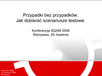 Przypadki bez przypadków. Jak dobierać scenariusze testowe. Konferencja SQAM 2008 Warszawa, 29. kwietnia Wojciech Pająk 29 kwietnia 2008 Warszawa Przypadki bez przypadku. Jak dobierać scenariusze testowe. Zagadnienia prezentacji 1. 2. 3. 4. 5. 6. 7. Wprowadzenie Definicje przypadków testowych Przypadek testowy jako źródło informacji Właściwości przypadków testowych Przypadki testowe a typy testów Kto stworzy najlepsze przypadki testowe? Podsumowanie Wojciech Pająk, 29. kwietnia 2008, Warszawa Konferencja SQAM 2008 Przypadki bez przypadku. Jak dobierać scenariusze testowe. Wprowadzenie • Przypadek testowy i jego charakter są zależne od rodzaju projektu, typu i fazy testowania. • Przypadek testowy pomaga nam zdobywać informacje. Dobór typów testów wpływa na rodzaj otrzymywanej informacji. • Przypadek testowy może być dobry w wielu aspektach, ale żaden nie będzie dobry we wszystkich jednocześnie. • Trzymanie się formalnych i powszechnie znanych definicji „przypadku testowego” jest niewystarczające dla zapewnienia procesu testowego na optymalnym poziomie. Wojciech Pająk, 29. kwietnia 2008, Warszawa Konferencja SQAM 2008 Przypadki bez przypadku. Jak dobierać scenariusze testowe. Przypadek testowy – definicje 1/2 • Zestaw danych wejściowych, warunków wykonania i spodziewanych rezultatów, przygotowanych w celu przetestowania programu lub weryfikacji zgodności z wymaganiami. (IEEE Std 610-1990) • Dokumentacja określająca dane wejściowe, spodziewane rezultaty oraz warunki wykonania testu. (IEEE Std 829-1983) Wojciech Pająk, 29. kwietnia 2008, Warszawa Konferencja SQAM 2008 Przypadki bez przypadku. Jak dobierać scenariusze testowe. Przypadek testowy – definicje 2/2 • Przypadki testowe są szczególnymi danymi wejściowymi, których używamy i procedurami, których przestrzegamy testując oprogramowanie. (Ron Patton, 2001) • A sequence of one or more subtests executed as a sequence because the outcome and/or final state of one subtest is the input and/or initial state of the next. The word ‘test’ is used to include subtests, tests proper, and test suites. (Boris Beizer, 1995) Wojciech Pająk, 29. kwietnia 2008, Warszawa Konferencja SQAM 2008 Przypadki bez przypadku. Jak dobierać scenariusze testowe. Cel testu – uzyskanie informacji • Przypadek testowy to pytanie, które zadajemy programowi aby uzyskać informację. Pytanie może być sformułowane na wiele sposobów, w zależności od tego, jaką informację chcemy uzyskać. • Konsekwencje powyższego założenia: • test musi być ZDOLNY do dostarczenia wartościowej informacji • ZAKRES informacji zmienia się wraz z „dojrzewaniem” systemu • METRYKI wykorzystujące ilość przypadków stają się bezużyteczne Wojciech Pająk, 29. kwietnia 2008, Warszawa Konferencja SQAM 2008 Przypadki bez przypadku. Jak dobierać scenariusze testowe. Co wpływa na jakość przypadków Właściwości Przypadków Testowych Cel Informacji Przypadki Testowe Style Testowania Rodzaje Testów Wojciech Pająk, 29. kwietnia 2008, Warszawa Konferencja SQAM 2008 Przypadki bez przypadku. Jak dobierać scenariusze testowe. Cele informacji 1/2 • Znalezienie błędów • Maksymalizacja liczby błędów • Wstrzymywanie kolejnych wersji systemu • Wsparcie szefów projektu w podjęciu decyzji o wstrzymaniu/wprowadzeniu systemu • Minimalizacja kosztów wsparcia technicznego • Ocena zgodności ze specyfikacją Wojciech Pająk, 29. kwietnia 2008, Warszawa Konferencja SQAM 2008 Przypadki bez przypadku. Jak dobierać scenariusze testowe. Cele informacji 2/2 • Dostosowanie do przepisów • Minimalizacja ryzyka prawnego • Znalezienie bezpiecznych scenariuszy użytkowania systemu • Ocena jakości • Weryfikacja poprawności systemu • Zapewnienie jakości Wojciech Pająk, 29. kwietnia 2008, Warszawa Konferencja SQAM 2008 Przypadki bez przypadku. Jak dobierać scenariusze testowe. Właściwości przypadków testowych 1/2 Przypadek testowy dostarczający informacji do osiągnięcia określonego celu, w odróżnieniu do typowego scenariusza powinien być: • bardziej skuteczny • przemyślany tak, dostarczał bardziej znaczących, lepszych wyników • bardziej autentyczny • bardziej prawdopodobny Wojciech Pająk, 29. kwietnia 2008, Warszawa Konferencja SQAM 2008 Przypadki bez przypadku. Jak dobierać scenariusze testowe. Właściwości przypadków testowych 2/2 • łatwiejszy do utrzymania • bardziej przydatny w rozwiązywaniu problemów • bardziej informacyjny • bardziej kompleksowy • bardziej pomocny testerowi, programiście w zrozumieniu różnych aspektów systemu lub profilu użytkownika Wojciech Pająk, 29. kwietnia 2008, Warszawa Konferencja SQAM 2008 Przypadki bez przypadku. Jak dobierać scenariusze testowe. Przypadki a rodzaje testów 1/2 • Testowanie funkcji • Testowanie domen • Testowanie oparte o specyfikacje • Testowanie oparte o ryzyko • Testowanie wydajnościowe Wojciech Pająk, 29. kwietnia 2008, Warszawa Konferencja SQAM 2008 Przypadki bez przypadku. Jak dobierać scenariusze testowe. Przypadki a rodzaje testów 2/2 • Testowanie regresyjne • Testowanie przez użytkowników • Testowanie scenariuszowe • Testowanie stanów • Przeciążeniowe testowanie automatyczne • Testowanie eksploracyjne Wojciech Pająk, 29. kwietnia 2008, Warszawa Konferencja SQAM 2008 Przypadki bez przypadku. Jak dobierać scenariusze testowe. Style testerów a tworzenie scenariuszy 1/3 • Tworzenie przypadków testowych wymaga odpowiednich cech i umiejętności • W zależności od typu projektu, testerzy o określonym stylu będą tworzyli lepsze scenariusze • Style testerów (Lloyd Roden, Grove Consultants) PRAGMATYK PIONIER ANALITYK FACILITATOR • Testerzy o stylu pionierskim i analitycznym posiadają szczególne predyspozycje do tworzenia przypadków testowych Wojciech Pająk, 29. kwietnia 2008, Warszawa Konferencja SQAM 2008 Przypadki bez przypadku. Jak do