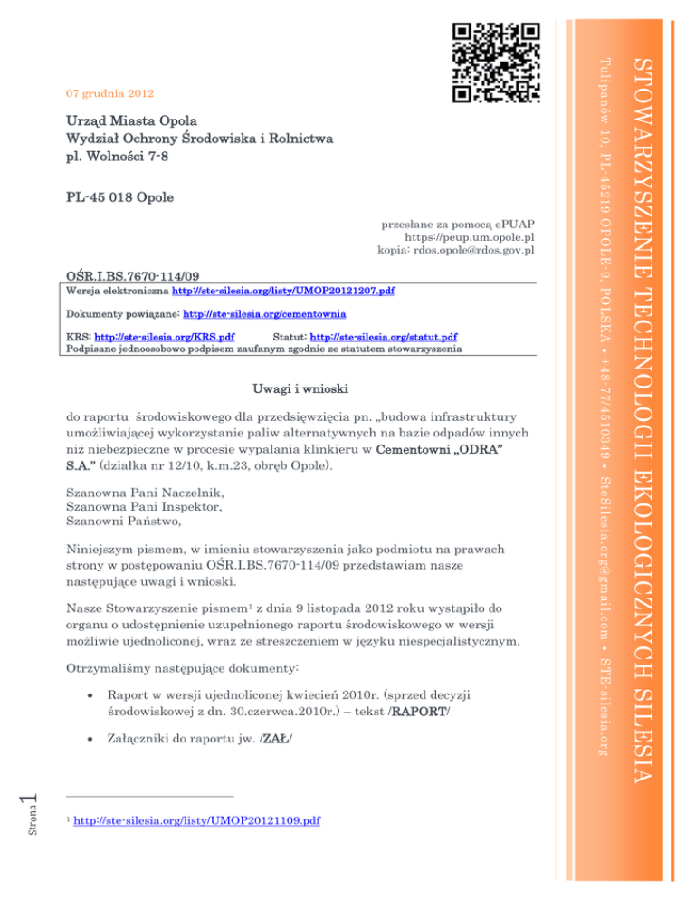 PL-45 018 Opole przesłane za pomocą ePUAP https://peup.um.opole.pl kopia: [email protected] OŚR.I.BS.7670-114/09 Wersja elektroniczna http://ste-silesia.org/listy/UMOP20121207.pdf Dokumenty powiązane: http://ste-silesia.org/cementownia Niniejszym pismem, w imieniu stowarzyszenia jako podmiotu na prawach strony w postępowaniu OŚR.I.BS.7670-114/09 przedstawiam nasze następujące uwagi i wnioski. Raport w wersji ujednoliconej kwiecień 2010r. (sprzed decyzji środowiskowej z dn. 30.czerwca.2010r.) – tekst /RAPORT/ Załączniki do raportu jw. /ZAŁ/ Strona 1 1 http://ste-silesia.org/listy/UMOP20121109.pdf STE-silesia.org Otrzymaliśmy następujące dokumenty: Nasze Stowarzyszenie pismem1 z dnia 9 listopada 2012 roku wystąpiło do organu o udostępnienie uzupełnionego raportu środowiskowego w wersji możliwie ujednoliconej, wraz ze streszczeniem w języku niespecjalistycznym. [email protected] Szanowna Pani Naczelnik, Szanowna Pani Inspektor, Szanowni Państwo, do raportu środowiskowego dla przedsięwzięcia pn. „budowa infrastruktury umożliwiającej wykorzystanie paliw alternatywnych na bazie odpadów innych niż niebezpieczne w procesie wypalania klinkieru w Cementowni „ODRA” S.A.” (działka nr 12/10, k.m.23, obręb Opole). +48-77/4510349 Uwagi i wnioski KRS: http://ste-silesia.org/KRS.pdf Statut: http://ste-silesia.org/statut.pdf Podpisane jednoosobowo podpisem zaufanym zgodnie ze statutem stowarzyszenia STOWARZYSZENIE TECHNOLOGII EKOLOGICZNYCH SILESIA Urząd Miasta Opola Wydział Ochrony Środowiska i Rolnictwa pl. Wolności 7-8 Tulipanów 10, PL-45219 OPOLE-9, PO LSKA 07 grudnia 2012 Uzupełnienie na wezwanie Prezydenta Miasta (warianty oraz zgodność z BAT– z dn. 06.09.2011r (po SKO). /ZAŁ2/ Uzupełnienie na wezwanie Prezydenta Miasta (wyliczenie oddziaływania skumulowanego ODRA, PGE ELO, ECO) – z dn. 02.12.2011r (po SKO). /ZAŁ3/ Uzupełnienie na wezwanie Prezydenta Miasta (opis metod obniżenia emisji NOx) – z dn. 02.12.2011 (po SKO). /ZAŁ4/ STRESZCZENIE niespecjalistyczne po uzupełnieniach i wyjaśnieniach 2011r./ZAŁ5/ Uzupełnienie na wezwanie RDOŚ (opis aktualnych wariantów) - z dn. 14.06.2012r. /ZAŁ6/. Uzupełnienie na wezwanie RDOŚ (nadesłanie decyzji MOS z dnia 27. 09. 2012 w sprawie PZ) - z dn. 27.09.2012r. /ZAŁ7/. Już powyższe wyliczenie wskazuje, że raport środowiskowy stanowi w istocie konglomerat różnych dokumentów, merytorycznie niekiedy wzajemnie się wykluczających: Dokumenty z roku 2010 i 2011 (Raport i zał1-5) dotyczą innej instalacji i innych wariantów, niż jest to przyjęte w rzeczywistości. Cementownia Odra SA: a. wymieniła już odpylacz elektrostatyczny na filtr workowy KJCW 35/07-81.1/60 o powierzchni roboczej 3206 m2 b. zainstalowała nowy palnik niskoemisyjny firmy Uniterm M.A.S. 2 KO/SO/X, który już potrafi w maksymalnym2 stopniu zmniejszyć emisję tlenków azotu NOx c. posiada nowe pozwolenie zintegrowane dla współspalania odpadów ważne od dnia 30 czerwca 2012 roku d. przedstawiła inne warianty w uzupełnieniach, niż we właściwym wniosku, Dodatkowo należy stwierdzić, że od 1 stycznia 2013 roku najprawdopodobniej wejdzie w życie na skutek nowelizacji ustawy poś nowe3 rozporządzenia w sprawie standardów emisyjnych z instalacji, gdzie wprowadza się nowe ograniczenie dla tlenków węgla ( maks. 150 mg CO/Nm3 -§ 29 projektu rozporządzenia) i tlenków azotu ( maks 500 mg NOx/Nm3 – zał. 8 projektu rozporządzenia). W roku 2012 cementownia na skutek zmiany sposobu odpylania i palnika emituje inne ilości pyłu oraz tlenków azotu. Zgodnie ze streszczeniem w języku niespecjalistycznym (wymóg z art. 66 uooś) mowa jest o redukcji emisji pyłu o dokładnie 28,66% , zaś redukcja emisji tlenków Zgodnie z danymi z Cement International 1/2004 do 30-50% emisji pierwotnej na skutek maksymalnie krótkiego punktu zapłonu i stabilnego płomienia palnika: http://www.unitherm.co.at/bilder/documents_pdf/Cement%20International%2012004%20MAS%20burner%20study.pdf Strona 2 2 Projekt z serwisu RCL.gov.pl ( str. 70 ) http://legislacja.rcl.gov.pl/docs//515/79384/79386/79387/dokument55255.pdf?lastUpdateDay=06.12.12&l astUpdateHour=6%3A28&userLogged=false&date=pi%C4%85tek%2C+7+grudzie%C5%84+2012 3 azotu przewidziana jest na 36,8 % (ZAŁ5). Nie zostało jednak odpowiedziane na pytanie, czy w/w redukcja emisji pozwoli na dotrzymanie norm emisyjnych po 1 stycznia 2013 roku ani jakie są to wielkości w liczbach rzeczywistych. W ZAŁ4 przedstawiono całą listę możliwych działań w celu zmniejszenia emisji tlenków azotu. W konkluzjach Prezes Zarządu Cementowni Odra SA sugeruje, że w przypadku współspalania odpadów i przekroczenia emisji NOx powyżej 500 mg NOx/Nm3 zakład będzie starał się wybudować instalację SNCR (selektywna niekatalityczna redukcja NOx) oraz układ prekalcynacji (wstępnej dekarbonizacji). Zauważyć należy, że taki zapis jest niedopuszczalny w postępowaniu środowiskowym. Inwestor musi zagwarantować, że obowiązujące normy emisyjne zostaną dotrzymane. Z oświadczenia inwestora wynika jednak, że najpierw chcą oni „na próbę” spalać odpady, zebrać w ten sposób doświadczenie, zmierzyć rzeczywiste emisje i dopiero w przypadku przekroczenia norm dla np. NOx planować kolejne inwestycje, np. w instalację SNCR czy wstępnej dekarbonizacji. W głównym raporcie oraz w przedstawianych (starych i nowych) wariantach nie ma jednak opisu tych zamierzeń inwestycyjnych, nie wiadomo jaki będzie ich wpływ na środowisko oraz na statut zakładu jako zakładu o podwyższonym ryzyku wystąpienia poważnej awarii przemysłowej (na skutek magazynowania wody amoniakalnej lub amoniaku dla instalacji SNCR). Inwestor w ZAŁ6 otwarcie pisze, że wnosi o zmianę zapisów raportu tak, że jedynym zamierzeniem inwestycyjnym będzie tylko i wyłączenie budowa linii do podawania paliw alternatywnych. Skoro tak, to analizę nt. sposobów redukcji tlenków azotu należy ograniczyć tylko d