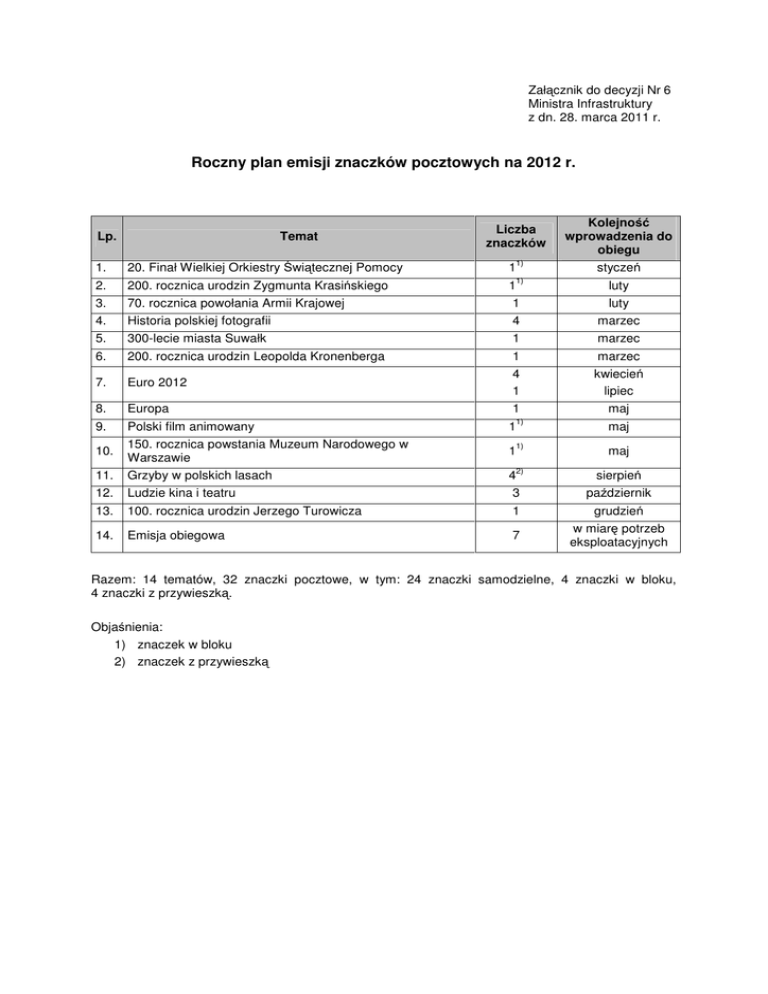 Załącznik do decyzji Nr 6 Ministra Infrastruktury z dn. 28. marca 2011 r. Roczny plan emisji znaczków pocztowych na 2012 r. Lp. 1. Temat 20. Finał Wielkiej Orkiestry Świątecznej Pomocy Liczba znaczków Kolejność wprowadzenia do obiegu 1) styczeń 1) luty 1 2. 200. rocznica urodzin Zygmunta Krasińskiego 1 3. 70. rocznica powołania Armii Krajowej 1 luty 4. Historia polskiej fotografii 4 marzec 5. 300-lecie miasta Suwałk 1 marzec 6. 200. rocznica urodzin Leopolda Kronenberga 1 marzec 7. Euro 2012 4 1 kwiecień lipiec 8. Europa 1 maj 1) maj 1) maj 2) 9. Polski film animowany 1 10. 150. rocznica powstania Muzeum Narodowego w Warszawie 1 11. Grzyby w polskich lasach 4 sierpień 12. Ludzie kina i teatru 3 październik 13. 100. rocznica urodzin Jerzego Turowicza 1 grudzień 7 w miarę potrzeb eksploatacyjnych 14. Emisja obiegowa Razem: 14 tematów, 32 znaczki pocztowe, w tym: 24 znaczki samodzielne, 4 znaczki w bloku, 4 znaczki z przywieszką. Objaśnienia: 1) znaczek w bloku 2) znaczek z przywieszką