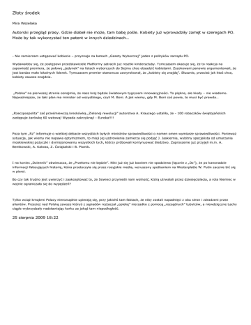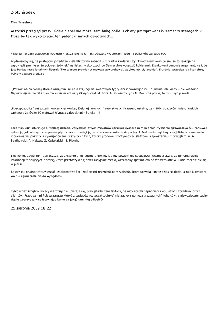 Złoty środek Mira Wszelaka Autorski przegląd prasy. Gdzie diabeł nie może, tam babę pośle. Kobiety już wprowadziły zamęt w szeregach PO. Może by tak wykorzystać ten patent w innych dziedzinach… - Nie zamierzam ustępować kobiecie – przyznaje na łamach „Gazety Wyborczej” jeden z polityków zarządu PO. Wydawałoby się, że postępowi przedstawiciele Platformy zatracili już resztki kindersztuby. Tymczasem okazuje się, że to reakcja na zapowiedź premiera, że połowę „jedynek” na listach wyborczych do Sejmu chce obsadzić kobietami. Zszokowani panowie argumentowali, że jest bardzo mało lokalnych liderek. Tymczasem premier stanowczo zawyrokował, że „kobiety się znajdą”. Słusznie, przecież jak ktoś chce, kobiety zawsze znajdzie. „Polska” na pierwszej stronie oznajmia, że nasz kraj będzie światowym tygrysem innowacyjności. To piękne, ale kiedy – nie wiadomo. Najważniejsze, że taki plan ma minister od wszystkiego, czyli M. Boni. A jak wiemy, gdy M. Boni coś powie, to musi być prawda… „Rzeczpospolita” zaś prześmiewczą kreskówką „Zielonej rewolucji” autorstwa A. Krauzego ustaliła, że - 100 robaczków świętojańskich zastępuje żarówkę 60 watową! Wypada zakrzyknąć - Eureka!!!! Poza tym „Rz” informuje o wielkiej debacie wszystkich byłych ministrów sprawiedliwości o nomen omen wymiarze sprawiedliwości. Ponieważ sytuacja, jak wiemy nie napawa optymizmem, to misji jej uzdrowienia zamierza się podjąć J. Jaskiernia, wybitny specjalista od umarzania moskiewskiej pożyczki i dymisjonowaniu wszystkich tych, którzy próbowali kontynuować śledztwo. Zaproszenie już przyjęli m.in. A. Bentkowski, A. Kalwas, Z. Ćwiąkalski i B. Piwnik. I na koniec „Dziennik” obwieszcza, że „Przełomu nie będzie”. Nikt już się już bowiem nie spodziewa (łącznie z „Dz”), że po kanonadzie informacji fałszujących historię, która przetoczyła się przez rosyjskie media, wzruszony spotkaniem na Westerplatte W. Putin zacznie bić się w piersi. Bo czy tak trudno jest uwierzyć i zaakceptować to, że Sowieci przynieśli nam wolność, którą utrwalali przez dziesięciolecia, a rola Niemiec w wojnie ograniczała się do wypędzeń? Tylko wciąż krnąbrni Polacy nierozsądnie upierają się, przy jakichś tam faktach, że niby zostali napadnięci z obu stron i zdradzeni przez aliantów. Przecież nad Polską zawsze któryś z sąsiadów roztaczał „opiekę” nierzadko z pomocą „rozsądnych” tubylców, a niewdzięczne Lachy ciągle wybrzydzały nadstawiając karku za jakąś tam niepodległość. 25 sierpnia 2009 18:22
