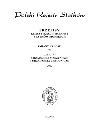 PRZEPISY KLASYFIKACJI I BUDOWY STATKÓW MORSKICH ZMIANY NR 1/2012 do CZĘŚCI VI URZĄDZENIA MASZYNOWE I URZĄDZENIA CHŁODNICZE 2012 GDAŃSK Zmiany Nr 1/2012 do Części VI – Urządzenia maszynowe i urządzenia chłodnicze – 2012, Przepisów klasyfikacji i budowy statków morskich zostały zatwierdzone przez Zarząd PRS S.A. w dniu 28 grudnia 2012 r. i wchodzą w Ŝycie z dniem 1 stycznia 2013 r. © Copyright by Polski Rejestr Statków, 2012 PRS/AW, 12/2012 Wprowadza się następujące zmiany do Części VI – Urządzenia maszynowe i urządzenia chłodnicze – 2012: 1. W notce na stronie drugiej dodaje się pozycję: Publication No. 102/P – European Union Recognized Organizations Mutual Recognition Procedure for Type Approval. 2. W SPISIE TREŚCI dodaje się podrozdział 2.10: 2.10 UłoŜenie linii wałów 3. W punkcie 1.11.5 pierwsze zdanie otrzymuje brzmienie: JeŜeli istnieje konieczność ustawienia silników lub mechanizmów na podkładkach elestycznych, to naleŜy stosować podkładki o konstrukcji uznanej przez PRS z uwzględnieniem postanowień zawartych w Publication No. 102/P – European Union Recognized Organizations Mutual Recognition Procedure for Type Approval. 4. W punkcie 1.16.4.5.2 drugie zdanie otrzymuje brzmienie: Uznanie takie moŜe nastąpić w wyniku prób typu przeprowadzonych wg procedury opisanej w Publikacji Nr 57/P – Uznawanie typu złączy mechanicznych z uwzględnieniem postanowień zawartych w Publication No. 102/P – European Union Recognized Organizations Mutual Recognition Procedure for Type Approval. 5. W punkcie 1.16.10.8: – pierwsze zdanie otrzymuje brzmienie: 1.16.10.8 W przedziałach maszynowych bez stałej wachty urządzenia sterujące zaworami poboru wody morskiej, zaworami wylotowymi połoŜonymi poniŜej linii wodnej lub zaworami urządzeń ssących systemu zęzowego powinny być tak usytuowane, aby w jak najkrótszym czasie* moŜna było do nich dojść i eksploatować je w przypadku zalewania pomieszczenia wodą. – na końcu dodaje się treść: Objaśnienie: (A) „Urządzenie ssące systemu zęzowego" oznacza to samo co "bezpośredni rurociąg ssący", o którym mowa w punktach 3.7.1 i 3.7.2 z prawidła 35-1 w rozdziale II-1 Konwencji SOLAS (patrz 22.3.2.5) i jest rozumiane jako "awaryjne ssanie zęzy", które jest uŜywane w celu usunięcia za burtę duŜej ilości wody morskiej zgromadzonej w zęzach maszynowni, wykorzystując główną pompę chłodzącą (obiegową) lub inną odpowiednią pompę, jak dopuszcza punkt 3.7.2 z prawidła 35-1 (patrz 6.4.8 i 22.3.2.5). 3 (B) Wymagania dotyczące urządzeń sterujących „zaworami poboru wody morskiej, zaworami wylotowymi połoŜonymi poniŜej linii wodnej lub zaworami urządzeń ssących systemu zęzowego” nie mają zastosowania do zaworów przeznaczonych do awaryjnego osuszania maszynowni1), pod warunkiem Ŝe: (1) zawór awaryjnego osuszania maszynowni jest normalnie utrzymywany w połoŜeniu zamkniętym, (2) w rurociągu awaryjnego osuszania maszynowni jest zainstalowany zawór zwrotny, (Uwaga: normalnie zamknięty zawór zwrotny, z niezawodnie działającym urządzeniem do bezpośredniego zamykania go, jest uwaŜany za spełniający zarówno: warunek (1) jak i (2) powyŜej) (3) rurociąg awaryjnego osuszania maszynowni znajduje się przed (tj. od strony wnętrza statku) zaworem burtowym, wyposaŜonym w opisane wyŜej urządzenie sterujące, wymagane przez prawidło 48/3 z rozdziału II-1 Konwencji SOLAS. 6. W punkcie 1.16.11.2 pierwsze zdanie otrzymuje brzmienie: 1.16.11.2 Na statkach towarowych naleŜy na kaŜdym rurociągu przechodzącym przez gródź zderzeniową przewidzieć zawór zaporowy wzniosowy z wrzecionem gwintowym, instalowany bezpośrednio na grodzi od strony skrajnika. 7. W punkcie 2.4.5 dotychczasowy wzór 2.4.5-1 zmienia się na: scf = α t [otworu ] + 0,8 ⋅ (l − e) / d p do e 1 − ⋅ d d p p 8. Dodaje się podrozdział 2.10: 2.10 UłoŜenie linii wałów Dla prawidłowego rozmieszczenia łoŜysk układu napędowego naleŜy wykonać analizę obliczeniową ułoŜenia linii wałów, którą naleŜy przedłoŜyć w Centrali PRS do rozpatrzenia, a takŜe przedstawić producentowi silnika głównego w przypadku napędu bezpośredniego. Za zgodą PRS analiza taka moŜe być pominięta dla układów napędowych z wałem pośrednim o średnicy poniŜej 300 mm. 2.10.1 Wymagania dotyczące zakresu obliczeń ułoŜenia linii wałów: – obliczenia ułoŜenia linii wałów naleŜy wykonywać zawsze, gdy średnica wału pośredniego wynosi 300 mm lub więcej; 1) 4 Dotyczy statków, których stępka została połoŜona, lub które znajdowały się w podobnym stadium budowy, w dniu 1 stycznia 2013 r. lub po tej dacie. – – – – – – obliczenia ułoŜenia linii wałów naleŜy zawsze wykonywać dla napędów z przekładnią redukcyjną, gdzie wał wyjściowy na śrubę napędową jest napędzany przez dwa lub więcej małych kół zębatych dla biegu naprzód; obliczenia ułoŜenia linii wałów naleŜy zawsze wykonywać dla prądnicy wałowej lub silnika elektrycznego, jeśli stanowią integralną część wolnoobrotowego układu napędowego; wyniki obliczeń powinny zawierać reakcje w łoŜyskach, siły tnące i momenty zginające wzdłuŜ całej linii wałów, szczegóły pochylenia łoŜyska rufowego (gdy pochylenie takie występuje), projektową odchyłkę łoŜysk od linii bazowej (prostej) i szczegółowy opis procedury układania linii wałów. Opracowanie powinno zawierać tabelaryczną i graficzną prezentację linii ugięcia wałów w stosunku do linii bazowej, a takŜe prezentację napręŜeń gnących i sił tnących; obliczenia naleŜy wykonać dla zimnego i gorącego stanu napędu, z uwzględnieniem przemieszczeń cieplnych i maksymalnych dopuszczalnych tolerancji ułoŜenia. Stan gorący powinien być przeliczony zarówno dla zanurzenia konstrukcyjnego jak i dla balastowego; w obliczeniach naleŜy uwzględnić wpływ: – siły wyporu wo