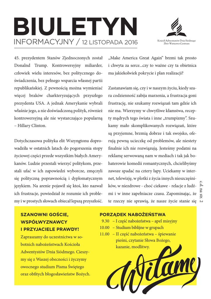 BIULETYN INFORMACYJNY / 12 LISTOPADA 2016 Kościół Adwentystów Dnia Siódmego Zbór Warszawa-Centrum 45. prezydentem Stanów Zjednoczonych został „Make America Great Again” brzmi tak prosto Donalnd Trump. Kontrowersyjny miliarder, i chwyta za serce...czy to ważne czy ta obietnica człowiek wielu interesów, bez politycznego do- ma jakiekolwiek pokrycie i plan realizacji? świadczenia, bez pełnego wsparcia własnej partii republikańskiej. Z pewnością można wymieniać Zastanawiam się, czy i w naszym życiu, kiedy sza- więcej braków charkteryzujących przyszłego ra codzienność zabija marzenia, a frustracja goni prezydenta USA. A jednak Amerykanie wybrali frustrację, nie szukamy rozwiązań tam gdzie ich właśnie jego, a nie doświadczoną polityk, również nie ma. Wierzymy w chwytliwe kłamstwa, recep- kontrowersyjną ale nie wystarczająco popularną ty mądrych tego świata i inne „trumpizmy”. Szu- – Hillary Clinton. kamy mało skomplikowanych rozwiązań, które są przyjemne, brzmią dobrze i tak swojsko, oferują pewną ucieczkę od problemów, ale niestety wadziła w ostatnich latach do pogorszenia stopy finalnie ich nie rozwiązują. Jesteśmy podatni na życiowej części przede wszystkim białych Amery- reklamę serwowaną nam w mediach i tak jak bo- kanów. Ludzie przestali wierzyć politykom, prze- haterowie komedii romantycznych, chcielibyśmy stali ufać w ich zapowiedzi wyborcze, zmęczyli zawsze spadać na cztery łapy. Uciekamy w inter- się polityczną poprawnością i dyplomatycznym net, telewizję, w plotki z życia innych nieszczęśni- językiem. Na arenie pojawił się ktoś, kto nazwał ków, w niezdrowe - choć ciekawe - relacje z ludź- ich frustracje, powiedział że rozumie ich proble- mi i w inne zapełniacze czasu. Zapominając, że my i w prostych słowach obiecał lepszą przyszłość. te rzeczy nie sprawią, że nasze życie stanie się SZANOWNI GOŚCIE, WSPÓŁWYZNAWCY I PRZYJACIELE PRAWDY! Zapraszamy do uczestnictwa w sobotnich nabożeństwach Kościoła Adwentystów Dnia Siódmego. Cieszymy się z Waszej obecności i życzymy owocnego studium Pisma Świętego oraz obfitych błogosławieństw Bożych. PORZĄDEK NABOŻEŃSTWA 9.30 – I część nabożeństwa – apel misyjny 10.00 – Studium biblijne w grupach 11.00 – II część nabożeństwa – śpiewanie pieśni, czytanie Słowa Bożego, kazanie, modlitwy. c.d. na str. 2 Dotychczasowa polityka elit Wszyngtonu dopro- RELACJE / / / / / / / / / / / / / / / / / / / / / / / / / / / lepsze, a problemy znikną. Jezus nie mami nas obietnicami bez pokrycia tylko po to, żeby zyskać sobie naszą sympatię. Nie obiecał nam drogi na skróty, choć droga do nieba jest wąska i niepopularna. Zastanów się, czy sam nie wolisz wierzyć w kłamstewka, pigułki szczęścia i natychmiastowe rozwiązania, w których Boga brak. Plan zbawienia każdego człowieka na Ziemi jest sukcesywnie realizowany od założenia świata. Widzimy w historii Ziemi jak kolejne Cały ostatni tydzień w naszym zborze koncentro- punkty w tym planie są spełniane i ... niewiele wał się głownie wokół dwóch wydarzeń. Pierwszy z nich pozostało już do końca. A skoro tak, to naj- dotyczył Tygodnia Modlitwy, a drugi projekcji bio- wyższa pora przestać wierzyć obietnicom bez po- graficznego filmu pt. „Szeregowiec Doss”. Podczas krycia i poświęcić swój czas Jezusowi. Nie wiem oczekiwania na gości grupa modlitewna zanosiła jak akurat Ty masz to zrobić, ale może już czas prośby o Boże działanie na serca oglądających o tym pomyśleć? Stawką jest zbawienie, nie tylko film, w którym pokazano jak ważne dla wierzące- Twoje. Niebieski dom. Sąsiedztwo Jezusa przez go bohatera filmu, będącego wyznawcą Kościoła wieczność. Nie ryzykuj. Razem z Nim marzenia Adwentystów, była decyzja odmówienia zabijania się spełniają. i zachowania świętości Dnia Pańskiego - soboty. Hilariusz Klinton g Nie było wielkich tłumów, ale każdego dnia około 10 nowych osób spoza naszych wyznawców ROCZNICE: dowiadywało się o tym, co to za Kościół, którego W dniach 12 – 25 listopada swoje urodziny obchodzą: wyznawca został za swoje „uparte” zachowanie i pełną poświęcenia działalność w czasie wojny odznaczony MEDALEM HONORU przez samego prezydenta USA. Nie mogę się powstrzymać od podziękowania wszystkim, którzy poświecili swój czas, by rozprowadzić 20 tysięcy zaproszeń. Brali w tym udział starsi, młodzież, a nawet dzieci, rozdając Drogim Siostrom i Braciom życzymy wielu łask i błogosławieństw Bożych. Niech Pan otacza Was opieką i obdarza zdrowiem po wszystkie dni. ulotki z informacją o filmie. Przed nami kolejna seria wykładów. Nasza prośba do wszystkich jest dalej aktualna, aby każdy RELACJE / / / / / / / / / / / / / / / / / / / / / / / / / / / z uczestników nabożeństwa zechciał przyłożyć że ulotki, dzięki Waszemu zaangażowaniu wy- swą dłoń do rozniesienia przygotowanych ulotek. nikającemu z zainteresowania tym, co dzieje się Nie mamy na szczęście wśród nas ludzi pozba- w Zborze, zostaną szybko rozdane. wionych kończyn, więc pozostaje nam wierzyć, JP g OGŁOSZENIA ZBOROWE / / / / / / / / / / / / / / / / / WYKŁADY „WIELKI BÓJ” ZAPRASZAMY NA SPOTKANIA: Zaproście waszych przyjaciół, znajomych i są- Spotkania środowe siadów na wykłady pt. WIELKI BÓJ. Spotkania W każdą środę o godz. 18.00 zapraszamy na spo- te pomogą w poznaniu Pisma Świętego, a także tkanie modlitewne do Sali Katechetycznej. w zrozumieniu wydarzeń, z jakimi spotykamy się każdego dnia, nie wiedząc co jest ich przyczyną. KIEDY? - Od dziś, tj. od 12 listopada do 10 grudnia, w każdą sobotę i niedzielę o godz. 18.00. Spotkania czwartkowe W każdy czwartek o godz. 17.00 odbywają się spotkania Adwentystycznej Grupy Integracyjnej. Spotkania piątkowe Zachęcamy także do rozdawania i pozostawiania W każdy piątek o godz. 18.00 spotykają 