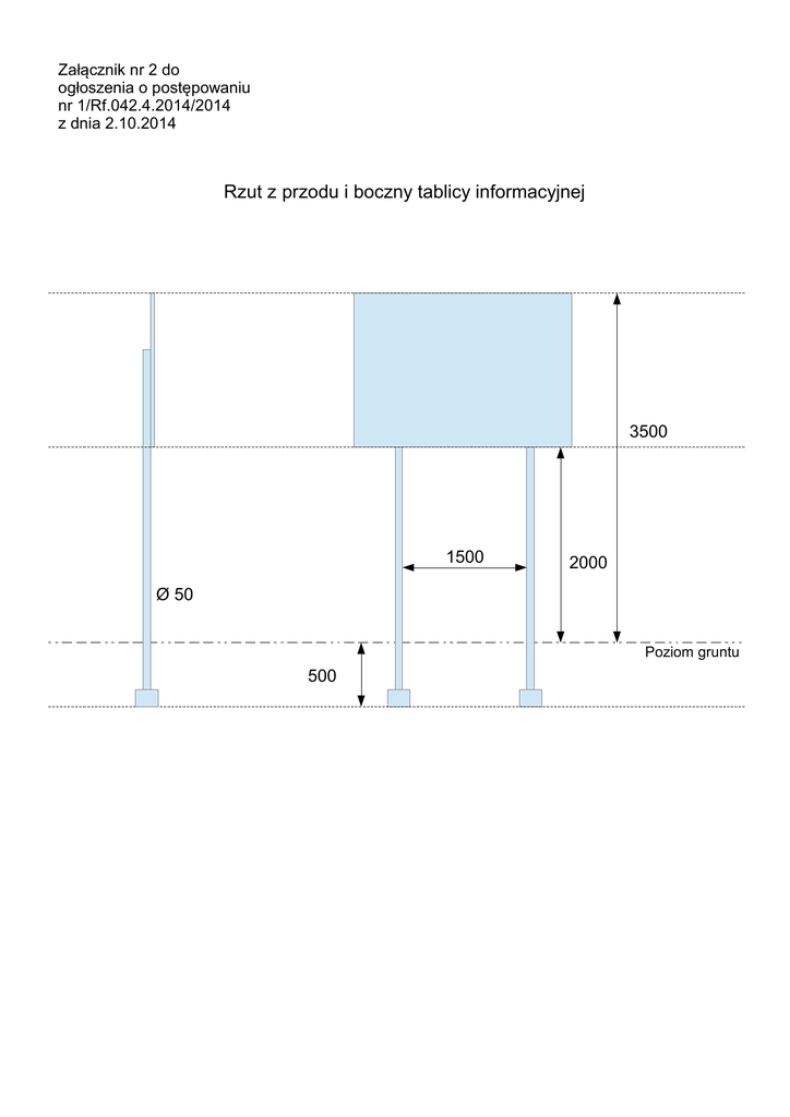 Załącznik nr 2 do ogłoszenia o postępowaniu nr 1/Rf.042.4.2014/2014 z dnia 2.10.2014 Rzut z przodu i boczny tablicy informacyjnej 3500 1500 2000 Ø 50 Poziom gruntu 500