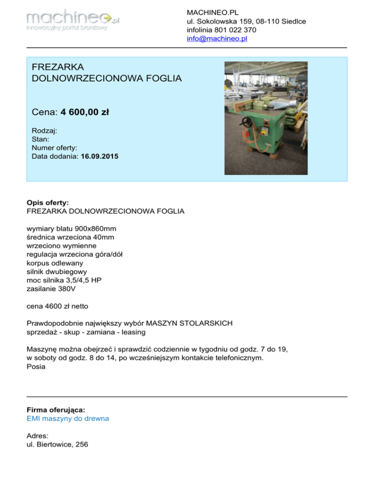 MACHINEO.PL ul. Sokolowska 159, 08-110 Siedlce infolinia 801 022 370 [email protected] FREZARKA DOLNOWRZECIONOWA FOGLIA Cena: 4 600,00 zł Rodzaj: Stan: Numer oferty: Data dodania: 16.09.2015 Opis oferty: FREZARKA DOLNOWRZECIONOWA FOGLIA wymiary blatu 900x860mm średnica wrzeciona 40mm wrzeciono wymienne regulacja wrzeciona góra/dół korpus odlewany silnik dwubiegowy moc silnika 3,5/4,5 HP zasilanie 380V cena 4600 zł netto Prawdopodobnie największy wybór MASZYN STOLARSKICH sprzedaż - skup - zamiana - leasing Maszynę można obejrzeć i sprawdzić codziennie w tygodniu od godz. 7 do 19, w soboty od godz. 8 do 14, po wcześniejszym kontakcie telefonicznym. Posia Firma oferująca: EMI maszyny do drewna Adres: ul. Biertowice, 256 MACHINEO.PL ul. Sokolowska 159, 08-110 Siedlce infolinia 801 022 370 [email protected] 32-440___ Sułkowice