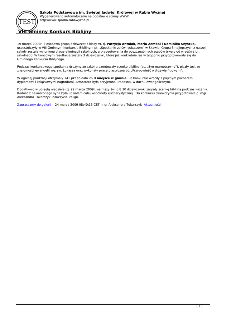 Szkoła Podstawowa im. Świętej Jadwigi Królowej w Rabie Wyżnej Wygenerowano automatycznie na podstawie strony WWW http://www.spraba.rabawyzna.pl VIII Gminny Konkurs Biblijny 19 marca 2009r. 3 osobowa grupa dziewcząt z klasy VI, tj. Patrycja Antolak, Maria Zembal i Dominika Szyszka, uczestniczyły w VIII Gminnym Konkursie Biblijnym pt. „Spotkanie ze św. Łukaszem” w Skawie. Grupa 3 najlepszych z naszej szkoły została wyłoniona drogą eliminacji szkolnych, a przygotowania do poszczególnych etapów trwały od września br. szkolnego. W końcowym rezultacie zostały 3 dziewczynki, które już konkretnie raz w tygodniu przygotowywały się do Gminnego Konkursu Biblijnego. Podczas konkursowego spotkania drużyny ze szkół prezentowały scenkę biblijną (pt. „Syn marnotrawny”), pisały test ze znajomości ewangelii wg. św. Łukasza oraz wykonały pracę plastyczną pt. „Przypowieść o drzewie figowym”. W ogólnej punktacji otrzymały 141 pkt co dało im II miejsce w gminie. Po konkursie wróciły z pięknym pucharem, dyplomami i książkowymi nagrodami. Atmosfera była przyjemna i radosna, w duchu ewangelicznym. Dodatkowo w ubiegłą niedziele (tj. 22 marca 2009r. na mszy św. o 8:30 dziewczynki zagrały scenkę biblijną podczas kazania. Radość z nawróconego syna była udziałem całej wspólnoty eucharystycznej. Do konkursu dziewczynki przygotowała p. mgr Aleksandra Tokarczyk, nauczyciel religii. Zapraszamy do galerii 24 marca 2009 08:40:15 CET mgr Aleksandra Tokarczyk Aktualności 1/1