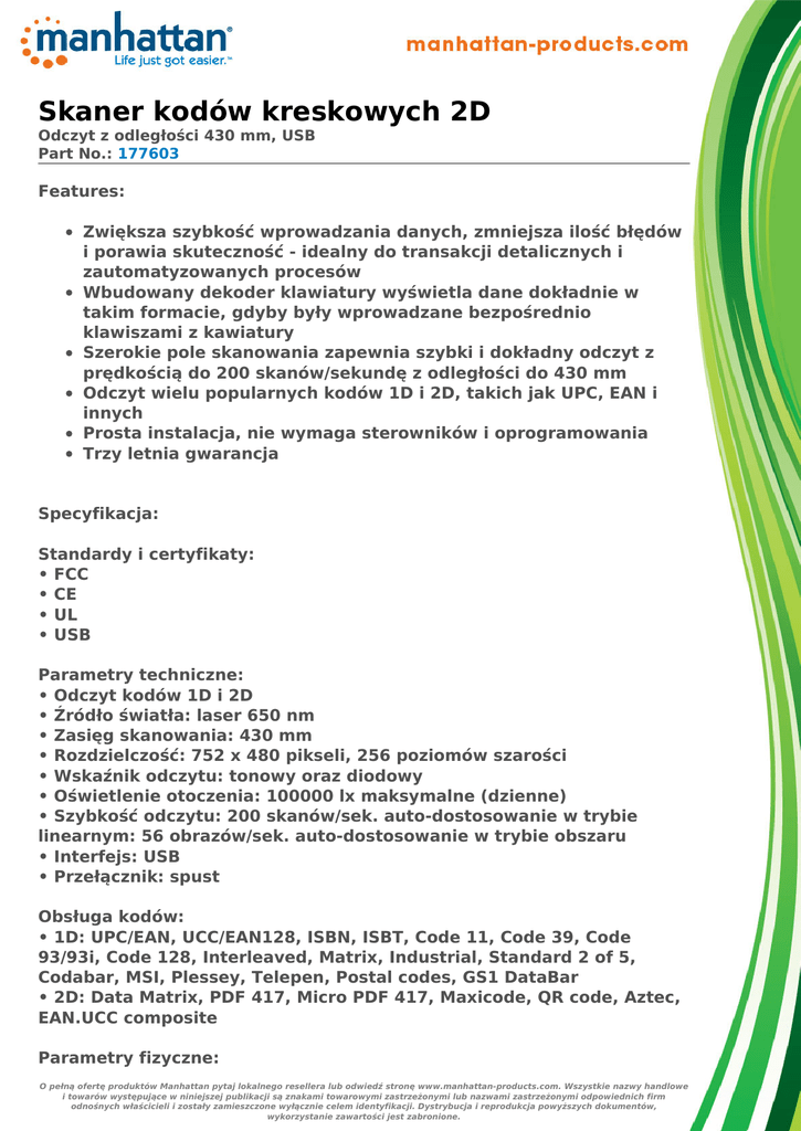 Skaner kodów kreskowych 2D Odczyt z odległości 430 mm, USB Part No.: 177603 Features: Zwiększa szybkość wprowadzania danych, zmniejsza ilość błędów i porawia skuteczność - idealny do transakcji detalicznych i zautomatyzowanych procesów Wbudowany dekoder klawiatury wyświetla dane dokładnie w takim formacie, gdyby były wprowadzane bezpośrednio klawiszami z kawiatury Szerokie pole skanowania zapewnia szybki i dokładny odczyt z prędkością do 200 skanów/sekundę z odległości do 430 mm Odczyt wielu popularnych kodów 1D i 2D, takich jak UPC, EAN i innych Prosta instalacja, nie wymaga sterowników i oprogramowania Trzy letnia gwarancja Specyfikacja: Standardy i certyfikaty: • FCC • CE • UL • USB Parametry techniczne: • Odczyt kodów 1D i 2D • Źródło światła: laser 650 nm • Zasięg skanowania: 430 mm • Rozdzielczość: 752 x 480 pikseli, 256 poziomów szarości • Wskaźnik odczytu: tonowy oraz diodowy • Oświetlenie otoczenia: 100000 lx maksymalne (dzienne) • Szybkość odczytu: 200 skanów/sek. auto-dostosowanie w trybie linearnym: 56 obrazów/sek. auto-dostosowanie w trybie obszaru • Interfejs: USB • Przełącznik: spust Obsługa kodów: • 1D: UPC/EAN, UCC/EAN128, ISBN, ISBT, Code 11, Code 39, Code 93/93i, Code 128, Interleaved, Matrix, Industrial, Standard 2 of 5, Codabar, MSI, Plessey, Telepen, Postal codes, GS1 DataBar • 2D: Data Matrix, PDF 417, Micro PDF 417, Maxicode, QR code, Aztec, EAN.UCC composite Parametry fizyczne: O pełną ofertę produktów Manhattan pytaj lokalnego resellera lub odwiedź stronę www.manhattan-products.com. Wszystkie nazwy handlowe i towarów występujące w niniejszej publikacji są znakami towarowymi zastrzeżonymi lub nazwami zastrzeżonymi odpowiednich firm odnośnych właścicieli i zostały zamieszczone wyłącznie celem identyfikacji. Dystrybucja i reprodukcja powyższych dokumentów, wykorzystanie zawartości jest zabronione. • • • • • • • Wymiary: 19,3 x 9 x 7,2 cm Waga: 135 g Długość kabla: 1,5 m Temperatura pracy: 0 – 50°C Temperatura składowania: -20 – 70°C Wilgotność: 20 - 95% (bez kondensacji) Obudowa: ABS Parametry elektryczne: • Napięcie: DC +5 V +/- 5% • Pobór mocy: 435 mA (podczas pracy) Zawartość opakowania: • Skaner kodów kreskowych 2D • Instrukcja użytkownika O pełną ofertę produktów Manhattan pytaj lokalnego resellera lub odwiedź stronę www.manhattan-products.com. Wszystkie nazwy handlowe i towarów występujące w niniejszej publikacji są znakami towarowymi zastrzeżonymi lub nazwami zastrzeżonymi odpowiednich firm odnośnych właścicieli i zostały zamieszczone wyłącznie celem identyfikacji. Dystrybucja i reprodukcja powyższych dokumentów, wykorzystanie zawartości jest zabronione. O pełną ofertę produktów Manhattan pytaj lokalnego resellera lub odwiedź stronę www.manhattan-products.com. Wszystkie nazwy handlowe i towarów występujące w niniejszej publikacji są znakami towarowymi zastrzeżonymi lub nazwami zastrzeżonymi odpowiednich firm odnośnych właścicieli i zostały zamieszczone wyłącznie celem identyfikacji. Dystrybucja i reprodukcja powyższych dokumentów, wykorzystanie zawartości jest zabronione.