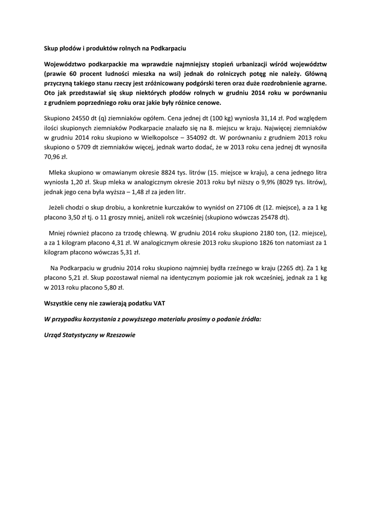 Skup płodów i produktów rolnych na Podkarpaciu Województwo podkarpackie ma wprawdzie najmniejszy stopień urbanizacji wśród województw (prawie 60 procent ludności mieszka na wsi) jednak do rolniczych potęg nie należy. Główną przyczyną takiego stanu rzeczy jest zróżnicowany podgórski teren oraz duże rozdrobnienie agrarne. Oto jak przedstawiał się skup niektórych płodów rolnych w grudniu 2014 roku w porównaniu z grudniem poprzedniego roku oraz jakie były różnice cenowe. Skupiono 24550 dt (q) ziemniaków ogółem. Cena jednej dt (100 kg) wyniosła 31,14 zł. Pod względem ilości skupionych ziemniaków Podkarpacie znalazło się na 8. miejscu w kraju. Najwięcej ziemniaków w grudniu 2014 roku skupiono w Wielkopolsce – 354092 dt. W porównaniu z grudniem 2013 roku skupiono o 5709 dt ziemniaków więcej, jednak warto dodać, że w 2013 roku cena jednej dt wynosiła 70,96 zł. Mleka skupiono w omawianym okresie 8824 tys. litrów (15. miejsce w kraju), a cena jednego litra wyniosła 1,20 zł. Skup mleka w analogicznym okresie 2013 roku był niższy o 9,9% (8029 tys. litrów), jednak jego cena była wyższa – 1,48 zł za jeden litr. Jeżeli chodzi o skup drobiu, a konkretnie kurczaków to wyniósł on 27106 dt (12. miejsce), a za 1 kg płacono 3,50 zł tj. o 11 groszy mniej, aniżeli rok wcześniej (skupiono wówczas 25478 dt). Mniej również płacono za trzodę chlewną. W grudniu 2014 roku skupiono 2180 ton, (12. miejsce), a za 1 kilogram płacono 4,31 zł. W analogicznym okresie 2013 roku skupiono 1826 ton natomiast za 1 kilogram płacono wówczas 5,31 zł. Na Podkarpaciu w grudniu 2014 roku skupiono najmniej bydła rzeźnego w kraju (2265 dt). Za 1 kg płacono 5,21 zł. Skup pozostawał niemal na identycznym poziomie jak rok wcześniej, jednak za 1 kg w 2013 roku płacono 5,80 zł. Wszystkie ceny nie zawierają podatku VAT W przypadku korzystania z powyższego materiału prosimy o podanie źródła: Urząd Statystyczny w Rzeszowie