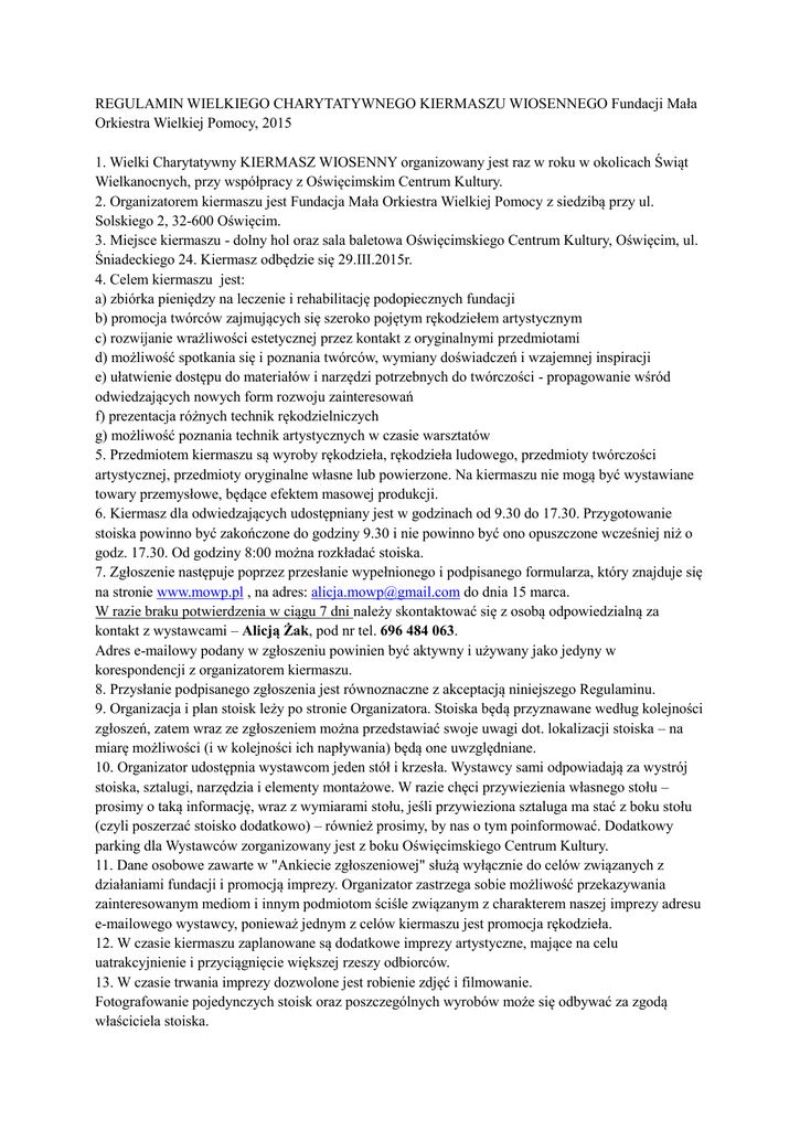 REGULAMIN WIELKIEGO CHARYTATYWNEGO KIERMASZU WIOSENNEGO Fundacji Mała Orkiestra Wielkiej Pomocy, 2015 1. Wielki Charytatywny KIERMASZ WIOSENNY organizowany jest raz w roku w okolicach Świąt Wielkanocnych, przy współpracy z Oświęcimskim Centrum Kultury. 2. Organizatorem kiermaszu jest Fundacja Mała Orkiestra Wielkiej Pomocy z siedzibą przy ul. Solskiego 2, 32-600 Oświęcim. 3. Miejsce kiermaszu - dolny hol oraz sala baletowa Oświęcimskiego Centrum Kultury, Oświęcim, ul. Śniadeckiego 24. Kiermasz odbędzie się 29.III.2015r. 4. Celem kiermaszu jest: a) zbiórka pieniędzy na leczenie i rehabilitację podopiecznych fundacji b) promocja twórców zajmujących się szeroko pojętym rękodziełem artystycznym c) rozwijanie wrażliwości estetycznej przez kontakt z oryginalnymi przedmiotami d) możliwość spotkania się i poznania twórców, wymiany doświadczeń i wzajemnej inspiracji e) ułatwienie dostępu do materiałów i narzędzi potrzebnych do twórczości - propagowanie wśród odwiedzających nowych form rozwoju zainteresowań f) prezentacja różnych technik rękodzielniczych g) możliwość poznania technik artystycznych w czasie warsztatów 5. Przedmiotem kiermaszu są wyroby rękodzieła, rękodzieła ludowego, przedmioty twórczości artystycznej, przedmioty oryginalne własne lub powierzone. Na kiermaszu nie mogą być wystawiane towary przemysłowe, będące efektem masowej produkcji. 6. Kiermasz dla odwiedzających udostępniany jest w godzinach od 9.30 do 17.30. Przygotowanie stoiska powinno być zakończone do godziny 9.30 i nie powinno być ono opuszczone wcześniej niż o godz. 17.30. Od godziny 8:00 można rozkładać stoiska. 7. Zgłoszenie następuje poprzez przesłanie wypełnionego i podpisanego formularza, który znajduje się na stronie www.mowp.pl , na adres: [email protected] do dnia 15 marca. W razie braku potwierdzenia w ciągu 7 dni należy skontaktować się z osobą odpowiedzialną za kontakt z wystawcami – Alicją Żak, pod nr tel. 696 484 063. Adres e-mailowy podany w zgłoszeniu powinien być aktywny i używany jako jedyny w korespondencji z organizatorem kiermaszu. 8. Przysłanie podpisanego zgłoszenia jest równoznaczne z akceptacją niniejszego Regulaminu. 9. Organizacja i plan stoisk leży po stronie Organizatora. Stoiska będą przyznawane według kolejności zgłoszeń, zatem wraz ze zgłoszeniem można przedstawiać swoje uwagi dot. lokalizacji stoiska – na miarę możliwości (i w kolejności ich napływania) będą one uwzględniane. 10. Organizator udostępnia wystawcom jeden stół i krzesła. Wystawcy sami odpowiadają za wystrój stoiska, sztalugi, narzędzia i elementy montażowe. W razie chęci przywiezienia własnego stołu – prosimy o taką informację, wraz z wymiarami stołu, jeśli przywieziona sztaluga ma stać z boku stołu (czyli poszerzać stoisko dodatkowo) – również prosimy, by nas o tym poinformować. Dodatkowy parking dla Wystawców zorganizowany jest z boku Oświęcimskiego Centrum Kultury. 11. Dane osobowe zawarte w "Ankiecie zgłoszeniowej" służą wyłącznie do celów związanych z działaniami fundacji i promocją imprezy. Organizator zastrzega sobie możliwość przekazywania zainteresowanym mediom i innym podmiotom ściśle związanym z charakterem naszej imprezy adresu e-mailowego wystawcy, ponieważ jednym z celów kiermaszu jest promocja rękodzieła. 12. W czasie kiermaszu zaplanowane są dodatkowe imprezy artystyczne, mające na celu uatrakcyjnienie i przyciągnięcie większej rzeszy odbiorców. 13. W czasie trwania imprezy dozwolone jest robienie zdjęć i filmowanie. Fotografowanie pojedynczych stoisk oraz poszczególnych wyrobów może się odbywać za zgodą właściciela stoiska. 14. W przypadku zaistnienia sytuacji losowych niezależnych od Organizatora, zastrzega on sobie możliwość odwołania kiermaszu. 15. Odpowiedzialność prawną za eksponowane wyroby ponoszą Wystawcy, którzy samodzielnie dokonują rozliczenia z urzędami i instytucjami z tytułu uzyskanych przychodów. 16. Wystawcy zobowiązani są do nadzorowania swoich stoisk. Organizator dołoży wszelkich starań do ochrony miejsca imprezy, jednak nie ponosi odpowiedzialności za kradzieże i szkody powstałe w mieniu należącym do wystawcy. 17. W czasie kiermaszu wystawcy nie mogą prowadzić innej działalności charytatywnej (dotyczy to informacji o 1 procencie oraz apeli o pomoc). 18. Na terenie kiermaszu organizator zabrania palenia papierosów i spożywania napojów alkoholowych. 19. Organizator nie pobiera opłat za udział w imprezie; ani wolontariusze fundacji, ani sama fundacja nie zarabia na tym przedsięwzięciu. Impreza ma charakter charytatywny, całość zebranych środków trafi na konto chorego dziecka. Dlatego w trakcie trwania kiermaszu wystawcy będą poproszeni o przekazanie darowizny na rzecz podopiecznego fundacji, w wysokości podobnej do opłat, które funkcjonują na podobnych imprezach – darowizny będą przyjmowane bezpośrednio do puszki w godzinach popołudniowych, przez opiekuna wystawców wraz z wolontariuszem.