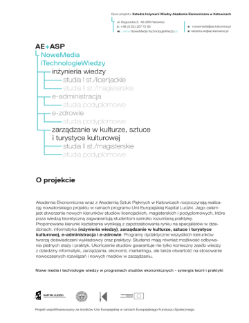 Biuro projektu: Katedra Inzynierii Wiedzy Akademia Ekonomiczna w Katowicach ul. Bogucicka 3, 40-266 Katowice t: +48 (0 32) 257 72 95 w: www.NoweMediaiTechnologieWiedzy.pl e: [email protected] e: [email protected] O projekcie Akademia Ekonomiczna wraz z Akademią Sztuk Pięknych w Katowicach rozpoczynają realizację nowatorskiego projektu w ramach programu Unii Europejskiej Kapitał Ludzki. Jego celem jest stworzenie nowych kierunków studiów licencjackich, magisterskich i podyplomowych, które poza wiedzą teoretyczną zagwarantują studentom szeroko rozumianą praktykę. Proponowane kierunki kształcenia wynikają z zapotrzebowania rynku na specjalistów w dziedzinach: informatyka (inżynieria wiedzy), zarządzanie w kulturze, sztuce i turystyce kulturowej, e-administracja i e-zdrowie. Programy dydaktyczne wszystkich kierunków tworzą doświadczeni wykładowcy oraz praktycy. Studenci mają również możliwość odbywania płatnych staży i praktyk. Ukończenie studiów gwarantuje nie tylko konieczny zasób wiedzy z dziedziny informatyki, zarządzania, ekonomii, marketingu, ale także otwartość na stosowanie nowoczesnych rozwiązań i nowych mediów w zarządzaniu. Nowe media i technologie wiedzy w programach studiów ekonomicznych - synergia teorii i praktyki Projekt współfinansowany ze środków Unii Europejskiej w ramach Europejskiego Funduszu Społecznego Biuro projektu: Katedra Inzynierii Wiedzy Akademia Ekonomiczna w Katowicach ul. Bogucicka 3, 40-266 Katowice t: +48 (0 32) 257 72 95 w: www.NoweMediaiTechnologieWiedzy.pl e: [email protected] e: [email protected] Akademia Ekonomiczna im. Karola Adamieckiego w Katowicach Katowicka Akademia Ekonomiczna jest jedną z najstarszych uczelni na Śląsku. Powstała w grudniu 1936 r. jako prywatne Wyższe Studium Nauk Społeczno-Gospodarczych. Nauczanie w niej rozpoczęto 11 stycznia 1937 r. na jedynym wówczas Wydziale Organizacji Przemysłowej i tę datę uważa się za początek działalności szkoły. Organizatorem i pierwszym rektorem Uczelni był dr Józef Lisak. Obecnie Akademia Ekonomiczna im. Karola Adamieckiego w Katowicach kształci studentów na czterech wydziałach: » Ekonomii, » Finansów i Ubezpieczeń, » Zarządzania » oraz powstałym w bieżącym roku Informatyki i Komunikacji. Oferta dydaktyczna Uczelni obejmuje 48 specjalności prowadzonych na ośmiu kierunkach studiów: » Ekonomia, » Finanse i Rachunkowość, » Gospodarka Przestrzenna, » (NOWOŚĆ) Informatyka, » Informatyka i Ekonometria, » Logistyka, » Międzynarodowe Stosunki Gospodarcze, » Zarządzanie. Bazę naukowo - dydaktyczną Uczelni tworzą także takie jednostki jak: Międzywydziałowe Centrum Nauczania i Promocji Języków Obcych, Centrum Obliczeniowe, Studium Wychowania Fizycznego i Sportu, Studium Pedagogiczne, Biblioteka Główna i biblioteki katedralne, Wydawnictwo Uczelniane, Centrum Badań i Ekspertyz, Centrum Badań i Studiów Europejskich, Centrum Badawcze Społecznego Dialogu Pracy, Akademickie Centrum Kariery, Śląska Szkoła Języków Obcych Ekonomicznych. Absolwenci tej najstarszej i największej w regionie uczelni ekonomicznej są wybitnymi specjalistami poszukiwanymi na rynku pracy. Katowicka Akademia Ekonomiczna zajmuje czołowe miejsca w rankingach szkół ekonomicznych prowadzonych m.in. przez Newsweek czy ACI. www.ae.katowice.pl Projekt współfinansowany ze środków Unii Europejskiej w ramach Europejskiego Funduszu Społecznego Biuro projektu: Katedra Inzynierii Wiedzy Akademia Ekonomiczna w Katowicach ul. Bogucicka 3, 40-266 Katowice t: +48 (0 32) 257 72 95 w: www.NoweMediaiTechnologieWiedzy.pl e: [email protected] e: [email protected] Akademia Sztuk Pieknych w Katowicach Akademia Sztuk Pięknych w Katowicach rozpoczęła działalność 1 września 2001 roku. Wyrosła z doświadczeń i tradycji szkolnictwa artystycznego na Śląsku po ponad 50 wspólnych latach z krakowską ASP. W jej ramach przez pół wieku katowicka szkoła budowała swoją tradycję, początkowo jako Wydział Grafiki, a następnie Filia ASP. Współtworzyła jedno z pierwszych w kraju centrów grafiki warsztatowej i projektowej. To dzięki funkcjonowaniu katowickiej szkoły jako Filii Akademii Sztuk Pięknych w Krakowie twórcy sztuk plastycznych stali się drugim, obok muzycznego, środowiskiem artystycznym na Śląsku. Nowopowstała uczelnia rozpoczęła swoją działalność jako szkoła jednowydziałowa - Wydziału Grafiki, Malarstwa i Wzornictwa. Dziś, ta najmłodsza w Polsce Akademia Sztuk Pięknych jest uczelnią dwuwydziałową, z Wydziałem Projektowym (projektowanie graficzne i wzornictwo) i Wydziałem Artystycznym (grafika warsztatowa i malarstwo), na których młodzi adepci sztuki i dizajnu mogą zdobywać wykształcenie w ramach studiów stacjonarnych i niestacjonarnych i zaocznych. Obok tradycyjnych warsztatów, charakterystycznych dla katowickiej ASP rozwijamy bardzo dynamicznie cały obszar związany z nowymi mediami i cyberprzestrzenią. Uzupełnieniem oferty kształcenia są warsztaty i kursy z udziałem wybitnych artystów i dizajnerów z kraju i zagranicy. Uczelnia nie ogranicza swej oferty kształcenia tylko i wyłącznie do studentów. Od kilku lat z wielkim powodzeniem funkcjonuje tu bowiem Akademia Weekendowa - unikatowa w skali kraju forma kursu skierowanego do osób, które zawsze chciały rozwijać swoje zdolności artystyczne, ale z różnych przyczyn nie mogły lub nie chciały tego robić w ramach regularnych studiów. Organizowane w należącej do ASP galerii Rondo Sztuki wystawy, spotkania, sympozja i koncerty artystów uznanych na całym świecie dopełniają pokazy młodych twórców, studentów dopiero wchodzących w profesjonalny świat sztuki i dizajnu. Miejsce to na stałe już wpisało się w artystyczno-kulturowy krajobraz Katowic i Górnego Śląska. Projekt współfinansowany ze środków Unii Europejskiej w ramach Europejskiego Funduszu Społecznego Biuro projektu: Katedra Inzynierii Wiedzy Akademia Ekon