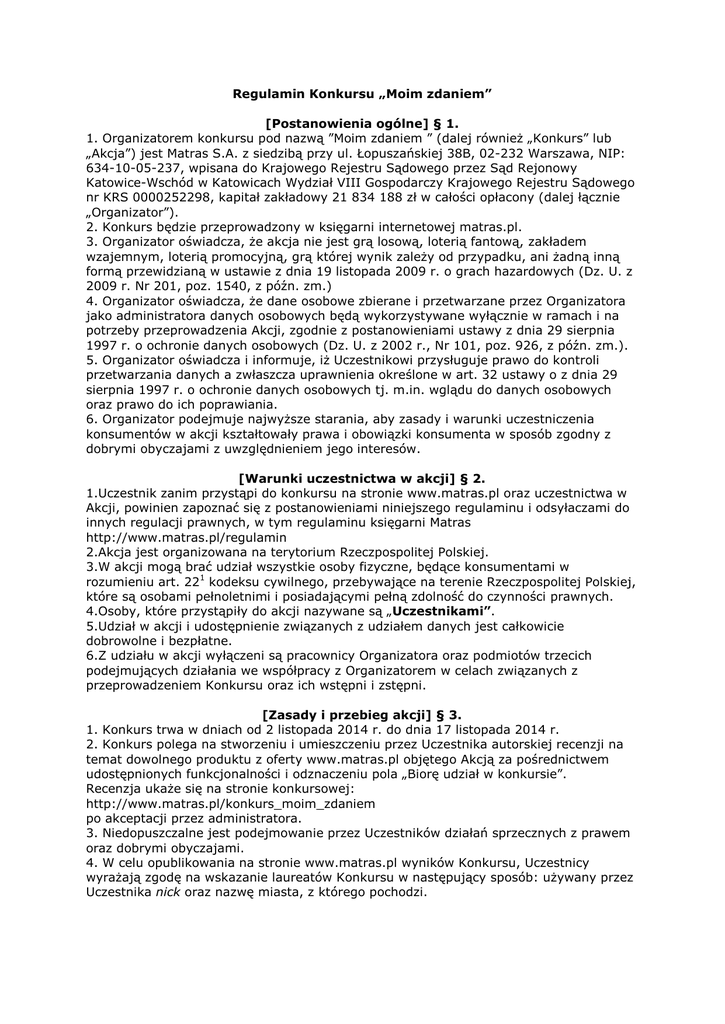 Regulamin Konkursu „Moim zdaniem” [Postanowienia ogólne] § 1. 1. Organizatorem konkursu pod nazwą ”Moim zdaniem ” (dalej również „Konkurs” lub „Akcja”) jest Matras S.A. z siedzibą przy ul. Łopuszańskiej 38B, 02-232 Warszawa, NIP: 634-10-05-237, wpisana do Krajowego Rejestru Sądowego przez Sąd Rejonowy Katowice-Wschód w Katowicach Wydział VIII Gospodarczy Krajowego Rejestru Sądowego nr KRS 0000252298, kapitał zakładowy 21 834 188 zł w całości opłacony (dalej łącznie „Organizator”). 2. Konkurs będzie przeprowadzony w księgarni internetowej matras.pl. 3. Organizator oświadcza, że akcja nie jest grą losową, loterią fantową, zakładem wzajemnym, loterią promocyjną, grą której wynik zależy od przypadku, ani żadną inną formą przewidzianą w ustawie z dnia 19 listopada 2009 r. o grach hazardowych (Dz. U. z 2009 r. Nr 201, poz. 1540, z późn. zm.) 4. Organizator oświadcza, że dane osobowe zbierane i przetwarzane przez Organizatora jako administratora danych osobowych będą wykorzystywane wyłącznie w ramach i na potrzeby przeprowadzenia Akcji, zgodnie z postanowieniami ustawy z dnia 29 sierpnia 1997 r. o ochronie danych osobowych (Dz. U. z 2002 r., Nr 101, poz. 926, z późn. zm.). 5. Organizator oświadcza i informuje, iż Uczestnikowi przysługuje prawo do kontroli przetwarzania danych a zwłaszcza uprawnienia określone w art. 32 ustawy o z dnia 29 sierpnia 1997 r. o ochronie danych osobowych tj. m.in. wglądu do danych osobowych oraz prawo do ich poprawiania. 6. Organizator podejmuje najwyższe starania, aby zasady i warunki uczestniczenia konsumentów w akcji kształtowały prawa i obowiązki konsumenta w sposób zgodny z dobrymi obyczajami z uwzględnieniem jego interesów. [Warunki uczestnictwa w akcji] § 2. 1.Uczestnik zanim przystąpi do konkursu na stronie www.matras.pl oraz uczestnictwa w Akcji, powinien zapoznać się z postanowieniami niniejszego regulaminu i odsyłaczami do innych regulacji prawnych, w tym regulaminu księgarni Matras http://www.matras.pl/regulamin 2.Akcja jest organizowana na terytorium Rzeczpospolitej Polskiej. 3.W akcji mogą brać udział wszystkie osoby fizyczne, będące konsumentami w rozumieniu art. 221 kodeksu cywilnego, przebywające na terenie Rzeczpospolitej Polskiej, które są osobami pełnoletnimi i posiadającymi pełną zdolność do czynności prawnych. 4.Osoby, które przystąpiły do akcji nazywane są „Uczestnikami”. 5.Udział w akcji i udostępnienie związanych z udziałem danych jest całkowicie dobrowolne i bezpłatne. 6.Z udziału w akcji wyłączeni są pracownicy Organizatora oraz podmiotów trzecich podejmujących działania we współpracy z Organizatorem w celach związanych z przeprowadzeniem Konkursu oraz ich wstępni i zstępni. [Zasady i przebieg akcji] § 3. 1. Konkurs trwa w dniach od 2 listopada 2014 r. do dnia 17 listopada 2014 r. 2. Konkurs polega na stworzeniu i umieszczeniu przez Uczestnika autorskiej recenzji na temat dowolnego produktu z oferty www.matras.pl objętego Akcją za pośrednictwem udostępnionych funkcjonalności i odznaczeniu pola „Biorę udział w konkursie”. Recenzja ukaże się na stronie konkursowej: http://www.matras.pl/konkurs_moim_zdaniem po akceptacji przez administratora. 3. Niedopuszczalne jest podejmowanie przez Uczestników działań sprzecznych z prawem oraz dobrymi obyczajami. 4. W celu opublikowania na stronie www.matras.pl wyników Konkursu, Uczestnicy wyrażają zgodę na wskazanie laureatów Konkursu w następujący sposób: używany przez Uczestnika nick oraz nazwę miasta, z którego pochodzi. [Wyłonienie zwycięzcy i nagrody] § 4. 1. Recenzje konkursowe będą opublikowane po akceptacji administratora na stronie konkursu: http://www.matras.pl/konkurs_moim_zdaniem i oceniane przez Komisję konkursową złożoną z przedstawicieli Organizatora według ściśle określonych kryteriów. 2. Komisja konkursowa, przyznając nagrody i wybierając laureatów na posiedzeniu tajnym, weźmie pod uwagę (i) oryginalność (ii) jakość językową oraz (iii) jakość merytoryczną. 3. Wyniki Konkursu zostaną ogłoszone na stronach księgarni internetowej www.matras.pl do dnia 24 listopada 2014 r. do godz. 24.00 na zasadach wskazanych w § 3 ust. 4 niniejszego regulaminu. Ponadto laureaci zostaną bezpośrednio zawiadomieni o przyznaniu nagrody na podany podczas rejestracji adres e-mail. 4. Decyzja Komisji konkursowej jest ostateczna i nie podlega weryfikacji. 5. Nagrody zostaną przyznane w następujący sposób: a) nagroda główna pierwszego stopnia dla laureata, którego recenzja konkursowa spełni kryteria tj. zostanie uznane przez komisję konkursową za najbardziej oryginalną oraz na najwyższym poziomie pod względem merytorycznym i językowym: Nagroda główna pakiet książek wydawnictwa Znak pakiet książek wydawnictwa Harlequin pakiet książek wydawnictwa Czarna Owca pakiet książek wydawnictwa WAB oraz następujące tytuły http://www.matras.pl/tajemnica-filomeny-dvd.html http://www.matras.pl/stare-jak-nowe-25-przebojow-na-25-lecie-2-cd.html http://www.matras.pl/rollercoaster-cd-z-autografem-artysty.html http://www.matras.pl/skamienialosci-skaly-i-mineraly-clementoni.html http://www.matras.pl/scrabble-original-nowy-wyglad-gra.html b) nagrody drugiego stopnia dla 20 laureatów, których recenzja konkursowa spełni kryteria tj. zostanie uznane przez komisję konkursową za oryginalną oraz na wysokim poziomie pod względem merytorycznym i językowym, po 5 nagród za recenzję w 4 kategoriach produktowych: książki, muzyka, filmy oraz zabawki. Nagrody zostaną rozdzielone w następujący sposób: Książki 1 nagroda pakiet książek pakiet książek pakiet książek pakiet książek wydawnictwa wydawnictwa wydawnictwa wydawnictwa Rebis WIELKA LITERA PWN Muza 2 nagroda pakiet książek wydawnictwa ZNAK pakiet książek wydawnictwa AMBER pakiet książek wydawnictwa WAB 3 nagroda pakiet książek wydawnictwa CZARNA OW