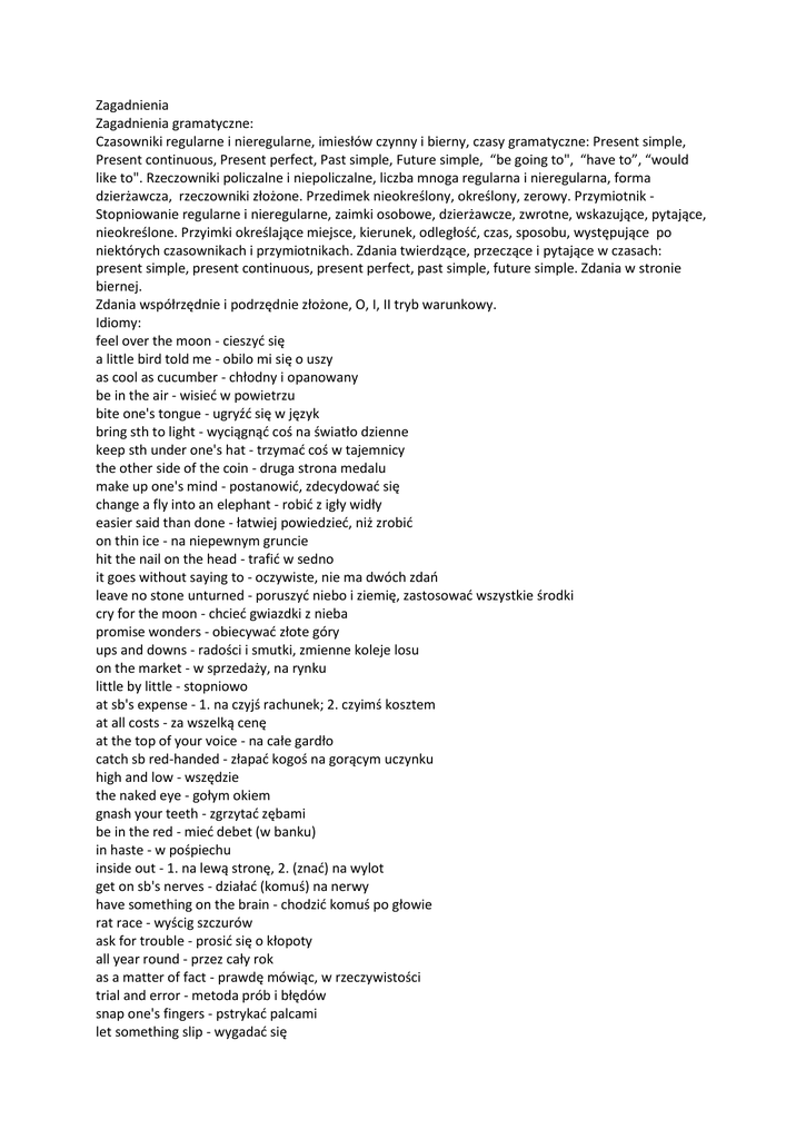 Zagadnienia Zagadnienia gramatyczne: Czasowniki regularne i nieregularne, imiesłów czynny i bierny, czasy gramatyczne: Present simple, Present continuous, Present perfect, Past simple, Future simple, “be going to", “have to”, “would like to". Rzeczowniki policzalne i niepoliczalne, liczba mnoga regularna i nieregularna, forma dzierżawcza, rzeczowniki złożone. Przedimek nieokreślony, określony, zerowy. Przymiotnik Stopniowanie regularne i nieregularne, zaimki osobowe, dzierżawcze, zwrotne, wskazujące, pytające, nieokreślone. Przyimki określające miejsce, kierunek, odległość, czas, sposobu, występujące po niektórych czasownikach i przymiotnikach. Zdania twierdzące, przeczące i pytające w czasach: present simple, present continuous, present perfect, past simple, future simple. Zdania w stronie biernej. Zdania współrzędnie i podrzędnie złożone, O, I, II tryb warunkowy. Idiomy: feel over the moon - cieszyć się a little bird told me - obilo mi się o uszy as cool as cucumber - chłodny i opanowany be in the air - wisieć w powietrzu bite one's tongue - ugryźć się w język bring sth to light - wyciągnąć coś na światło dzienne keep sth under one's hat - trzymać coś w tajemnicy the other side of the coin - druga strona medalu make up one's mind - postanowić, zdecydować się change a fly into an elephant - robić z igły widły easier said than done - łatwiej powiedzieć, niż zrobić on thin ice - na niepewnym gruncie hit the nail on the head - trafić w sedno it goes without saying to - oczywiste, nie ma dwóch zdań leave no stone unturned - poruszyć niebo i ziemię, zastosować wszystkie środki cry for the moon - chcieć gwiazdki z nieba promise wonders - obiecywać złote góry ups and downs - radości i smutki, zmienne koleje losu on the market - w sprzedaży, na rynku little by little - stopniowo at sb's expense - 1. na czyjś rachunek; 2. czyimś kosztem at all costs - za wszelką cenę at the top of your voice - na całe gardło catch sb red-handed - złapać kogoś na gorącym uczynku high and low - wszędzie the naked eye - gołym okiem gnash your teeth - zgrzytać zębami be in the red - mieć debet (w banku) in haste - w pośpiechu inside out - 1. na lewą stronę, 2. (znać) na wylot get on sb's nerves - działać (komuś) na nerwy have something on the brain - chodzić komuś po głowie rat race - wyścig szczurów ask for trouble - prosić się o kłopoty all year round - przez cały rok as a matter of fact - prawdę mówiąc, w rzeczywistości trial and error - metoda prób i błędów snap one's fingers - pstrykać palcami let something slip - wygadać się heave a sigh - wzdychać (głęboko) be under the illusion - łudzić się not be sb's cup of tea - nie być w czyimś guście make a fool of somebody/yourself - robić z kogoś/siebie głupka come true - spełniać się not have a clue - nie mieć pojęcia for short - w zdrobnieniu commit a blunder - strzelić gafę red-letter day - szczególny dzień just in case - na wszelki wypadek call it a day -zakończyć coś, przerwać, fajrant safe and sound - cały i zdrowy have a finger in every pie - wtrącać się we wszystko at first sight - na pierwszy rzut oka be a wet blanket - psuć nastrój learn sth by heart - nauczyć się na pamięć by all means - wszelkimi sposobami, za wszelka cenę once and for all - raz na zawsze be out of order - nie działać take a shortcut - pojść na skróty pull somebody's leg - nabierać, drażnić się