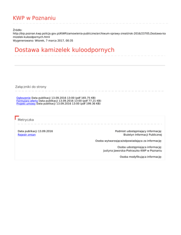 KWP w Poznaniu Źródło: http://bip.poznan.kwp.policja.gov.pl/KWP/zamowienia-publiczne/archiwum-sprawy-zreali/rok-2016/23705,Dostawa-ka mizelek-kuloodpornych.html Wygenerowano: Wtorek, 7 marca 2017, 00:35 Dostawa kamizelek kuloodpornych Załączniki do strony Ogłoszenie Data publikacji 13.09.2016 13:00 (pdf 165.75 KB) Formularz oferty Data publikacji 13.09.2016 13:00 (pdf 77.21 KB) Projekt umowy Data publikacji 13.09.2016 13:00 (pdf 199.36 KB) Metryczka Data publikacji 13.09.2016 Rejestr zmian Podmiot udostępniający informację: Biuletyn Informacji Publicznej Osoba wytwarzająca/odpowiadająca za informację: Osoba udostępniająca informację: Justyna Jaworska-Pietraszko KWP w Poznaniu Osoba modyfikująca informację: