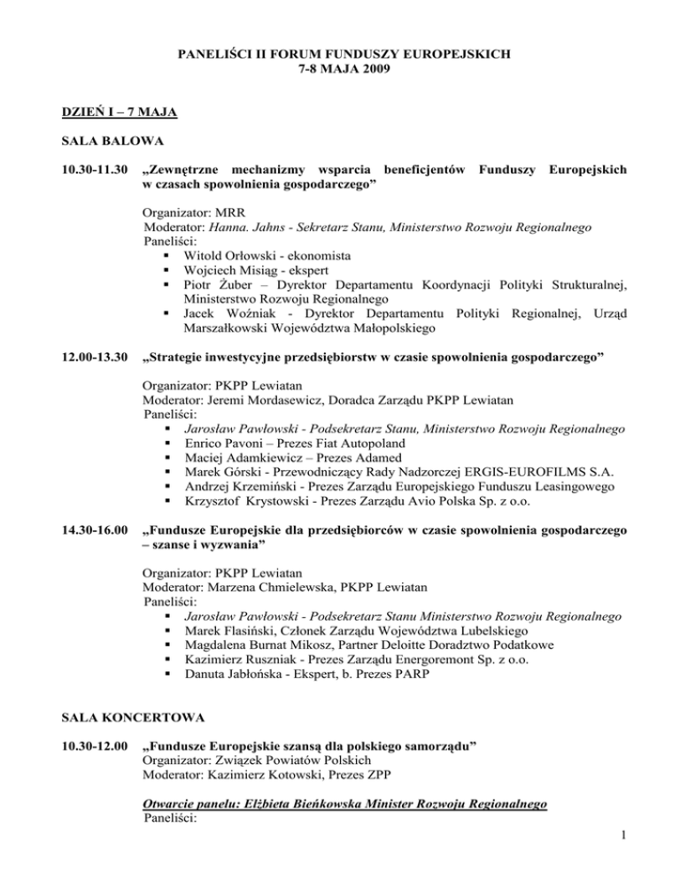 PANELIŚCI II FORUM FUNDUSZY EUROPEJSKICH 7-8 MAJA 2009 DZIEŃ I – 7 MAJA SALA BALOWA 10.30-11.30 „Zewnętrzne mechanizmy wsparcia beneficjentów Funduszy Europejskich w czasach spowolnienia gospodarczego” Organizator: MRR Moderator: Hanna. Jahns - Sekretarz Stanu, Ministerstwo Rozwoju Regionalnego Paneliści: Witold Orłowski - ekonomista Wojciech Misiąg - ekspert Piotr śuber – Dyrektor Departamentu Koordynacji Polityki Strukturalnej, Ministerstwo Rozwoju Regionalnego Jacek Woźniak - Dyrektor Departamentu Polityki Regionalnej, Urząd Marszałkowski Województwa Małopolskiego 12.00-13.30 „Strategie inwestycyjne przedsiębiorstw w czasie spowolnienia gospodarczego” Organizator: PKPP Lewiatan Moderator: Jeremi Mordasewicz, Doradca Zarządu PKPP Lewiatan Paneliści: Jarosław Pawłowski - Podsekretarz Stanu, Ministerstwo Rozwoju Regionalnego Enrico Pavoni – Prezes Fiat Autopoland Maciej Adamkiewicz – Prezes Adamed Marek Górski - Przewodniczący Rady Nadzorczej ERGIS-EUROFILMS S.A. Andrzej Krzemiński - Prezes Zarządu Europejskiego Funduszu Leasingowego Krzysztof Krystowski - Prezes Zarządu Avio Polska Sp. z o.o. 14.30-16.00 „Fundusze Europejskie dla przedsiębiorców w czasie spowolnienia gospodarczego – szanse i wyzwania” Organizator: PKPP Lewiatan Moderator: Marzena Chmielewska, PKPP Lewiatan Paneliści: Jarosław Pawłowski - Podsekretarz Stanu Ministerstwo Rozwoju Regionalnego Marek Flasiński, Członek Zarządu Województwa Lubelskiego Magdalena Burnat Mikosz, Partner Deloitte Doradztwo Podatkowe Kazimierz Ruszniak - Prezes Zarządu Energoremont Sp. z o.o. Danuta Jabłońska - Ekspert, b. Prezes PARP SALA KONCERTOWA 10.30-12.00 „Fundusze Europejskie szansą dla polskiego samorządu” Organizator: Związek Powiatów Polskich Moderator: Kazimierz Kotowski, Prezes ZPP Otwarcie panelu: ElŜbieta Bieńkowska Minister Rozwoju Regionalnego Paneliści: 1 12.00-12.30 12.30-14.00 Krzysztof Hetman - Podsekretarz Stanu Ministerstwo Rozwoju Regionalnego Włodzimierz Tomaszewski, Wiceprezydent Miasta Łodzi Krzysztof Garczyński – Urząd Marszałkowski Województwa Zachodniopomorskiego Marcin Głowacki Urząd Marszałkowski Województwa Zachodniopomorskiego Paweł Tomczak – Dyrektor Biura Związku Gmin Wiejskich RP Marek Sowa – Wicemarszałek Województwa Małopolskiego Przerwa kawowa „Praktyczne doświadczenia z wykorzystywania Funduszy Europejskich dla realizacji projektów infrastrukturalnych wpływających na rozwój lokalny” Organizator: Związek Powiatów Polskich Moderator: Rudolf Borusiewicz, Sekretarz Generalny ZPP Paneliści: Krzysztof Hetman - Podsekretarz Stanu Ministerstwo Rozwoju Regionalnego Grzegorz Mądry - ekspert Ludwik Węgrzyn – ekspert ZPP Marek Wójcik - Dyrektor Biura ZPP Marek Szemla - Wicestarosta bielski (powiat Bielsko-Biała) 14.00-14.45 Lunch 14.45-16.00 „MoŜliwości pozyskiwania Funduszy Europejskich na projekty infrastrukturalne kształtujące rozwój lokalny” - c.d. Organizator: Związek Powiatów Polskich Moderator: Rudolf Borusiewicz, Sekretarz Generalny ZPP Paneliści: Adam Zdziebło - Podsekretarz Stanu Ministerstwo Rozwoju Regionalnego Grzegorz Mądry - ekspert Ludwik Węgrzyn - ekspert ZPP Walentyna Gorbacz – Hajnówka Marek Wójcik, Dyrektor Biura ZPP ARKADY KUBICKIEGO 14.30-16.0 „Polska pięknieje. 7 cudów Funduszy Europejskich” - panel tematyczny Organizator: Smartlink Moderator: Iwona Gach (Pascal), Andrzej Szoszkiewicz (Smartlink) Prelegenci: Krystyna Wójcik – Dyrektor Centrum Wikliniarstwa, przedstawiciel laureata I edycji konkursu Jacek Thiel - Urząd Miejski w Wejherowie, przedstawiciel laureata I edycji konkursu Katie Foster - gość specjalny z Wielkiej Brytanii „Zauroczyć turystę, czyli skuteczna promocja w projektach turystycznych” 16.00-17.30 „Polska pięknieje. 7 cudów Funduszy Europejskich” – gala wręczenia nagród Moderator: Tomasz Zubilewicz – prezenter pogody w TVN 2 Wręczenie nagród: ElŜbieta Bieńkowska – Minister Rozwoju Regionalnego Prelegenci: Anita Noskowska-Piątkowska – Zastępca Dyrektora Departamentu Informacji, Promocji i Szkoleń, Ministerstwo Rozwoju Regionalnego Iwona Gach - Pascal Andrzej Szoszkiewicz - Smartlink POKÓJ MATEJKOWSKI 10.30 – 13.30 „European Territorial Cooperation (ETC) and European Neighborhood and Partnership Instrument (ENPI) Programmes In Visegrad Group” Organizator: MRR (DWT) Paneliści: Marcin Łata - Ministry of Regional Development of Poland Ewa Ślęzak - Joint Technical Secretariat Pl-Sk 2007-2013 CBC Programme Fojta Georgina - NDA - Managing Authority for International Co-operation Programmes Ágota Varga - NDA - Managing Authority for International Co-operation Programmes Monika Soboczynska - Ministry of Regional Development of the Czech Republic Jaroslava Vránová - Ministry of Regional Development of the Czech Republic Aneta KoŜuchowska - Ministry of Regional Development of Poland Teresa Marcinów - Ministry of Regional Development of Poland Agnieszka Kmiecik-Mikusek - Information Point East INTERREG IV C Bogdan Kasperek - The 'Olza' Assocation of Development and Regional Cooperation Joanna Herman - The 'Olza' Assocation of Development and Regional Cooperation Šárka Sikorová - Regional association of teritorial cooperation of Tesin Silesia Waldemar Serwiński - The Mayor of the Town of Muszyna BoŜena Szewczyk - Town of Muszyna Marcel Tribus - The Polish-Slovak house in Bardejov Zenon Stryjak - Association of Carpathian Euroregion Poland DZIEŃ II – 8 MAJA ARKADY KUBICKIEGO 10.00-10.20 Otwarcie i powitanie gości: Wystąpienie Premiera D. Tuska Wystąpienie Minister E. Bieńkowskiej 10.20-11.00 Gala wręczenia nagród laureatom konkursu EURO LIDER 2009 Wręczenie nagród: Minister E. Bieńkowska i Premier D. Tusk SALA BALOWA 3 11.30-13.00 „Fundusze Europejskie w dobie kryzysu światowego” Gospodarz: ElŜbieta Bieńkowska – Minister Rozwoju Regionalnego Organizator: MRR Moderator: Roman Młodkowski - d