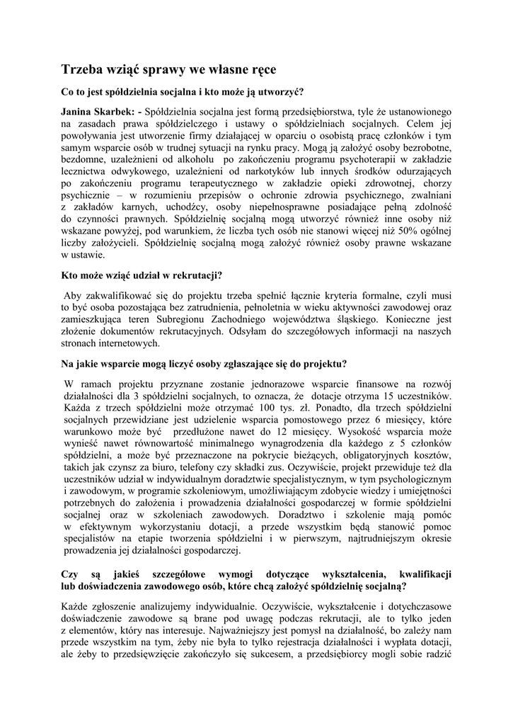 Trzeba wziąć sprawy we własne ręce Co to jest spółdzielnia socjalna i kto może ją utworzyć? Janina Skarbek: - Spółdzielnia socjalna jest formą przedsiębiorstwa, tyle że ustanowionego na zasadach prawa spółdzielczego i ustawy o spółdzielniach socjalnych. Celem jej powoływania jest utworzenie firmy działającej w oparciu o osobistą pracę członków i tym samym wsparcie osób w trudnej sytuacji na rynku pracy. Mogą ją założyć osoby bezrobotne, bezdomne, uzależnieni od alkoholu po zakończeniu programu psychoterapii w zakładzie lecznictwa odwykowego, uzależnieni od narkotyków lub innych środków odurzających po zakończeniu programu terapeutycznego w zakładzie opieki zdrowotnej, chorzy psychicznie – w rozumieniu przepisów o ochronie zdrowia psychicznego, zwalniani z zakładów karnych, uchodźcy, osoby niepełnosprawne posiadające pełną zdolność do czynności prawnych. Spółdzielnię socjalną mogą utworzyć również inne osoby niż wskazane powyżej, pod warunkiem, że liczba tych osób nie stanowi więcej niż 50% ogólnej liczby założycieli. Spółdzielnię socjalną mogą założyć również osoby prawne wskazane w ustawie. Kto może wziąć udział w rekrutacji? Aby zakwalifikować się do projektu trzeba spełnić łącznie kryteria formalne, czyli musi to być osoba pozostająca bez zatrudnienia, pełnoletnia w wieku aktywności zawodowej oraz zamieszkująca teren Subregionu Zachodniego województwa śląskiego. Konieczne jest złożenie dokumentów rekrutacyjnych. Odsyłam do szczegółowych informacji na naszych stronach internetowych. Na jakie wsparcie mogą liczyć osoby zgłaszające się do projektu? W ramach projektu przyznane zostanie jednorazowe wsparcie finansowe na rozwój działalności dla 3 spółdzielni socjalnych, to oznacza, że dotacje otrzyma 15 uczestników. Każda z trzech spółdzielni może otrzymać 100 tys. zł. Ponadto, dla trzech spółdzielni socjalnych przewidziane jest udzielenie wsparcia pomostowego przez 6 miesięcy, które warunkowo może być przedłużone nawet do 12 miesięcy. Wysokość wsparcia może wynieść nawet równowartość minimalnego wynagrodzenia dla każdego z 5 członków spółdzielni, a może być przeznaczone na pokrycie bieżących, obligatoryjnych kosztów, takich jak czynsz za biuro, telefony czy składki zus. Oczywiście, projekt przewiduje też dla uczestników udział w indywidualnym doradztwie specjalistycznym, w tym psychologicznym i zawodowym, w programie szkoleniowym, umożliwiającym zdobycie wiedzy i umiejętności potrzebnych do założenia i prowadzenia działalności gospodarczej w formie spółdzielni socjalnej oraz w szkoleniach zawodowych. Doradztwo i szkolenie mają pomóc w efektywnym wykorzystaniu dotacji, a przede wszystkim będą stanowić pomoc specjalistów na etapie tworzenia spółdzielni i w pierwszym, najtrudniejszym okresie prowadzenia jej działalności gospodarczej. Czy są jakieś szczegółowe wymogi dotyczące wykształcenia, kwalifikacji lub doświadczenia zawodowego osób, które chcą założyć spółdzielnię socjalną? Każde zgłoszenie analizujemy indywidualnie. Oczywiście, wykształcenie i dotychczasowe doświadczenie zawodowe są brane pod uwagę podczas rekrutacji, ale to tylko jeden z elementów, który nas interesuje. Najważniejszy jest pomysł na działalność, bo zależy nam przede wszystkim na tym, żeby nie była to tylko rejestracja działalności i wypłata dotacji, ale żeby to przedsięwzięcie zakończyło się sukcesem, a przedsiębiorcy mogli sobie radzić na rynku przez długie lata. Dlatego też spółdzielcy również po założeniu spółdzielni będą objęci wsparciem doradcy. Nie zamierzamy ich rzucać na głęboką wodę. Wiele osób obawia się ryzyka związanego z przyjmowaniem bezzwrotnych środków. Czy istnieją sytuacje, w których dotację trzeba zwrócić? Ryzyko przymusu zwrotu środków jest tak naprawdę bardzo małe. Najważniejszymi warunkami, które trzeba dopełnić jest wydanie środków zgodnie z umową oraz prowadzenie spółdzielni nieprzerwanie przez okres nie krótszy niż 12 miesięcy. Czy zatrudnienie w spółdzielni socjalnej odbywa się na tych samych zasadach, co w każdym innym przedsiębiorstwie? Stosunek pracy między spółdzielnią socjalną a jej członkiem nawiązuje się na podstawie spółdzielczej umowy o pracę. Część kosztów wynagrodzenia osób zatrudnionych w spółdzielni może podlegać refinansowaniu ze środków Funduszu Pracy. Dotyczy to niektórych składników wynagrodzenia osób uprawnionych do tworzenia spółdzielni socjalnej, o których mówiliśmy wcześniej. Okres refinansowania może trwać do 24 miesięcy od dnia zatrudnienia. Finansowanie realizowane jest na podstawie umowy zawartej ze starostą właściwym dla siedziby spółdzielni, a jego źródłem jest Fundusz Pracy. Jakie są zalety założenia spółdzielni socjalnej? Decydując się na założenie spółdzielni socjalnej możemy liczyć na duże wsparcie, zarówno finansowe, jak również doradcze. Niewielu przedsiębiorców na starcie swojej działalności może liczyć na tak dużą pomoc. Poza tym, tworząc spółdzielnię, działamy w grupie. Dzięki temu korzystamy z wiedzy i doświadczenia wszystkich osób, co jest pomocne zarówno na starcie, jak również w dalszej działalności. Spółdzielnia socjalna prowadzi nie tylko działalność gospodarczą, lecz również działa na rzecz swoich członków, przykładowo realizauje działania reintegracyjne, oświatowe, kulturalne. Koszt tej działalności pomniejsza podstawę opodatkowania. Spółdzielnia socjalna może korzystać z różnych form dodatkowego wsparcia, jak wspomniana wcześniej refundacja części wynagrodzenia. W związku z popularyzacją tej formy działalności, coraz częściej spółdzielnie spotykają się z przychylnym podejściem innych uczestników rynku, a także urzędników. Rośnie świadomość, że zawierając umowę
