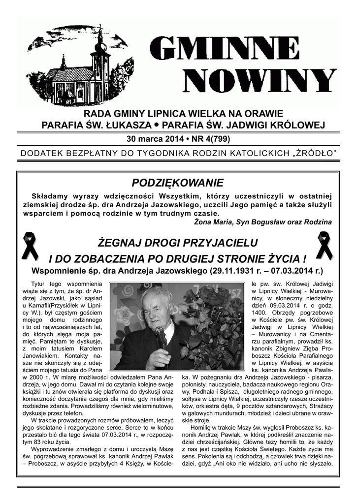 RADA GMINY LIPNICA WIELKA NA ORAWIE PARAFIA ŚW. ŁUKASZA • PARAFIA ŚW. JADWIGI KRÓLOWEJ 30 marca 2014 • NR 4(799) DODATEK BEZPŁATNY DO TYGODNIKA RODZIN KATOLICKICH „ŹRÓDŁO” PODZIĘKOWANIE Składamy wyrazy wdzięczności Wszystkim, którzy uczestniczyli w ostatniej ziemskiej drodze śp. dra Andrzeja Jazowskiego, uczcili Jego pamięć a także służyli wsparciem i pomocą rodzinie w tym trudnym czasie. Żona Maria, Syn Bogusław oraz Rodzina ŻEGNAJ DROGI PRZYJACIELU I DO ZOBACZENIA PO DRUGIEJ STRONIE ŻYCIA ! Wspomnienie śp. dra Andrzeja Jazowskiego (29.11.1931 r. – 07.03.2014 r.) Tytuł tego wspomnienia wiąże się z tym, że śp. dr Andrzej Jazowski, jako sąsiad u Karnafli(Przysiółek w Lipnicy W.), był częstym gościem mojego domu rodzinnego i to od najwcześniejszych lat, do których sięga moja pamięć. Pamiętam te dyskusje, z moim tatusiem Karolem Janowiakiem. Kontakty nasze nie skończyły się z odejściem mojego tatusia do Pana w 2000 r.. W miarę możliwości odwiedzałem Pana Andrzeja, w jego domu. Dawał mi do czytania kolejne swoje książki i tu znów otwierała się platforma do dyskusji oraz konieczność doczytania czegoś dla mnie, gdy mieliśmy rozbieżne zdania. Prowadziliśmy również wielominutowe, dyskusje przez telefon. W trakcie prowadzonych rozmów próbowałem, leczyć jego skołatane i rozgoryczone serce. Serce to w końcu przestało bić dla tego świata 07.03.2014 r., w rozpoczętym 83 roku życia. Wyprowadzenie zmarłego z domu i uroczystą Mszę św. pogrzebową sprawował ks. kanonik Andrzej Pawlak – Proboszcz, w asyście przybyłych 4 Księży, w Koście- le pw. św. Królowej Jadwigi w Lipnicy Wielkiej - Murowanicy, w słoneczny niedzielny dzień 09.03.2014 r. o godz. 1400. Obrzędy pogrzebowe w Kościele pw. św. Królowej Jadwigi w Lipnicy Wielkiej – Murowanicy i na Cmentarzu parafialnym, prowadził ks. kanonik Zbigniew Zięba Proboszcz Kościoła Parafialnego w Lipnicy Wielkiej, w asyście ks. kanonika Andrzeja Pawlaka. W pożegnaniu dra Andrzeja Jazowskiego - pisarza, polonisty, nauczyciela, badacza naukowego regionu Orawy, Podhala i Spisza, długoletniego radnego gminnego, sołtysa w Lipnicy Wielkiej, uczestniczyły rzesze uczestników, orkiestra dęta, 9 pocztów sztandarowych, Strażacy w galowych mundurach, młodzież i dzieci ubrane w orawskie stroje. Homilię w trakcie Mszy św. wygłosił Proboszcz ks. kanonik Andrzej Pawlak, w której podkreślił znaczenie nadziei chrześcijańskiej. Główne tezy homilii to, że każdy z nas jest cząstką Kościoła Świętego. Każde życie ma sens. Pokolenia są i odchodzą, a człowiek trwa dzięki nadziei, gdyż „Ani oko nie widziało, ani ucho nie słyszało, 30 marca 2014 GMINNE NOWINY ani serce człowieka nie zdołało pojąć, jak wielkie rzeczy Pan Bóg przygotował dla tych, którzy Go miłują”. Gromadzi nas tutaj nadzieja, że śp. Andrzej zasnął w Jezusie. Nie pozwalajmy, by szatan powoli pozbawiał nas nadziei. Niech nadzieja pomoże nam otrzeć łzy, które cisną się do oczu, gdy żegnamy zmarłego śp. dra Andrzeja Jazowskiego. Kończąc homilię ks. Proboszcz stwierdził „nie wierz w człowieka, lecz w Boga, gdy Cię ktoś gorszy to módl się za niego”. Zabierając głos w Kościele pw. św. Królowej Jadwigi, ks. Jan Karlak Proboszcz Parafii pw. JPII Na równi Szaflarskiej w Nowym Targu, dziękował zmarłemu za uczenie nas piękna języka polskiego i literatury. Dziękując Bogu za zmarłego, który poświęcił się kultywowaniu kultury orawskiej. Podziękowania te składał w imieniu tych, którzy nie mogli przybyć, by pożegnać zmarłego, m.in. w imieniu ks. Jana Pelczarskiego, który w tej sprawie dzwonił z Boliwii. Przewodniczący Rady Gminy Lipnica Wielka - Mariusz Wnenk poinformował o obecności Starosty z Polski i Słowacji oraz Posła RP Edwarda Siarki. W zmarłym żegnamy: człowieka upartego, który nie poddawał się, pisarza, społecznika działającego w Radzie Gminy, Sołtysa i odznaczonego ostatnio za swoją działalność m.in. medalem NR 4(799)/ Gloria Artis i Laurem Babiogórskim. Kończąc stwierdził „ Nie umiera ten, który trwa w sercach i pamięci naszej”. Julian Stopka dziękował zmarłemu za pokazanie nam, że poezja i proza mogą być pisane zarówno gwarą i językiem polskim. Poinformował, że zmarły, jeszcze w 1982 roku ukończył studia podyplomowe w zakresie filologii polskiej na Uniwersytecie Jagiellońskim w Krakowie oraz o odznaczeniach, które mu przyznano, za szerzenie kultury orawskiej. Zakończył słowami św. Pawła „ W dobrych zawodach wystąpiłem, bieg ukończyłem, wiary ustrzegłem. Na ostatek odłożono dla mnie wieniec sprawiedliwości, który mi w owym dniu odda Pan, sprawiedliwy Sędzia, a nie tylko mnie, ale wszystkim, którzy umiłowali pojawienie się Jego” Na Cmentarzu Parafialnym Augustyn Słaby w imieniu Rady Parafialnej stwierdził: dr Andrzej Jazowski uczył nas jak należy kochać własną ziemie. Ziemia, bowiem powinna rodzić, i dlatego gazdował. Zaangażował się w działanie Rady Gminy, gdzie zabierał głos, by ulżyć swoim wyborcom, których reprezentował, podobnie jak całej Gminie. Przewodniczył organizowanym konkursom literackim i artystycznym. Za wszystko, co dla nas zdziałałeś, niech Cię przytuli i lekką Ci będzie ta lipnicka ziemia. Odpoczywaj w Pokoju! Dzieciństwo i młodość zmarłego Dr Andrzej Jazowski urodził się w Lipnicy Wielkiej 29 listopada 1931 roku, w rodzinie chłopskiej. W pamiętniku opublikowanym w części zatytułowanej „Na krawędzi życia i śmierci”, w wydaniu „Od dziejów Środkowych Słowian do Orawy, Podhala i Spisza (2004)”, na której się oparłem pisząc poniższe czytamy. ... Z mojego rodzeństwa utrzymało się przy życiu: dwóch braci, Wendelin i Ignacy, oraz siostra Genowefa. Jedna z sióstr, Weronika już, jako kilkuletnia, zmarła obok mnie w łóżku, w czasie działań frontowych w okresie II wojny św