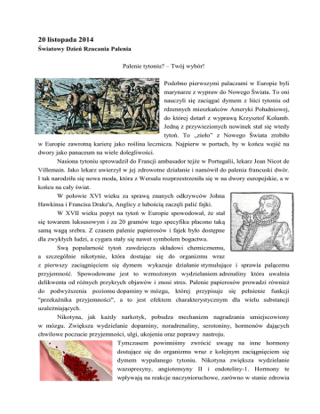 20 listopada 2014 Światowy Dzień Rzucania Palenia Palenie tytoniu? – Twój wybór! Podobno pierwszymi palaczami w Europie byli marynarze z wypraw do Nowego Świata. To oni nauczyli się zaciągać dymem z liści tytoniu od rdzennych mieszkańców Ameryki Południowej, do której dotarł z wyprawą Krzysztof Kolumb. Jedną z przywiezionych nowinek stał się wtedy tytoń. To „zioło” z Nowego Świata zrobiło w Europie zawrotną karierę jako roślina lecznicza. Najpierw w portach, by w końcu wejść na dwory jako panaceum na wiele dolegliwości. Nasiona tytoniu sprowadził do Francji ambasador tejże w Portugalii, lekarz Jean Nicot de Villemain. Jako lekarz uwierzył w jej zdrowotne działanie i namówił do palenia francuski dwór. I tak narodziła się nowa moda, która z Wersalu rozprzestrzeniła się w na dwory europejskie, a w końcu na cały świat. W połowie XVI wieku za sprawą znanych odkrywców Johna Hawkinsa i Francisa Drake'a, Anglicy z lubością zaczęli palić fajki. W XVII wieku popyt na tytoń w Europie spowodował, że stał się towarem luksusowym i za 20 gramów tego specyfiku płacono taką samą wagą srebra. Z czasem palenie papierosów i fajek było dostępne dla zwykłych ludzi, a cygara stały się nawet symbolem bogactwa. Swą popularność tytoń zawdzięcza składowi chemicznemu, a szczególnie nikotynie, która dostając się do organizmu wraz z pierwszy zaciągnięciem się dymem wykazuje działanie stymulujące i sprawia palącemu przyjemność. Spowodowane jest to wzmożonym wydzielaniem adrenaliny która uwalnia delikwenta od różnych przykrych objawów i znosi stres. Palenie papierosów prowadzi również do podwyższenia poziomu dopaminy w mózgu, której przypisuje się pełnienie funkcji "przekaźnika przyjemności", a to jest efektem charakterystycznym dla wielu substancji uzależniających. Nikotyna, jak każdy narkotyk, pobudza mechanizm nagradzania umiejscowiony w mózgu. Zwiększa wydzielanie dopaminy, noradrenaliny, serotoniny, hormonów dających chwilowe poczucie przyjemności, ulgi, ukojenia oraz poprawy nastroju. Tymczasem powinniśmy zwrócić uwagę na inne hormony dostające się do organizmu wraz z kolejnym zaciągnięciem się dymem wypalanego tytoniu. Nikotyna zwiększa wydzielanie wazopresyny, angiotensyny II i endoteliny-1. Hormony te wpływają na reakcje naczynioruchowe, zarówno w stanie zdrowia jaki w chorobach układu sercowo-naczyniowego, odpowiadają za właściwe napięcie naczyń, regulują ciśnienie krwi, odpowiadają za częstość bicia serca, regulują homeostazę wodnoelektrolitową organizmu, mogą uczestniczyć w rozwoju zmian miażdżycowych. Choć wciąż jeszcze jeden palacz na czterech skraca swoje życie o 20 lat i umiera przed 65 rokiem życia, choć osoby palące często bagatelizują niebezpieczeństwa, jakie niesie ze sobą uzależnienie od papierosów i tracą mnóstwo pieniędzy na kolejne paczki papierosów, szybciej się starzeją, mają nieświeży oddech, tytoniowy zapach ubrań, choć pojawia się szereg komplikacji zdrowotnych, rośnie ryzyko zachorowania na nowotwory i chorobę niedokrwienną serca, nadciśnienie tętnicze, udar mózgu i miażdżycę to i tak po raz pierwszy od 500 lat przychodzi do nas moda na niepalenie. Iwona Budrewicz OZiPZ PSSE w Kamieniu Pomorskim