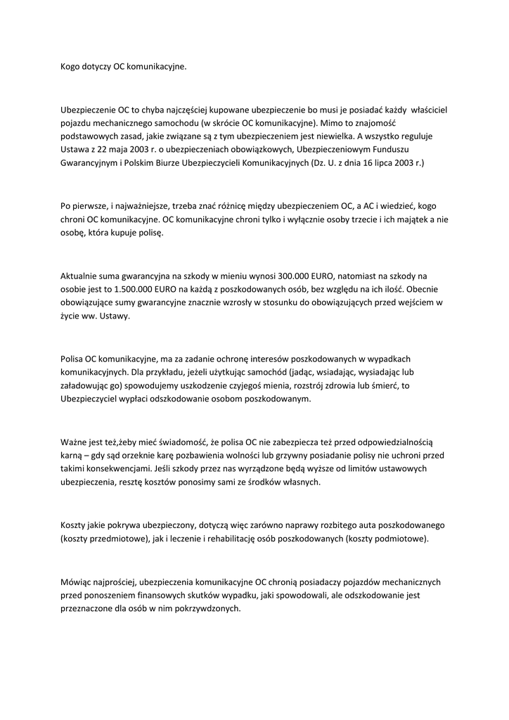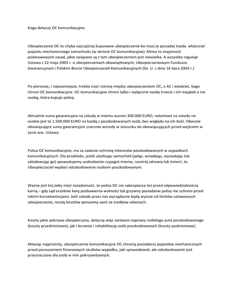 Kogo dotyczy OC komunikacyjne. Ubezpieczenie OC to chyba najczęściej kupowane ubezpieczenie bo musi je posiadać każdy właściciel pojazdu mechanicznego samochodu (w skrócie OC komunikacyjne). Mimo to znajomość podstawowych zasad, jakie związane są z tym ubezpieczeniem jest niewielka. A wszystko reguluje Ustawa z 22 maja 2003 r. o ubezpieczeniach obowiązkowych, Ubezpieczeniowym Funduszu Gwarancyjnym i Polskim Biurze Ubezpieczycieli Komunikacyjnych (Dz. U. z dnia 16 lipca 2003 r.) Po pierwsze, i najważniejsze, trzeba znać różnicę między ubezpieczeniem OC, a AC i wiedzieć, kogo chroni OC komunikacyjne. OC komunikacyjne chroni tylko i wyłącznie osoby trzecie i ich majątek a nie osobę, która kupuje polisę. Aktualnie suma gwarancyjna na szkody w mieniu wynosi 300.000 EURO, natomiast na szkody na osobie jest to 1.500.000 EURO na każdą z poszkodowanych osób, bez względu na ich ilość. Obecnie obowiązujące sumy gwarancyjne znacznie wzrosły w stosunku do obowiązujących przed wejściem w życie ww. Ustawy. Polisa OC komunikacyjne, ma za zadanie ochronę interesów poszkodowanych w wypadkach komunikacyjnych. Dla przykładu, jeżeli użytkując samochód (jadąc, wsiadając, wysiadając lub załadowując go) spowodujemy uszkodzenie czyjegoś mienia, rozstrój zdrowia lub śmierć, to Ubezpieczyciel wypłaci odszkodowanie osobom poszkodowanym. Ważne jest też,żeby mieć świadomość, że polisa OC nie zabezpiecza też przed odpowiedzialnością karną – gdy sąd orzeknie karę pozbawienia wolności lub grzywny posiadanie polisy nie uchroni przed takimi konsekwencjami. Jeśli szkody przez nas wyrządzone będą wyższe od limitów ustawowych ubezpieczenia, resztę kosztów ponosimy sami ze środków własnych. Koszty jakie pokrywa ubezpieczony, dotyczą więc zarówno naprawy rozbitego auta poszkodowanego (koszty przedmiotowe), jak i leczenie i rehabilitację osób poszkodowanych (koszty podmiotowe). Mówiąc najprościej, ubezpieczenia komunikacyjne OC chronią posiadaczy pojazdów mechanicznych przed ponoszeniem finansowych skutków wypadku, jaki spowodowali, ale odszkodowanie jest przeznaczone dla osób w nim pokrzywdzonych.