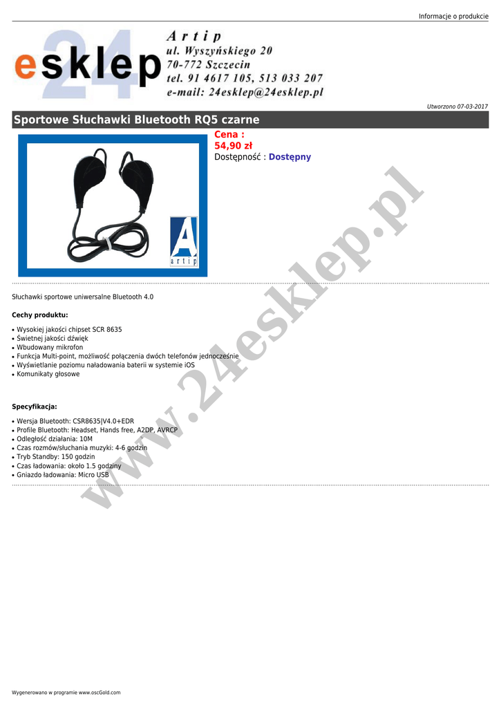 Informacje o produkcie Utworzono 07-03-2017 Sportowe Słuchawki Bluetooth RQ5 czarne Cena : 54,90 zł le p. p l Dostępność : Dostępny sk Słuchawki sportowe uniwersalne Bluetooth 4.0 Cechy produktu: ● ● ● ● Wysokiej jakości chipset SCR 8635 Świetnej jakości dźwięk Wbudowany mikrofon Funkcja Multi-point, możliwość połączenia dwóch telefonów jednocześnie Wyświetlanie poziomu naładowania baterii w systemie iOS Komunikaty głosowe 4e ● .2 ● Specyfikacja: ● ● ● ● ● w ● Wersja Bluetooth: CSR8635|V4.0+EDR Profile Bluetooth: Headset, Hands free, A2DP, AVRCP Odległość działania: 10M Czas rozmów/słuchania muzyki: 4-6 godzin Tryb Standby: 150 godzin Czas ładowania: około 1.5 godziny Gniazdo ładowania: Micro USB w w ● Wygenerowano w programie www.oscGold.com