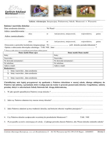 Ankieta rekrutacyjna Integracyjnej Podstawowej Szkoły Montessori w Warszawie Imiona i nazwisko dziecka: ……………………………………………………………………………………… Data urodzenia dziecka :………………………. Nr Pesel : ………………………………………………………. Adres zameldowania : ………………………………………………………………………………………….... ulica nr kod pocztowy, miejscowość, województwo, gmina Adres zamieszkania : ……………………………………………………………………………………………………………………... ulica nr kod pocztowy, miejscowość, województwo, gmina Orzeczenie o potrzebie kształcenia integracyjnego Nr : .................................., jeśli dziecko posiada dokument * Opinia o odroczeniu obowiązku szkolnego : TAK/ NIE , Inne : ………………………………………………… * * Dotyczy tylko dzieci ze szczególnymi potrzebami edukacyjnymi Dane matki Dane ojca Imię : Nazwisko : Nr dowodu tożsamości : Nr telefonu Adres e-mail: Rodzeństwo : 1. Imię i nazwisko , data urodzenia 2. Imię i nazwisko , data urodzenia Dane matki Dane matki Imię : Nazwisko : Nr dowodu tożsamości : Nr telefonu Adres e-mail: 3. Imię i nazwisko , data urodzenia Chcielibyśmy móc lepiej przygotować się spotkania z Państwa dzieckiem w naszej szkole, dlatego oddajemy do Państwa rąk ankietę, z pytaniami, które wydają nam się ważne w procesie poznawania dziecka. Uzupełnioną ankietę prosimy złożyć w sekretariacie Szkoły listownie lub drogą elektroniczną. 1. W jaki sposób opisalibyście Państwo swoje dziecko ? ………………………………………………………………….. ……………………………………………………………………………………………………………………………. 2. Jakie są Państwa zdaniem trzy mocne strony dziecka? …………………………………………………………………. ............................................................................................................................................................................................. 3. Jakie Państwa zdaniem są trzy trudności dziecka, nad którymi obecnie wspólnie pracujecie ? ………………………… ……………………………………………………………………………………………………………………………. 4. Czy Państwa dziecko uczęszczało wcześniej do przedszkola Montessori ? TAK / NIE 5. W przypadku uczniów zmieniających szkołę : Z jakiego powodu chcecie Państwo, aby Wasze dziecko zmieniło szkołę? ……………………………………………………………………………………….......................................................... Centrum Aktywnego Rozwoju sp. z o.o. ul. Brzoskwiniowa 31 04-782 Warszawa nip 952-199-35-05 Regon : 140460055 Strona 1 6. Skąd dowiedzieliście się Państwo o metodzie Montessori : ……………………………………………………………………………………………………………………………... 7. Skąd dowiedzieliście się Państwo o Integracyjnej Podstawowej Szkole Montessori : a) od znajomych, których dziecko uczęszcza(ło) do przedszkola/szkoły Montessori b) poszukiwała(e)m informacji o Montessori w internecie c) poszukując szkoły, trafiła(e)m na stronę internetową szkoły d) inne ……………………………………………………………………………………………............................... 8. Co jest dla Państwa ważne w edukacji Waszego dziecka? Wymieńcie Wasze oczekiwania … ……………………………………………………………………………………………………………………………... ………………………………………………………………………………………………………................................... 9. Co w metodzie Montessori zachęciło Państwa do wyboru szkoły? ………………………………………………………………………………………………………...………………………... 10. Dlaczego uważacie Państwo, że szkoła Montessori zaspokoi potrzeby Waszego dziecka? …………………………………………………………………………………………………………………………….......... ……………………………………………………………………………………………………….......................................... 11. Jak myślicie Państwo, co będzie największym wyzwaniem dla Waszej rodziny, w momencie podjęcia edukacji przez Państwa dziecko w systemie Montessori ? a)…………………………………………..……… b) …………………………………..……………… c)…………………………………………..…….... d) …………………………………..……………... 12. Co Państwa najbardziej zastanawia lub niepokoi w metodzie Montessori ? ……………………………………………………………………………………………………….......................................... …………………………………………………………………………………………………………………………………... 12. Czego jeszcze chcielibyście się Państwo dowiedzieć od nas o edukacji w systemie Montessori ? ……………………………………………………………………………………………………….......................................... …………………………………………………………………………………………………………………………………... 13. Wymieńcie sześć cech, którymi chcielibyście Państwo, aby cechowała się szkoła Państ