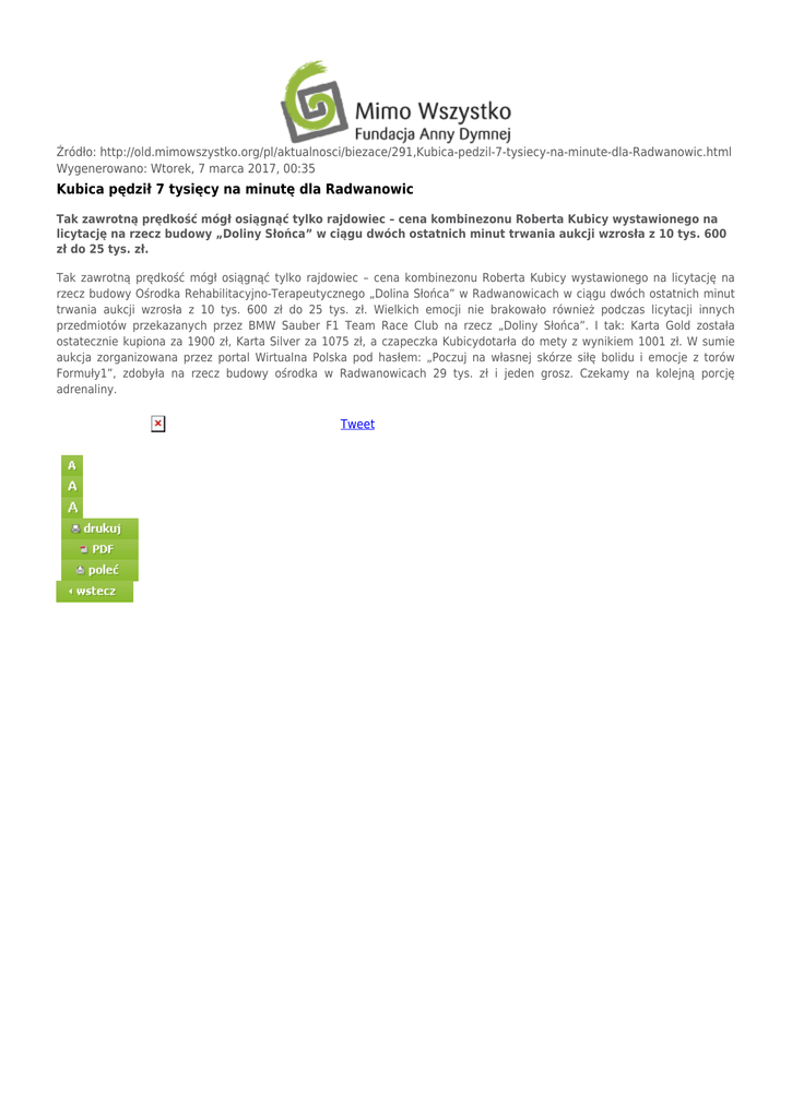 Źródło: http://old.mimowszystko.org/pl/aktualnosci/biezace/291,Kubica-pedzil-7-tysiecy-na-minute-dla-Radwanowic.html Wygenerowano: Wtorek, 7 marca 2017, 00:35 Kubica pędził 7 tysięcy na minutę dla Radwanowic Tak zawrotną prędkość mógł osiągnąć tylko rajdowiec – cena kombinezonu Roberta Kubicy wystawionego na licytację na rzecz budowy „Doliny Słońca” w ciągu dwóch ostatnich minut trwania aukcji wzrosła z 10 tys. 600 zł do 25 tys. zł. Tak zawrotną prędkość mógł osiągnąć tylko rajdowiec – cena kombinezonu Roberta Kubicy wystawionego na licytację na rzecz budowy Ośrodka Rehabilitacyjno-Terapeutycznego „Dolina Słońca” w Radwanowicach w ciągu dwóch ostatnich minut trwania aukcji wzrosła z 10 tys. 600 zł do 25 tys. zł. Wielkich emocji nie brakowało również podczas licytacji innych przedmiotów przekazanych przez BMW Sauber F1 Team Race Club na rzecz „Doliny Słońca”. I tak: Karta Gold została ostatecznie kupiona za 1900 zł, Karta Silver za 1075 zł, a czapeczka Kubicydotarła do mety z wynikiem 1001 zł. W sumie aukcja zorganizowana przez portal Wirtualna Polska pod hasłem: „Poczuj na własnej skórze siłę bolidu i emocje z torów Formuły1”, zdobyła na rzecz budowy ośrodka w Radwanowicach 29 tys. zł i jeden grosz. Czekamy na kolejną porcję adrenaliny. Tweet