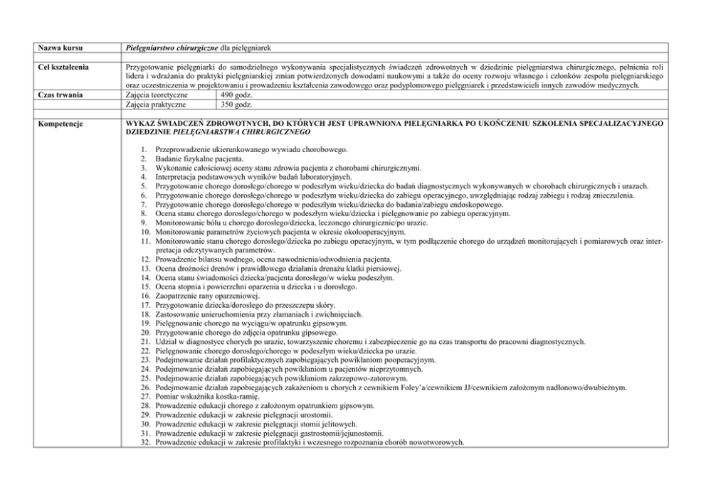 Nazwa kursu Pielęgniarstwo chirurgiczne dla pielęgniarek Cel kształcenia Przygotowanie pielęgniarki do samodzielnego wykonywania specjalistycznych świadczeń zdrowotnych w dziedzinie pielęgniarstwa chirurgicznego, pełnienia roli lidera i wdrażania do praktyki pielęgniarskiej zmian potwierdzonych dowodami naukowymi a także do oceny rozwoju własnego i członków zespołu pielęgniarskiego oraz uczestniczenia w projektowaniu i prowadzeniu kształcenia zawodowego oraz podyplomowego pielęgniarek i przedstawicieli innych zawodów medycznych. Zajęcia teoretyczne 490 godz. Zajęcia praktyczne 350 godz. Czas trwania Kompetencje WYKAZ ŚWIADCZEŃ ZDROWOTNYCH, DO KTÓRYCH JEST UPRAWNIONA PIELĘGNIARKA PO UKOŃCZENIU SZKOLENIA SPECJALIZACYJNEGO DZIEDZINIE PIELĘGNIARSTWA CHIRURGICZNEGO 1. 2. 3. 4. 5. 6. 7. 8. 9. 10. 11. 12. 13. 14. 15. 16. 17. 18. 19. 20. 21. 22. 23. 24. 25. 26. 27. 28. 29. 30. 31. 32. Przeprowadzenie ukierunkowanego wywiadu chorobowego. Badanie fizykalne pacjenta. Wykonanie całościowej oceny stanu zdrowia pacjenta z chorobami chirurgicznymi. Interpretacja podstawowych wyników badań laboratoryjnych. Przygotowanie chorego dorosłego/chorego w podeszłym wieku/dziecka do badań diagnostycznych wykonywanych w chorobach chirurgicznych i urazach. Przygotowanie chorego dorosłego/chorego w podeszłym wieku/dziecka do zabiegu operacyjnego, uwzględniając rodzaj zabiegu i rodzaj znieczulenia. Przygotowanie chorego dorosłego/chorego w podeszłym wieku/dziecka do badania/zabiegu endoskopowego. Ocena stanu chorego dorosłego/chorego w podeszłym wieku/dziecka i pielęgnowanie po zabiegu operacyjnym. Monitorowanie bólu u chorego dorosłego/dziecka, leczonego chirurgicznie/po urazie. Monitorowanie parametrów życiowych pacjenta w okresie okołooperacyjnym. Monitorowanie stanu chorego dorosłego/dziecka po zabiegu operacyjnym, w tym podłączenie chorego do urządzeń monitorujących i pomiarowych oraz interpretacja odczytywanych parametrów. Prowadzenie bilansu wodnego, ocena nawodnienia/odwodnienia pacjenta. Ocena drożności drenów i prawidłowego działania drenażu klatki piersiowej. Ocena stanu świadomości dziecka/pacjenta dorosłego/w wieku podeszłym. Ocena stopnia i powierzchni oparzenia u dziecka i u dorosłego. Zaopatrzenie rany oparzeniowej. Przygotowanie dziecka/dorosłego do przeszczepu skóry. Zastosowanie unieruchomienia przy złamaniach i zwichnięciach. Pielęgnowanie chorego na wyciągu/w opatrunku gipsowym. Przygotowanie chorego do zdjęcia opatrunku gipsowego. Udział w diagnostyce chorych po urazie, towarzyszenie choremu i zabezpieczenie go na czas transportu do pracowni diagnostycznych. Pielęgnowanie chorego dorosłego/chorego w podeszłym wieku/dziecka po urazie. Podejmowanie działań profilaktycznych zapobiegających powikłaniom pooperacyjnym. Podejmowanie działań zapobiegających powikłaniom u pacjentów nieprzytomnych. Podejmowanie działań zapobiegających powikłaniom zakrzepowo-zatorowym. Podejmowanie działań zapobiegających zakażeniom u chorych z cewnikiem Foley’a/cewnikiem JJ/cewnikiem założonym nadłonowo/dwubieżnym. Pomiar wskaźnika kostka-ramię. Prowadzenie edukacji chorego z założonym opatrunkiem gipsowym. Prowadzenie edukacji w zakresie pielęgnacji urostomii. Prowadzenie edukacji w zakresie pielęgnacji stomii jelitowych. Prowadzenie edukacji w zakresie pielęgnacji gastrostomii/jejunostomii. Prowadzenie edukacji w zakresie profilaktyki i wczesnego rozpoznania chorób nowotworowych. 33. 34. 35. 36. 37. 38. 39. 40. 41. 42. 43. 44. 45. 46. 47. 48. 49. 50. 51. 52. 53. 54. 55. 56. 57. 58. 59. 60. 61. 62. 63. 64. 65. 66. 67. 68. 69. 70. 71. 72. 73. 74. Prowadzenie usprawniania ruchowego (siadanie, pionizacja, nauka chodzenia, nauka samoobsługi) u chorych w okresie okołooperacyjnym. Usprawnianie ruchowe chorych po amputacji kończyny. Stosowanie kompresjoterapii. Ocena rany owrzodzeniowej, pomiar powierzchni rany i jej zaopatrzenie. Dobór i stosowanie nowoczesnych opatrunków specjalistycznych do zaopatrywania ran w zależności od fazy gojenia się rany. Stosowanie profilaktyki przeciwodleżynowej. Stosowanie rehabilitacji oddechowej. Cewnikowanie pęcherza moczowego. Założenie/wymiana cewnika do cystostomii. Zdjęcie szwów z rany. Zmiana opatrunku na ranie pooperacyjnej. Ocena stanu odżywienia chorego. Pielęgnowanie chorego z gastrostomią/jejunostomią. Pielęgnowanie chorego z cewnikiem założonym do żyły centralnej. Monitorowanie stanu chorego z całkowitym żywieniem pozajelitowym. Zapobieganie powikłaniom żywienia enteralnego i parenteralnego. Edukowanie chorego/dziecka i jego rodziny/opiekunów w zakresie postępowania w domu po leczeniu szpitalnym. Ocena stanu pacjenta w celu ustalenia postępowania i podjęcia decyzji o prowadzeniu lub odstąpieniu od medycznych czynności ratunkowych. Układanie pacjenta w pozycji właściwej dla jego stanu zdrowia lub odniesionych obrażeń. Podjęcie i prowadzenie podstawowej i zaawansowanej resuscytacji krążeniowo oddechowej u dorosłych i dzieci zgodnie z obowiązującymi wytycznymi Polskiej Rady Resuscytacji. Bezprzyrządowe przywracanie drożności dróg oddechowych. Przyrządowe przywracanie drożności dróg oddechowych z zastosowaniem: rurki ustnogardłowej, rurki nosowo-gardłowej, maski krtaniowej, rurki krtaniowej. Wykonanie intubacji dotchawiczej w laryngoskopii bezpośredniej w nagłym zatrzymaniu krążenia przez usta lub przez nos bez użycia środków zwiotczających mięśnie. Odsysanie dróg oddechowych metodą otwartą i zamkniętą. Stosowanie tlenoterapii biernej. Stosowanie wspomagania oddechu za pomocą worka samorozprężalnego. Stosowanie tlenoterapii czynnej przy użyciu maski twarzowej, worka samorozprężalnego z zastawką jednokierunkową lub z użyciem respiratora. Wykonanie defibrylacji zautomatyzowanej. Wykonanie defibrylacji ręcznej na podstawie EKG. Wykonanie badania elektrokardiograficznego. Monitorowanie czynności układu od
