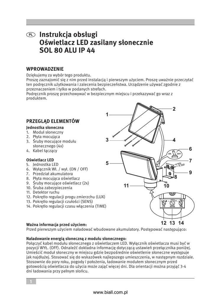 Instrukcja obsługi Oświetlacz LED zasilany słonecznie SOL 80 ALU IP 44 WPROWADZENIE Dziękujemy za wybór tego produktu. Proszę zaznajomić się z nim przed instalacją i pierwszym użyciem. Proszę uważnie przeczytać ten podręcznik użytkowania i zalecenia bezpieczeństwa. Urządzenie używać zgodnie z przeznaczeniem i tylko w podanych strefach. Podręcznik proszę przechowywać w bezpiecznym miejscu i przekazywać go wraz z produktem. 2 1 PRZEGLĄD ELEMENTÓW Jednostka słoneczna 1. Moduł słoneczny 2. Płyta mocująca 3. Śruby mocujące modułu słonecznego (4x) 4. Kabel łączący 3 4 6 ON Oświetlacz LED 5 5. Jednostka LED 6. Wyłącznik Wł. / wył. (ON / OFF) 7. Przedział akumulatora 8. Płyta mocująca oświetlacz 9. Śruby mocujące oświetlacz (2x) 10. Śruba zabezpieczenia 11. Detektor ruchu 12. Pokrętło regulacji progu zmierzchu (LUX) 13. Pokrętło regulacji czułości (SENS) 14. Pokrętło regulacji czasu włączenia (TIME) OFF 7 9 8 11 10 LUX SENS TIME 12 13 14 Ważna informacja przed użyciem: Przed pierwszym użyciem naładować wbudowane akumulatory. Postępować następująco: Naładowanie energią słoneczną z modułu słonecznego: Połączyć kabel modułu słonecznego z oświetlaczem LED. Wyłącznik oświetlacza musi być w pozycji WYŁ. (OFF). Odnaleźć dokładna informację dotyczącą ustawień przełącznika poniżej. Umieścić moduł słoneczny w miejscu gdzie bezpośrednie oświetlenie słoneczne występuje jak najdłużej. Stosować się do wskazówek najlepszego umieszczenia, w następnym rozdziale. Stosownie do pory roku, pogody i położenia, ładowanie modułem słonecznym przed gotowością oświetlacza do użycia może zająć więcej dni. Dla orientacji można przyjąć 3-4 dni ładowania przy pełnym słońcu. 1 www.biall.com.pl Instrukcja obsługi SOL 80 ALU IP 44 Ewentualne ładowanie z ładowarki zewnętrznej: Przed pierwszym użyciem można naładować urządzenie z odpowiedniej ładowarki (nie dostarczana). Wyjąć akumulatory z oświetlacza i ładować bezpośrednio w ładowarce. Sprawdzić dane techniczne ładowarki. Ładowarka musi być odpowiednia do ładowania akumulatorów NiMH (AA/ 1,2 V / 2200 mAgodz.). WSKAZÓWKI INSTALACJI MODUŁU SŁONECZNEGO I OŚWIETLACZA SOUTH SOUTH Rysunek A (Południe) Rysunek B (Południe) Oświetlacz LED: Oświetlacz składa się z oprawy z 8-mioma LEDami, obudowy z przedziałem na akumulator i obrotowego detektora ruchu. Przy wyborze miejsca instalacji pamiętać o strefie wykrywania przez detektor. Detektor ruchu ma zasięg 10 m i kątowo 130° horyzontalnie, w temperaturze otoczenia 25 °C. Zalecana wysokość instalacji wynosi 2 m do 2,5 m nad podłogą. Zainstalować na odpowiedniej powierzchni płytę montażową oświetlacza, dostarczonymi wkrętami. Umieścić oświetlacz na płycie mocującej i zabezpieczyć śrubą zabezpieczającą (patrz rysunek A). Moduł słoneczny: Moduł słoneczny przetwarza promieniowaną energię słońca na energię elektryczną. Przyjazna środowisku energia słoneczna ładuje akumulatory i pozwala na użycie oświetlacza niezależnie od sieci zasilania. Proszę pamiętać, że miejsce zainstalowania modułu słonecznego wymaga, dla optymalnego działania, bezpośredniego naświetlenia słonecznego. Jeśli możliwe, nie umieszczać modułu słonecznego w cieniu i nakierować go na południe. W Europie środkowej zalecany jest kąt nachylenia około 30°. To także umożliwia w pewnym stopniu samooczyszczanie się od liści pyłu i śniegu, przy wietrze i deszczu. Zainstalować moduł słoneczny dostarczonymi wkrętami do solidnej powierzchni. Ustawić odpowiednio kąt nachylenia wspornikiem mocującym (patrz rysunki A i B). Ustawić właściwy kierunek modułu słonecznego. 2 www.biall.com.pl Instrukcja obsługi SOL 80 ALU IP 44 USTAWIENIE I PRACA Po pomyślnej instalacji połączyć kabel modułu słonecznego z oświetlaczem. Oświetlacz LED zasilany słonecznie jest teraz gotów do użytku. Ważne: Proszę pamiętać o naładowaniu akumulatorów przed pierwszym użyciem oświetlacza. Wyłącznik musi być w położeniu WYŁ. (OFF). Ładowanie modułem słonecznym trwa około 3-4 dni słoneczne. USTAWIENIA WYŁĄCZNIKÓW: Na górze obudowy oświetlacza znajduje się wyłącznik główny o dwóch możliwych położeniach (Rysunek C): WŁĄCZONY (ON): Położenie przy włączeniu. Akumulatory są ładowane przez moduł słoneczny, oświetlacz jest włączany detektorem ruchu. OFF - WYŁĄCZONY: Oświetlacz i detektor ruchu są wyłączone, działa ładowanie akumulatora z modułu słonecznego. Położenie w trakcie dostawy i zalecane przy długim okresie nie używania. Położenie przełącznika w trakcie szybkiego ładowania akumulatora, bez włączenia oświetlacza. ON OFF Rysunek C DETEKTOR RUCHU Jest to bierny czujnik podczerwieni, wykrywania ruchu, polegającego na zmianach promieniowania cieplnego w chronionej strefie, włączającego / wyłączającego oświetlacz. Po początkowym naładowaniu ustawić wyłącznik główny w położeniu ON. Obrócić detektor ruchu, dla uzyskania dostępu do pokręteł regulacji (patrz rysunek D). LUX SENS TIME Rysunek D 3 www.biall.com.pl Instrukcja obsługi SOL 80 ALU IP 44 POKRĘTŁA REGULACJI TIME / SENS / LUX 1. TIME = Czas włączenia światła Ustawić czas włączenia oświetlacza, po wykryciu ruchu w strefie wykrywania, pomiędzy 10 a 60 sekund. Obracanie pokrętła TIME w kierunku (+) zwiększa czas włączenia a w kierunku (–) zmniejsza czas włączenia. Uwaga: Ustawiony czas włączenia rozpoczyna się od wyzwolenia detektora ruchu. Po wykryciu następnego ruchu w trybie aktywnego oświetlacza, czas jest odliczany ponownie. Wykrycie ruchu jest sygnalizowane przez czerwony wskaźnik detektora ruchu. 2. SENS = Czułość Temperatura otoczenia ma wpływ na czułość detektora ruchu. Im temperatura otoczenia jest niższa, tym bardziej detektor ruchu jest czuły. Aby dopasować się do zmieniającej temperatu