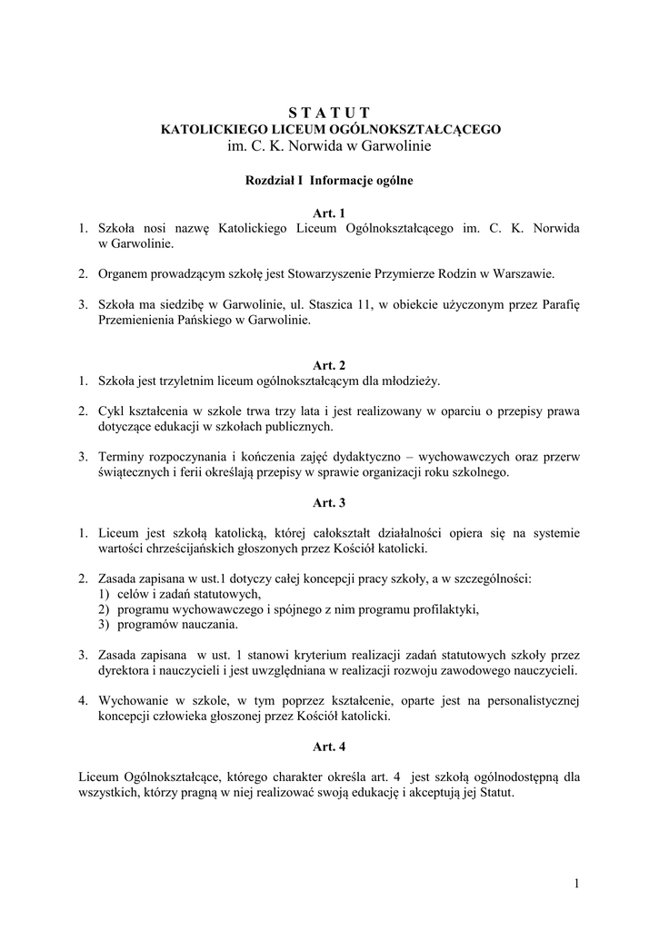 STATUT KATOLICKIEGO LICEUM OGÓLNOKSZTAŁCĄCEGO im. C. K. Norwida w Garwolinie Rozdział I Informacje ogólne Art. 1 1. Szkoła nosi nazwę Katolickiego Liceum Ogólnokształcącego im. C. K. Norwida w Garwolinie. 2. Organem prowadzącym szkołę jest Stowarzyszenie Przymierze Rodzin w Warszawie. 3. Szkoła ma siedzibę w Garwolinie, ul. Staszica 11, w obiekcie użyczonym przez Parafię Przemienienia Pańskiego w Garwolinie. Art. 2 1. Szkoła jest trzyletnim liceum ogólnokształcącym dla młodzieży. 2. Cykl kształcenia w szkole trwa trzy lata i jest realizowany w oparciu o przepisy prawa dotyczące edukacji w szkołach publicznych. 3. Terminy rozpoczynania i kończenia zajęć dydaktyczno – wychowawczych oraz przerw świątecznych i ferii określają przepisy w sprawie organizacji roku szkolnego. Art. 3 1. Liceum jest szkołą katolicką, której całokształt działalności opiera się na systemie wartości chrześcijańskich głoszonych przez Kościół katolicki. 2. Zasada zapisana w ust.1 dotyczy całej koncepcji pracy szkoły, a w szczególności: 1) celów i zadań statutowych, 2) programu wychowawczego i spójnego z nim programu profilaktyki, 3) programów nauczania. 3. Zasada zapisana w ust. 1 stanowi kryterium realizacji zadań statutowych szkoły przez dyrektora i nauczycieli i jest uwzględniana w realizacji rozwoju zawodowego nauczycieli. 4. Wychowanie w szkole, w tym poprzez kształcenie, oparte jest na personalistycznej koncepcji człowieka głoszonej przez Kościół katolicki. Art. 4 Liceum Ogólnokształcące, którego charakter określa art. 4 jest szkołą ogólnodostępną dla wszystkich, którzy pragną w niej realizować swoją edukację i akceptują jej Statut. 1 Art. 5 Liceum Ogólnokształcące zapewnia: 1) bezpłatne nauczanie w zakresie ramowych planów nauczania, 2) rekrutację uczniów w oparciu o zasadę powszechnej dostępności, 3) zatrudnianie nauczycieli posiadających kwalifikacje określone w odrębnych przepisach 4) realizację: programów nauczania zawierających podstawę programową kształcenia ogólnego, ramowego planu nauczania , zasad oceniania, klasyfikowania i promowania oraz zasad przeprowadzania egzaminów ustalonych przez Ministra Edukacji Narodowej. Art. 6 Nadzór pedagogiczny nad szkołą sprawuje (np. Mazowiecki Kurator Oświaty w Warszawie). Rozdział II Cele i zadania szkoły Cele i zadania wynikające z charakteru wychowawczego szkoły Art. 7 1. Podstawowym celem szkoły jest wspieranie integralnego rozwoju młodzieży – w procesie wychowania, nauczania i opieki, określonym dla liceum ogólnokształcącego, realizowanym według koncepcji zapisanej w art. 4 Statutu. 2. Szkoła wychowuje uczniów do odpowiedzialności za własny rozwój oraz do odpowiedzialności za innych, za dobro wspólne w życiu rodzinnym i społecznym. Art. 8 1. Zasady i wartości chrześcijańskie stanowią fundament procesu wychowawczego opisanego szczegółowo w programie wychowawczym i spójnym z nim programie profilaktyki, są uwzględniane w programach kształcenia i mają być ukazywane przykładem życia przede wszystkim przez nauczycieli i osoby pełniące funkcje kierownicze w szkole. 2. Proces wychowawczy i formacyjny w szkole opiera się na relacji osób: nauczyciela i ucznia, nauczycieli między sobą, dyrektora i nauczycieli. Art. 9 1. Kształcenie w szkole jest częścią szeroko rozumianego wychowania. Jego istotą jest wspomaganie rozwoju ucznia w kierunku stawania się w pełni osobą i oznacza przede wszystkim rozwijanie: 1) podmiotowości, 2) odpowiedzialności, 3) umiejętności dokonywania wyborów i przyjmowania ich konsekwencji, 4) poczucia własnej godności, 5) możliwości twórczych, 6) potrzeby i poczucia sensu, równocześnie przekraczanie siebie w kierunku bycia „z drugimi” i „dla drugich”. 2. W procesie rozwoju ucznia nauczyciel przyjmuje rolę osoby życzliwie i z szacunkiem dla wychowanka: 1) instruującej go, 2) kierującej, współdziałającej i towarzyszącej w dążeniu do prawdy, 2 3) modelującej własnym przykładem, 4) odwołującej się przede wszystkim do dialogu, wiarygodnych źródeł i przykładów. 3. Szkoła wspiera wszechstronny rozwój osobowy ucznia, w szczególności w sferach: 1) dojrzewania intelektualnego, 2) dojrzewania emocjonalnego, 3) dojrzewania moralnego, 4) dojrzewania woli, 5) dojrzewania społecznego. 4. Szkoła wspiera rozwój religijny uczniów, który stanowi źródło motywacji do podejmowania wysiłku własnego rozwoju. Wrażliwość i otwartość na wartości wyznawane, odkrywane i realizowane - warunkuje wzrastanie w dojrzałości osobowej zarówno wychowanków, jak i wychowawców. Art. 10 W szkole podejmowane są stałe działania i wysiłki budowania jej charakteru wychowawczego opartego na fundamencie Ewangelii. Jednocześnie szkoła jest otwarta na przyjmowanie uczniów wyznających inną religię, poszukujących i nie wyznających żadnej religii, którzy wybierają tę szkołę jako miejsce swej edukacji. Szanując ich przekonania, szkoła zapewnia wszystkim wychowanie do wzajemnego szacunku, pokoju i współpracy – w klimacie chrześcijańskiej otwartości i miłości. Uczniowie ci mają obowiązek uczestniczenia w pełni w procesie wychowania i nauczania obowiązującym w szkole. Art. 11 1. Nauka religii katolickiej i katecheza stanowi fundament edukacji w szkole. 2. Nauka religii jest organizowana w ramach planu zajęć dla wszystkich uczniów. Uczniowie niewierzący lub wyznający inną religię korzystają z przysługującej im wolności sumienia i wyznania w zakresie praktyk religijnych poza szkołą. Art. 12 1. Środowisko wychowawcze szkoły - jako wspólnoty - tworzą wszyscy jej członkowie: nauczyciele, młodzież i rodzice uczniów. 2. Szkoła wspiera rodziców jako pierwszych wychowawców swoich dzieci i stara się o współpracę z nimi prowadzącą do osiągania spójności wychowawczej. Cele i zadania szkoły wynikające z prawa Art. 13 1. Realizują