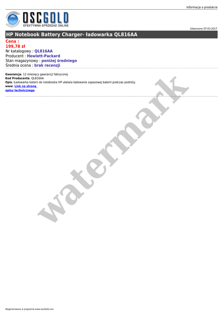 Informacje o produkcie Utworzono 07-03-2017 HP Notebook Battery Charger- ładowarka QL816AA Cena : 199,78 zł Nr katalogowy : QL816AA Producent : Hewlett-Packard Stan magazynowy : poniżej średniego Średnia ocena : brak recenzji w at er m ar k Gwarancja: 12 miesięcy gwarancji fabrycznej Kod Producenta: QL816AA Opis: Ładowarka baterii do notebooka HP ułatwia ładowanie zapasowej baterii podczas podróży. www: Link na stronę opisu technicznego Wygenerowano w programie www.oscGold.com