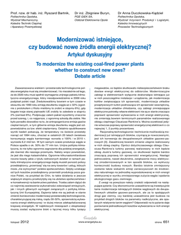 Prof. nzw. dr hab. inż. Ryszard Bartnik, Dr inż. Zbigniew Buryn, Dr Anna Duczkowska-Kądziel Politechnika Opolska, Wydział Mechaniczny, Katedra Techniki Cieplnej i Aparatury Przemysłowej PGE GiEK SA, Oddział Elektrownia Opole Politechnika Opolska, Wydział Inżynierii Produkcji i Logistyki, Katedra Innowacyjnych Procesów Technologicznych Modernizować istniejące, czy budować nowe źródła energii elektrycznej? Artykuł dyskusyjny To modernize the existing coal-fired power plants whether to construct new ones? Debate article Zaawansowana wiekiem i przestarzała technologicznie polska energetyka musi się zmodernizować. I to niezależnie od tego, że do 2020 roku musi spełnić wymagania unijnego pakietu klimatyczno-energetycznego, który nieodpowiedzialnie w 2008 roku podpisał polski rząd. Zredukowaliśmy bowiem w tym czasie w stosunku do 1990 roku emisję dwutlenku węgla aż o 32% (zgodnie z protokołem z Kioto mieliśmy to zrobić w stopniu 6%), gdy bogate kraje starej piętnastki UE zrobiły to zaledwie w stopniu 2% (zamiast 8%). Podpisując zatem pakiet wyszliśmy znacznie przed szereg, i, co najgorsze, z ogromną szkodą dla siebie. Nie było ponadto dowodów na to, że antropogeniczna emisja gazów cieplarnianych, w tym głównie emisja dwutlenku węgla jest odpowiedzialna za tzw. efekt cieplarniany. Ostatnio opublikowane wyniki badań pokazują, że temperatury na świecie przestały rosnąć od 1994 roku, chociaż w ostatnich 20 latach światowa konsumpcja węgla kamiennego wzrosła o 100% i w 2010 r. wyniosła 6,2 mld ton. W tym samym czasie produkcja węgla w Polsce spadła o ok. 50% do 77 mln ton. Unijna polityka klimatyczna, to nie tylko ogromne zagrożenie dla polskiej energetyki, ale również dla naszego przemysłu. Należy wręcz powiedzieć, że jest dla niego katastrofalna. Ogromne kilkunastomiliardowe roczne koszty jakie z tytułu wdrożonych działań w ramach pakietu klimatyczno-energetycznego będą musieli ponosić polscy przedsiębiorcy „przeniosą” się na ceny towarów i usług, których może „nie wytrzymać” polskie społeczeństwo. Gdyby uciekając od tych kosztów przedsiębiorcy przenieśli produkcję poza granice Polski, na przykład do Chin, to takie działania w jeszcze większym stopniu przełożyłyby się na ubóstwo społeczeństwa i w konsekwencji na bankructwo państwa. Trzeba zatem dążyć do co najmniej zawieszenia wykonalności zobowiązań emisyjnych, jak i innych głównych wymagań związanych z polityką klimatyczną Unii Europejskiej. Dążenia takie nie są jednak w stanie zmienić konieczności modernizacji przestarzałej technologicznie, charakteryzującej się niską, rzędu 30-32%, sprawnością wytwarzania energii elektrycznej i w dużej mierze zdekapitalizowanej krajowej energetyki. W najbliższych miesiącach z eksploatacji muszą zostać wyłączone bloki o łącznej mocy kilku tysięcy listopad 2012 megawatów, co będzie skutkowało niebezpieczeństwem braku dostaw energii elektrycznej do odbiorców. Modernizacyjne zabiegi w elektrowniach wyłącznie doskonalące istniejące już w nich poszczególne instalacje i urządzenia, jak modernizacja kotłów zwiększająca ich sprawność, modernizacja układów przepływowych turbin podnosząca ich sprawność wewnętrzną, modernizacja układów chłodzenia, czy zabiegi zmniejszające elektryczne potrzeby własne elektrowni nie są w stanie znacząco poprawić sprawności wytwarzania w nich energii elektrycznej, nie zmieniają bowiem termicznych parametrów realizowanego obiegu cieplnego Clausiusa-Rankine’a. Można oczekiwać jedynie wówczas poprawy sprawności energetycznej elektrowni o co najwyżej 1, 2 punkty procentowe. Racjonalną technologicznie i technicznie możliwością modernizacji już istniejących bloków, czyniącą je nowoczesnymi, jest ich konwersja do dwupaliwowych układów gazowo-parowych [3]. Zasadniczej bowiem zmianie ulegnie realizowany w nich obieg cieplny. Oprócz dotychczasowego obiegu Clausiusa-Rankine’a turbiny parowej realizowany w nich będzie obieg Joule’a turbiny gazowej, co skutkować będzie bardzo znaczącą poprawą ich sprawności energetycznej. Nastąpi jednocześnie, nawet dwukrotne, zwiększenie mocy elektrycznej zmodernizowanych w ten sposób bloków, co wykluczy konieczność budowy nowych. Bardzo istotnie zmniejszony zostanie także wskaźnik emisji zanieczyszczeń do środowiska naturalnego na jednostkę wyprodukowanej w nich energii elektrycznej w wyniku zmniejszonego zużycia węgla i spalania ekologicznego gazu ziemnego. Z uwagi na powyższe należy znaleźć odpowiedź na następujące pytanie. Czy ekonomicznie uzasadnione są inwestycyjnie tanie modernizacje istniejących bloków węglowych do dwupaliwowych układów gazowo-parowych, ale za to spalających drogi gaz ziemny, czy bardziej uzasadniona jest budowa na przykład drogich bloków na parametry nadkrytyczne, ale opalanych relatywnie tanim węglem? Odpowiedź na to pytanie daje porównanie jednostkowych kosztów wytwarzania w nich energii elektrycznej. www.energetyka.eu strona 651 Jednostkowy koszt produkcji energii elektrycznej w elektrowni • nakłady inwestycyjne Jednostkowy koszt wytwarzania energii elektrycznej w elektrowni wyraża się równaniem [1, 2] (1) gdzie Eel,R oznacza roczną produkcję netto w niej energii elektrycznej, KR całkowity roczny koszt działania elektrowni będący sumą kosztów eksploatacji (operacyjnych) Ke i kapitałowych Kkap. Roczne koszty eksploatacji Ke elektrowni obejmują: koszt paliwa oraz koszt energii elektrycznej zużywanej na potrzeby własne Kpal, koszt wody uzupełniającej Kwu, koszt płac z narzutami Kpłac, koszt konserwacji i remontów Krem, koszt surowców nieenergetycznych i materiałów pomocniczych Km, koszt za gospodarcze korzystanie ze środowiska Kśr (m.in. opłaty za emisję spalin do atmosfery, odprowadzanie ścieków, składowanie odpadów itp.), koszt podatków, opłat i ubezpieczeń KP (7) g
