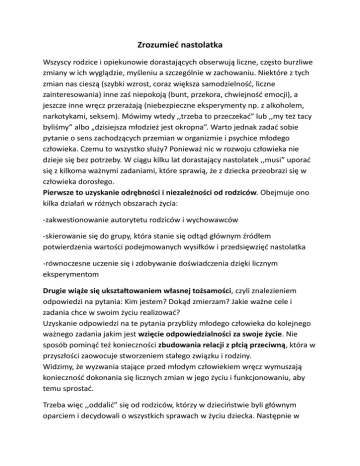 Zrozumieć nastolatka Wszyscy rodzice i opiekunowie dorastających obserwują liczne, często burzliwe zmiany w ich wyglądzie, myśleniu a szczególnie w zachowaniu. Niektóre z tych zmian nas cieszą (szybki wzrost, coraz większa samodzielność, liczne zainteresowania) inne zaś niepokoją (bunt, przekora, chwiejność emocji), a jeszcze inne wręcz przerażają (niebezpieczne eksperymenty np. z alkoholem, narkotykami, seksem). Mówimy wtedy ,,trzeba to przeczekać” lub ,,my też tacy byliśmy” albo „dzisiejsza młodzież jest okropna”. Warto jednak zadać sobie pytanie o sens zachodzących przemian w organizmie i psychice młodego człowieka. Czemu to wszystko służy? Ponieważ nic w rozwoju człowieka nie dzieje się bez potrzeby. W ciągu kilku lat dorastający nastolatek ,,musi” uporać się z kilkoma ważnymi zadaniami, które sprawią, że z dziecka przeobrazi się w człowieka dorosłego. Pierwsze to uzyskanie odrębności i niezależności od rodziców. Obejmuje ono kilka działań w różnych obszarach życia: -zakwestionowanie autorytetu rodziców i wychowawców -skierowanie się do grupy, która stanie się odtąd głównym źródłem potwierdzenia wartości podejmowanych wysiłków i przedsięwzięć nastolatka -równoczesne uczenie się i zdobywanie doświadczenia dzięki licznym eksperymentom Drugie wiąże się ukształtowaniem własnej tożsamości, czyli znalezieniem odpowiedzi na pytania: Kim jestem? Dokąd zmierzam? Jakie ważne cele i zadania chce w swoim życiu realizować? Uzyskanie odpowiedzi na te pytania przybliży młodego człowieka do kolejnego ważnego zadania jakim jest wzięcie odpowiedzialności za swoje życie. Nie sposób pominąć też konieczności zbudowania relacji z płcią przeciwną, która w przyszłości zaowocuje stworzeniem stałego związku i rodziny. Widzimy, że wyzwania stające przed młodym człowiekiem wręcz wymuszają konieczność dokonania się licznych zmian w jego życiu i funkcjonowaniu, aby temu sprostać. Trzeba więc ,,oddalić” się od rodziców, którzy w dzieciństwie byli głównym oparciem i decydowali o wszystkich sprawach w życiu dziecka. Następnie w towarzystwie innych młodych ludzi ukształtować własne opinie o świecie, o tym jakimi chcemy być ludźmi i co chcemy w życiu osiągnąć. Równocześnie zdobywając poczucie mocy i wiary, że damy radę udźwignąć ciężar samodzielnego życia. Nie jest to łatwe zadanie w czasach niepewności na rynku pracy, agresywnej rywalizacji i przymusu bycia najlepszym. Zdarza się, że młody człowiek nie czuje się jeszcze gotów do wejścia na ten „ring” i podejmuje mnóstwo różnych działań, nie zawsze dla dorosłych zrozumiałych (np. opuszcza się w nauce, zaczyna chorować), aby ten moment jeszcze trochę opóźnić. Stopień burzliwości tego okresu i możliwość, pojawienia się różnych zaburzeń i nieprawidłowości zależy też w dużym stopniu od ukształtowanych w dzieciństwie umiejętności i zasobów młodzieży oraz od jakości relacji i działań wychowawczych podejmowanych przez rodziców i wychowawców. Opracowała: Regina Strulak