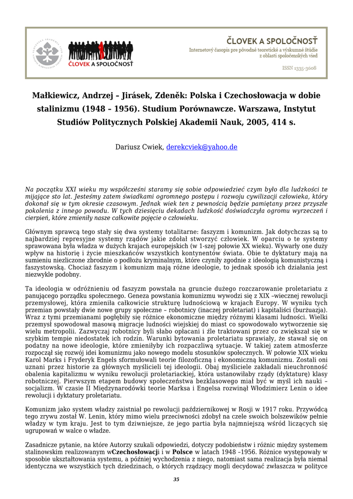 Małkiewicz, Andrzej – Jirásek, Zdeněk: Polska i Czechosłowacja w dobie stalinizmu (1948 – 1956). Studium Porównawcze. Warszawa, Instytut Studiów Politycznych Polskiej Akademii Nauk, 2005, 414 s. Dariusz Cwiek, [email protected] Na początku XXI wieku my współcześni staramy się sobie odpowiedzieć czym było dla ludzkości te mijające sto lat. Jesteśmy zatem świadkami ogromnego postępu i rozwoju cywilizacji człowieka, który dokonał się w tym okresie czasowym. Jednak wiek ten z pewnością będzie pamiętany przez przyszłe pokolenia z innego powodu. W tych dziesięciu dekadach ludzkość doświadczyła ogromu wyrzeczeń i cierpień, które zmieniły nasze całkowite pojęcie o człowieku. Głównym sprawcą tego stały się dwa systemy totalitarne: faszyzm i komunizm. Jak dotychczas są to najbardziej represyjne systemy rządów jakie zdołał stworzyć człowiek. W oparciu o te systemy sprawowana była władza w dużych krajach europejskich (w 1-szej połowie XX wieku). Wywarły one duży wpływ na historię i życie mieszkańców wszystkich kontynentów świata. Obie te dyktatury mają na sumieniu niezliczone zbrodnie o podłożu kryminalnym, które czyniły zgodnie z ideologią komunistyczną i faszystowską. Chociaż faszyzm i komunizm mają różne ideologie, to jednak sposób ich działania jest niezwykle podobny. Ta ideologia w odróżnieniu od faszyzm powstała na gruncie dużego rozczarowanie proletariatu z panującego porządku społecznego. Geneza powstania komunizmu wywodzi się z XIX –wiecznej rewolucji przemysłowej, która zmieniła całkowicie strukturę ludnościową w krajach Europy. W wyniku tych przemian powstały dwie nowe grupy społeczne – robotnicy (inaczej proletariat) i kapitaliści (burżuazja). Wraz z tymi przemianami pogłębiły się różnice ekonomiczne między różnymi klasami ludności. Wielki przemysł spowodował masową migracje ludności wiejskiej do miast co spowodowało wytworzenie się wielu metropolii. Zazwyczaj robotnicy byli słabo opłacani i źle traktowani przez co zwiększał się w szybkim tempie niedostatek ich rodzin. Warunki bytowania proletariatu sprawiały, że stawał się on podatny na nowe ideologie, które zmieniłyby ich rozpaczliwą sytuacje. W takiej zatem atmosferze rozpoczął się rozwój idei komunizmu jako nowego modelu stosunków społecznych. W połowie XIX wieku Karol Marks i Fryderyk Engels sformułowali teorie filozoficzną i ekonomiczną komunizmu. Zostali oni uznani przez historie za głównych myślicieli tej ideologii. Obaj myśliciele zakładali nieuchronność obalenia kapitalizmu w wyniku rewolucji proletariackiej, która ustanowiłaby rządy (dyktaturę) klasy robotniczej. Pierwszym etapem budowy społeczeństwa bezklasowego miał być w myśl ich nauki – socjalizm. W czasie II Międzynarodówki teorie Marksa i Engelsa rozwinął Włodzimierz Lenin o idee rewolucji i dyktatury proletariatu. Komunizm jako system władzy zaistniał po rewolucji październikowej w Rosji w 1917 roku. Przywódcą tego zrywu został W. Lenin, który mimo wielu przeciwności zdobył na czele swoich bolszewików pełnie władzy w tym kraju. Jest to tym dziwniejsze, że jego partia była najmniejszą wśród liczących się ugrupowań w walce o władze. Zasadnicze pytanie, na które Autorzy szukali odpowiedzi, dotyczy podobieństw i różnic między systemem stalinowskim realizowanym wCzechosłowacji i w Polsce w latach 1948 –1956. Różnice występowały w sposobie ukształtowania systemu, a później wychodzenia z niego, natomiast sama realizacja była niemal identyczna we wszystkich tych dziedzinach, o których rządzący mogli decydować zwłaszcza w polityce 35 gospodarczej, kulturalnej, działaniu instytucji państwa i partii. Różnice, w sumie niewielkie, pojawiały się w kwestiach, na które nie mieli wpływu, lub mieli tylko pośrednio, przede wszystkim takich jak: skład narodowy społeczeństw, opór społeczny, postawy duchowieństwa, kompetencje i jakość pracy aparatu partyjnego, państwowego i gospodarczego. Różnice wynikały też z uwarunkowań historycznych i ze zróżnicowanej początkowo polityki ZSRR wobec obu państw. Od 1948 r. do 1953 r. uległy one zmniejszeniu. Od 1954 r. zaczęły ponownie narastać, szczególnie w dziedzinach takich jak działalność aparatów przemocy, kultura i sposób działania kierownictwa partyjnego, które w Polsce podzieliło się na grupy o różnych koncepcjach, podczas gdy w Czechosłowacji pozostało jednolite. Przypomnijmy rzecz z pozoru tylko oczywistą. Wszystkie narody, nie tylko naród Polski, wybierają, choć nie zawsze w sposób w pełni uświadomiony, te składniki historycznej tradycji, które chcą kontynuować. Do skarbnicy przeszłości sięga się z reguły po to, by wydobywać z niej rzeczy cenne, budzące dumę, przede wszystkim dumę narodową, rezygnując, a nawet odrzucając epizody czy wręcz całe okresy, wywołujące rumieniec wstydu, godne jedynie potępienia. Problem polega na tym, że polska historyczna świadomość, wytrwale i konsekwentnie zatruwana przez cały czas funkcjonowania PRL, po dzień dzisiejszy nie była w stanie w sposób skuteczny się oczyścić. Co gorsza, nieśmiałym i nieskutecznym próbom zmiany istniejącego stanu rzeczy przez kolejnych 15 lat towarzyszyły działania, które z zupełnie odmiennych przesłanek ideowych, w imię swoiście pojmowanej „nowoczesności“ doprowadziły do wytworzenia nowych, kto wie, czy nie groźniejszych w finalnych skutkach spustoszeń. W całkowicie zmienionych, przede wszystkim geopolitycznie, warunkach, w nowym już tysiącleciu, pułapki czyhające na polską zbiorową pamięć istnieją nadal, choć przybierają znacznie bardziej powabną, pociągającą postać. Nie oznacza to, iż zatrute ziarno, posiane w peerelowskiej dobie, nie wydaje już swych owoców. Czas PRL, co z wielu powodów jest zrozumiałe, budzi rozmaite resentymenty i tęsknoty, które przen