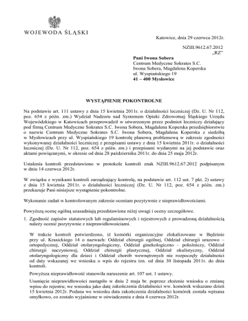 Wystąpienie pokontrolne:Centrum Medyczne Sokrates S.C. Iwona